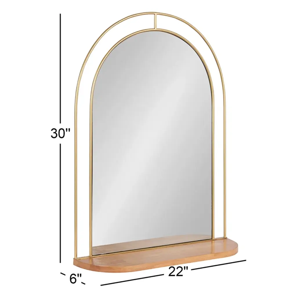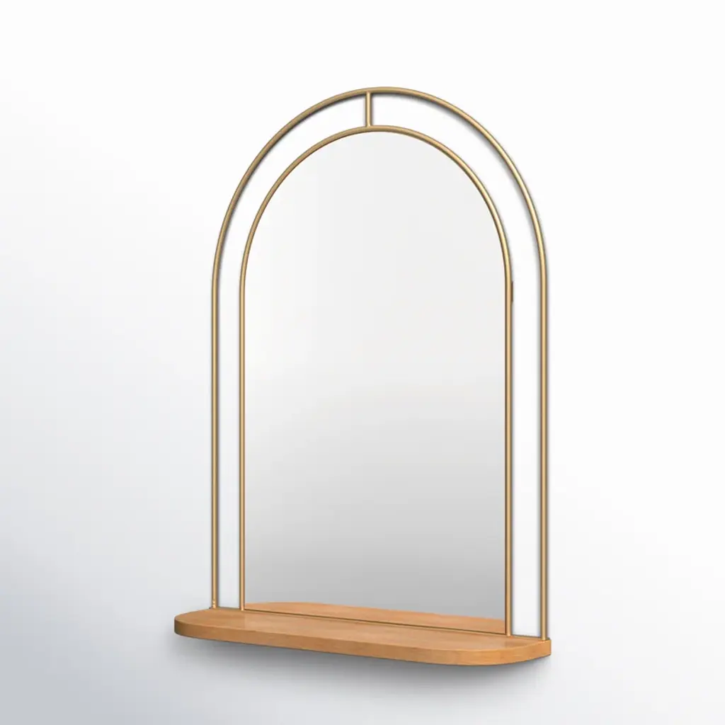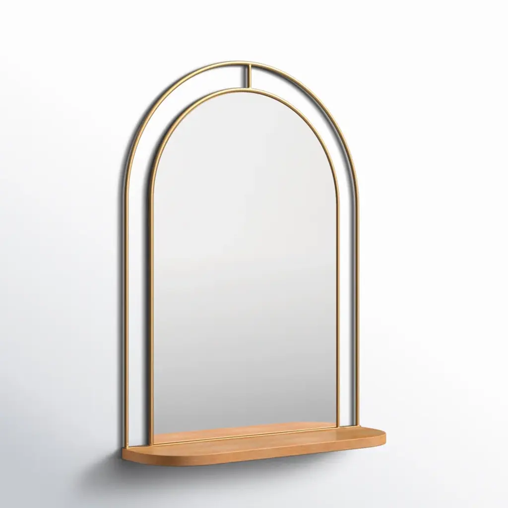 Say hello to a mirror that's more than just a reflection. Crafted from top-tier metal-forged iron, its double-arched frame and golden aura make a lasting impression. But that's not all - It also offers a petite display shelf ideal for your favorite trinkets or toiletries. A masterstroke of transitional design, fits seamlessly into any contemporary living space or powder room. With it, elegance is more than skin deep.