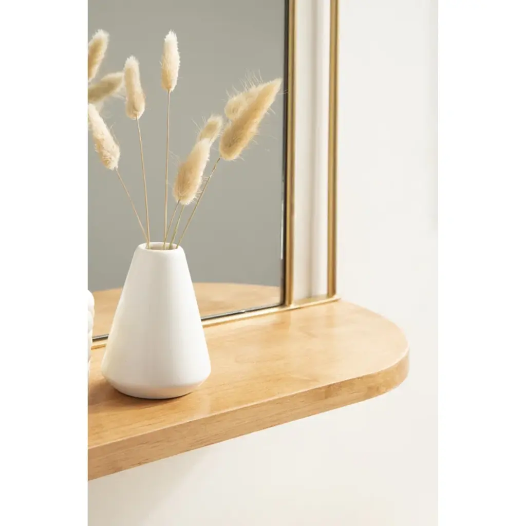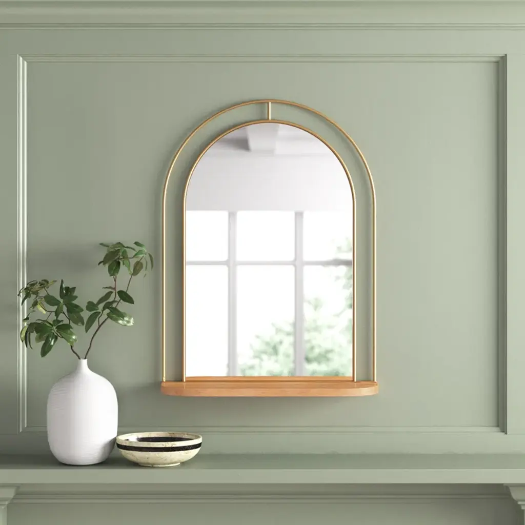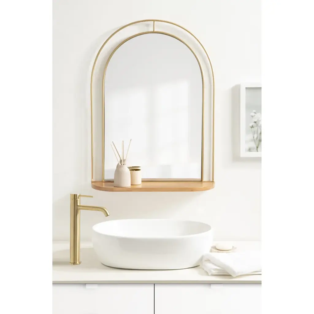 Say hello to a mirror that's more than just a reflection. Crafted from top-tier metal-forged iron, its double-arched frame and golden aura make a lasting impression. But that's not all - It also offers a petite display shelf ideal for your favorite trinkets or toiletries. A masterstroke of transitional design, fits seamlessly into any contemporary living space or powder room. With it, elegance is more than skin deep.