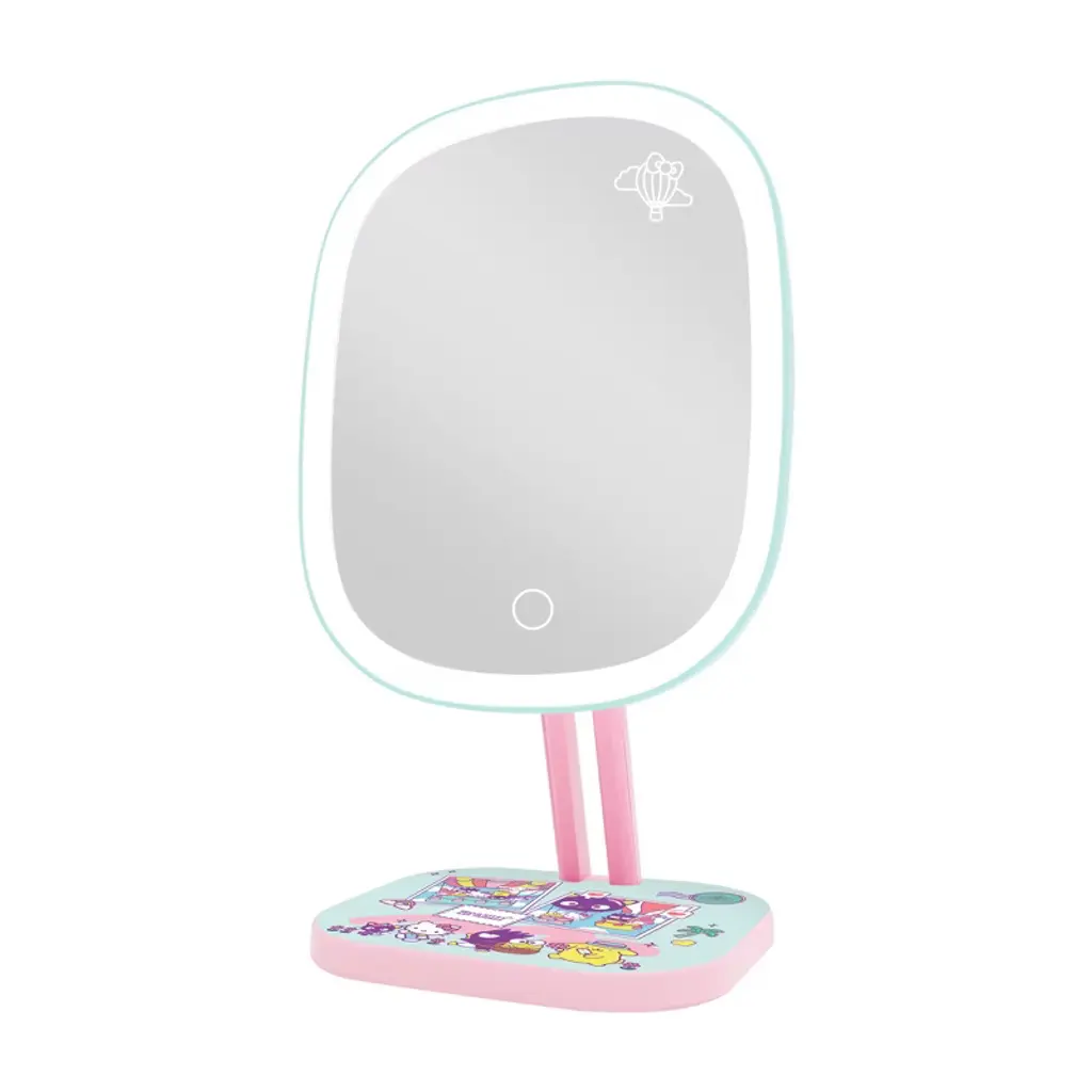 Impressions Vanity introducing Hello Kitty and Friends Vacay artwork mirror is vibrant and elegant. Makeup Vanity mirror stands on a double post support connected to a base. The base is decorated with various cartoon characters. The characters resemble stylized animals or fantasy creatures, giving the mirror a fun, youthful vibe. A light vanity mirror adds a delightfully elegant a playful twist to your beauty space. An integrated LED light strip lines the inner edge of the mirror, with a circular touch button at the bottom center for easy lighting control. The travel makeup mirror is perfect for travel, hanging out, or small spaces