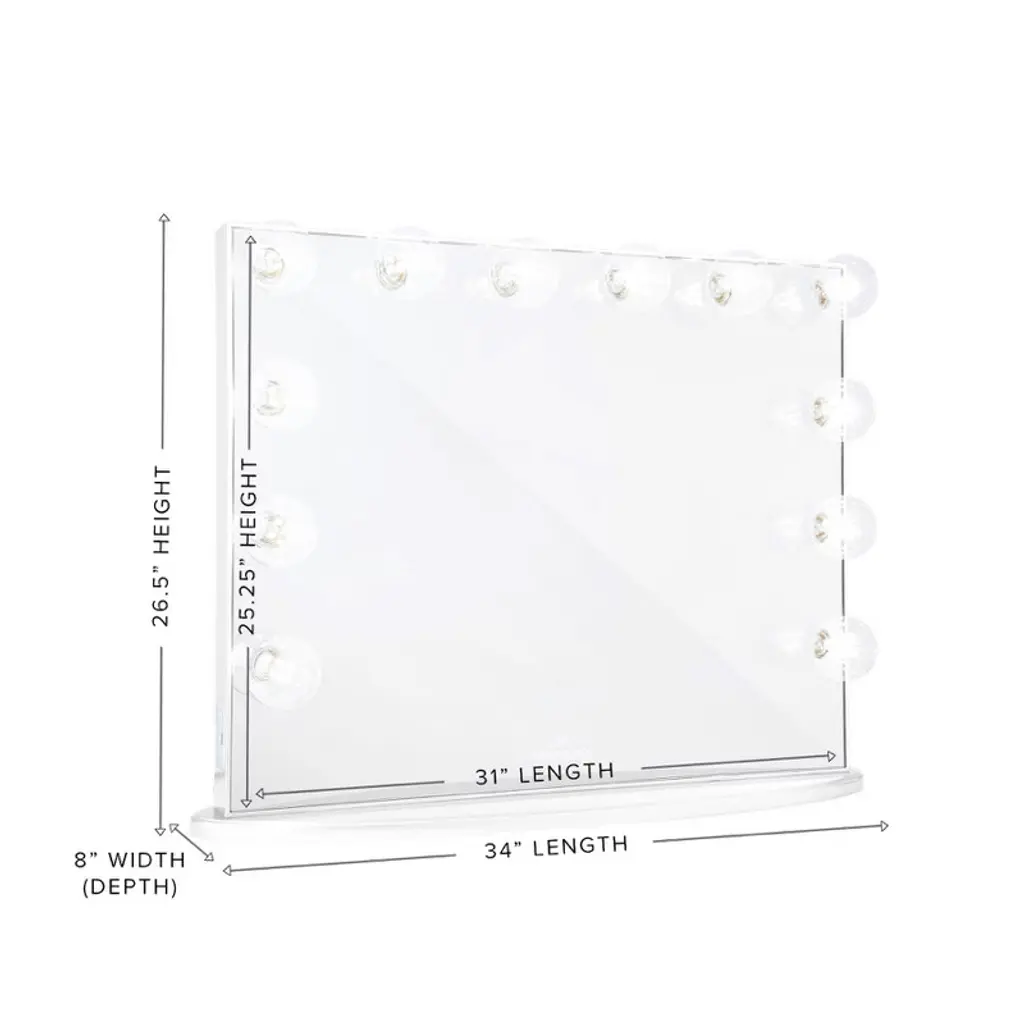 The IMPRESSIONS VANITY's Hollywood Glow Plus is our newest size offering of our bestselling Hollywood Glow Series. An ultimate statement in vanity elegance, featuring our exclusive patented Hollywood Glow Frame the unique, very chic, and modern design radiates a new brand of Hollywood glamour and simple sophistication that has made countless makeup lovers, pros and beauty bloggers fall in love. Join thousands of happy owners and let your every day glow!Special Feature:The Hollywood-style layout provides timeless aesthetic and studio-quality lightingSide-mounted accessory powerEasy-to-reach dimmer switchUSB charging portsWireless speakers for audio streaming with LED screen indicatorTouch-sensitive control panelDigital thermostat functionBeautifully handcrafted with high-quality woodMinimal assembly required, just attach the base, screw in the bulbs, plugin, and light up!Available in our signature Glossy White, Pro Black, Champagne Gold, Shimmery Silver, and Rose Gold premium finishesDimension:Mirror: 31 x 25.25 in.Length: 34 in.Width: 8 in.Height: 26.5 in.Weight: 49 lbs. !! Every occasion or your special day our vanity set plays a special role in your life !!