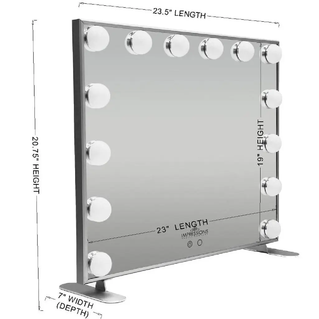 Overview Fit our ultra-slim Hollywood Touch Duo-Tone Wide LED Makeup Mirror anywhere and complete your vanity set! Equipped with built-in long-lasting LED Lights around the mirror for even lighting. Tap the power button to power it on/off and hold to adjust the brightness to your perfect level. Tap the right button to switch between natural, warm, or cool lighting. The mirror comes with legs you can attach and have it sit on your makeup station. Or remove the legs and hang it on the wall! This mirror has pre-drilled slots in the back for wall-mounting. Features 14 built-in long-lasting LED lightsTouch sensor to power on/off the mirrorTap and hold the power button to adjust the brightnessTap the lighting button to alternate between:Warm Lighting And Cool Lighting Stand legs includedPre-drilled holes for wall-mountingScrews and anchors included**UPC(Black): 810035561236 ** Ask a local hardware store to ensure that the screws and anchors are right for your particular walls Dimensions Mirror23 x 19 in.Length23.5 in.Width7 in.Height20.75 in.Weight5 lbs.