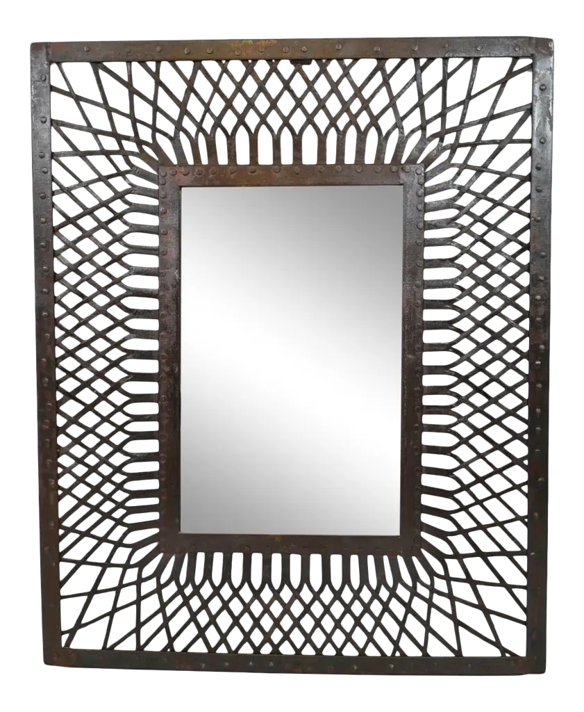 Industrial style hand crafted solid iron round mirror. Beautiful rivet details around the sturdy frame with center mirror. Wonderful texture and style. Each will have slight unique variations in patina and distress.