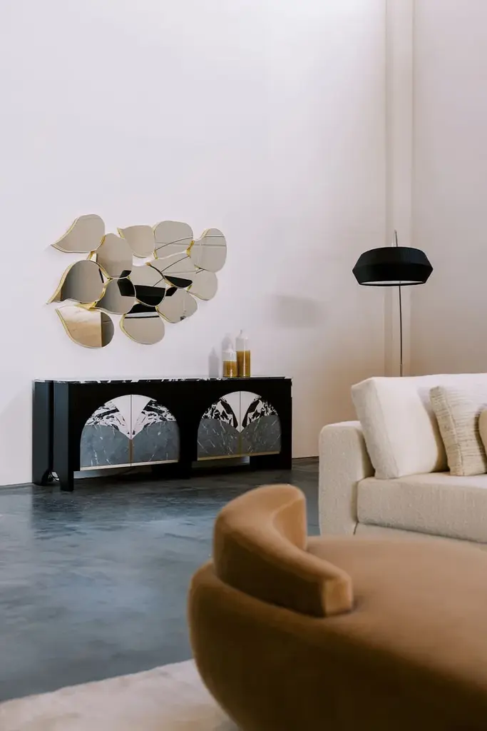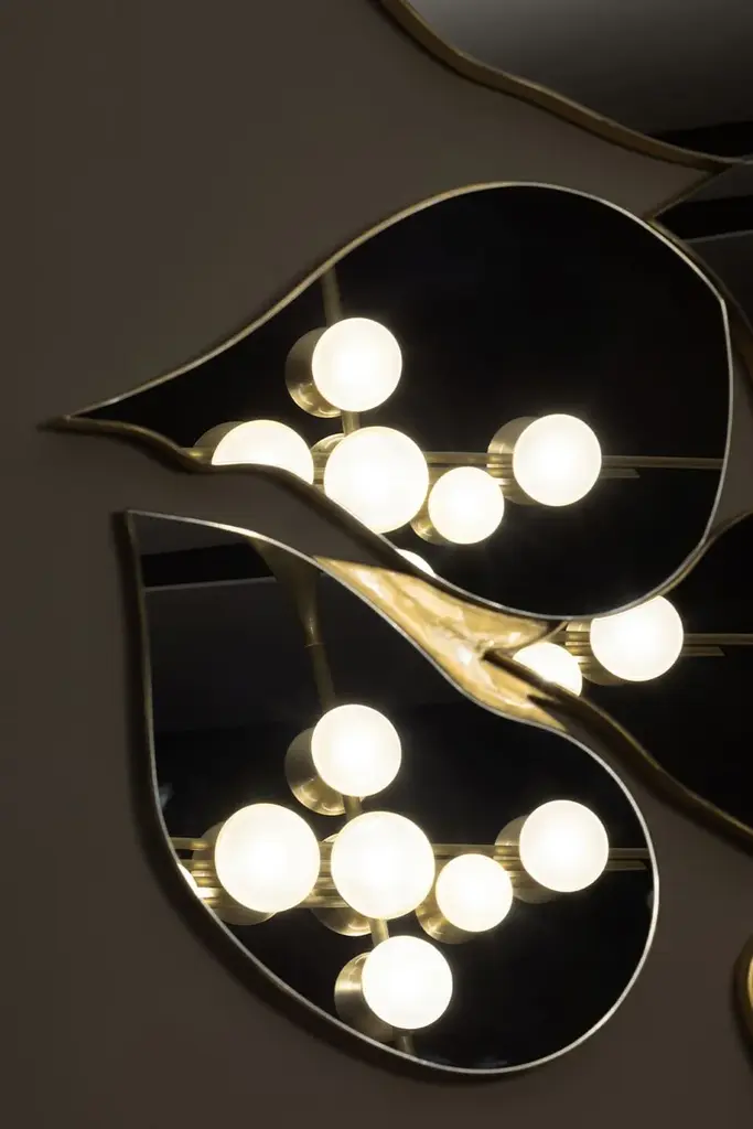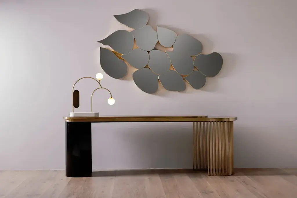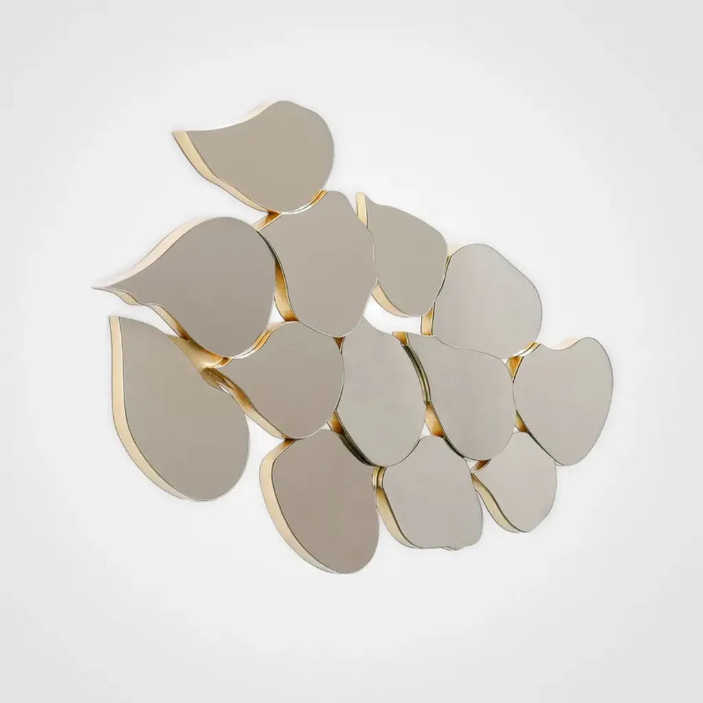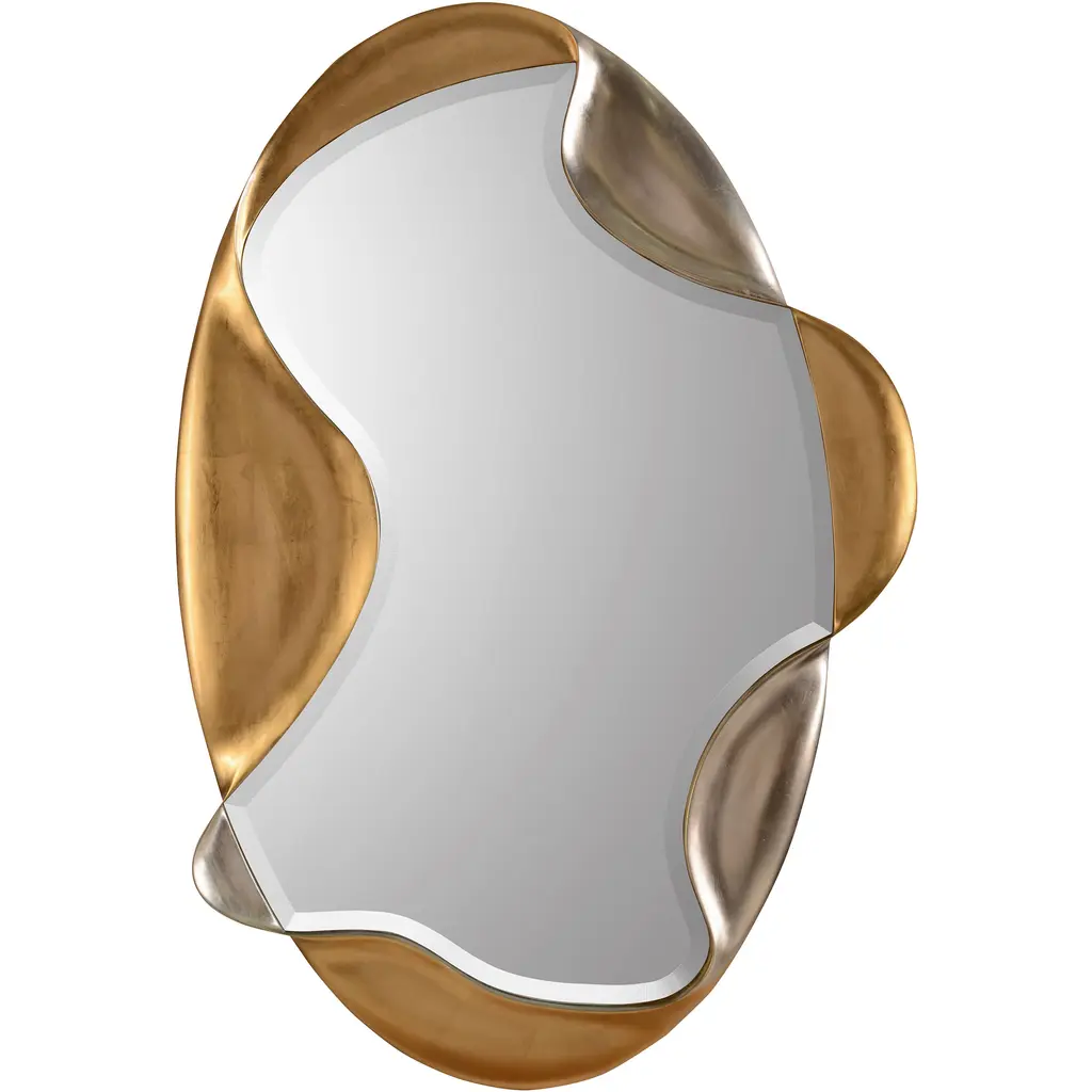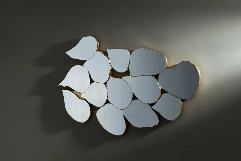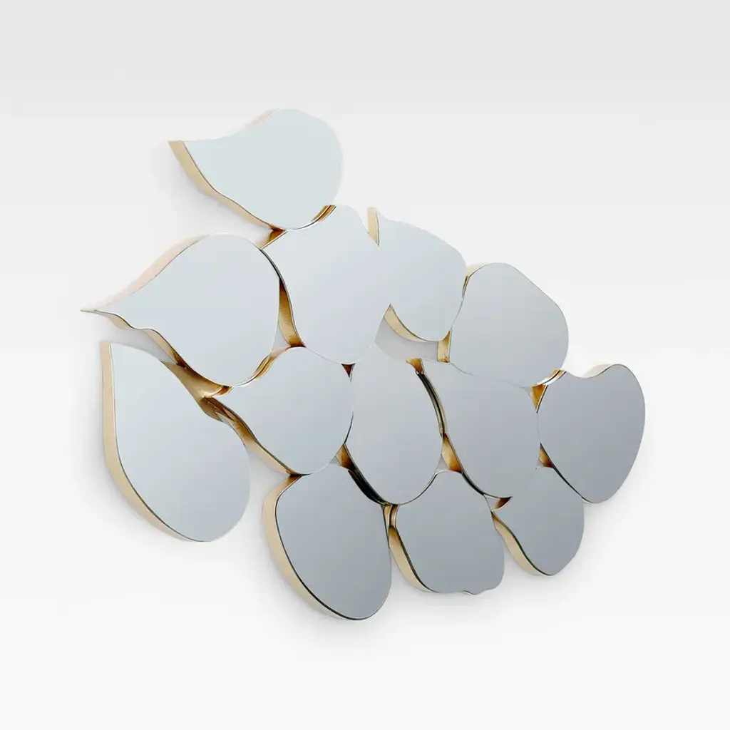 Infinity is a mirror. The elegant movement of the Infinity Mirror reveals a flowing piece that reflects the passage of time in an infinite gaze. The falling leaves and the divided cloud reflection condense the allegorical nature of this work. The hand-applied gold leaf highlights the flowing forms that lead to infinity.Materials & FinishesFI001 Gold leaf; high-gloss finishMI001 Clear crystal mirror