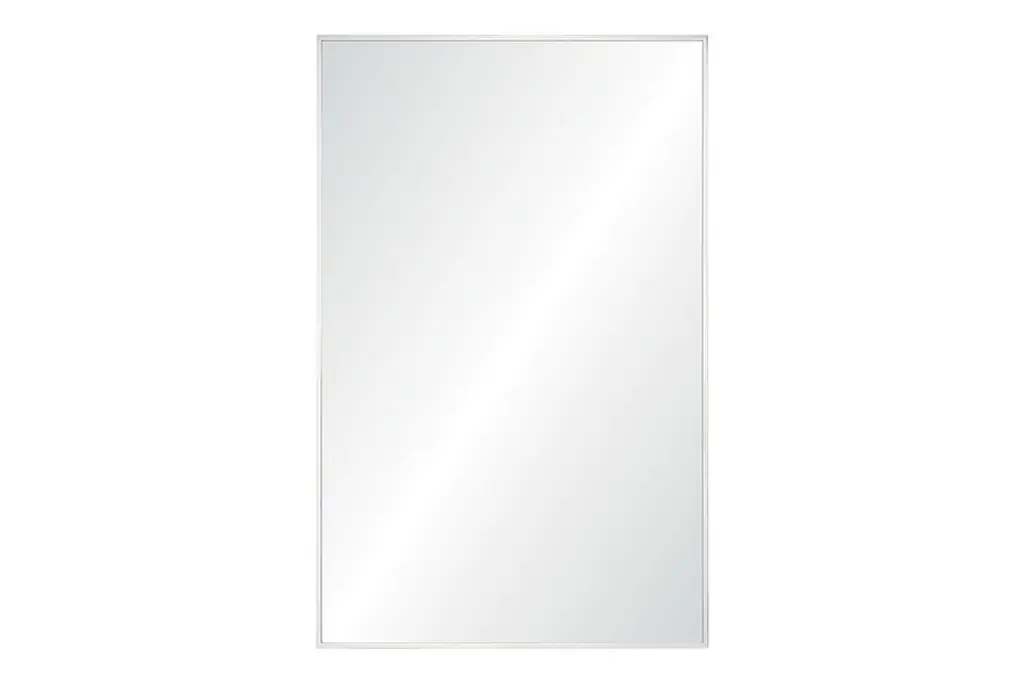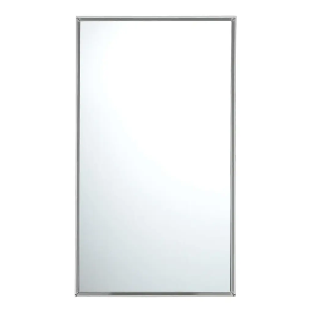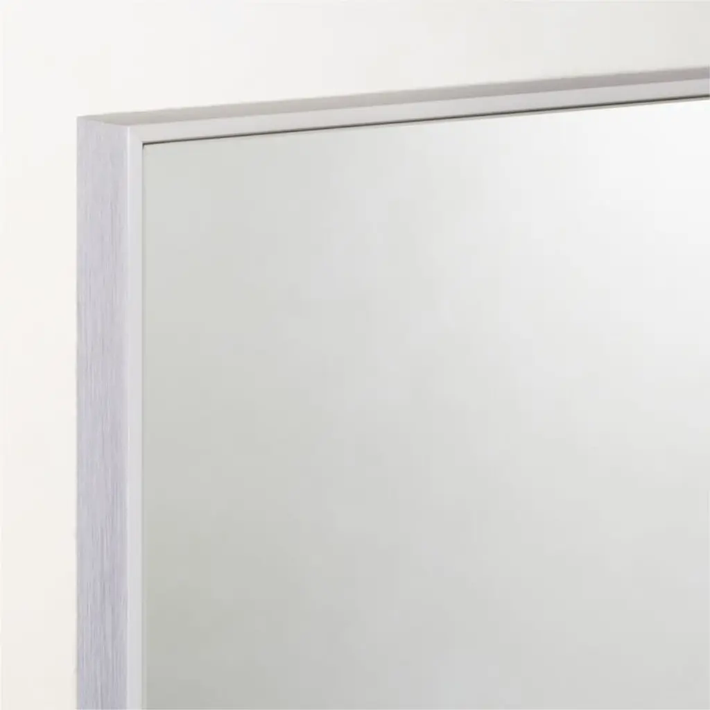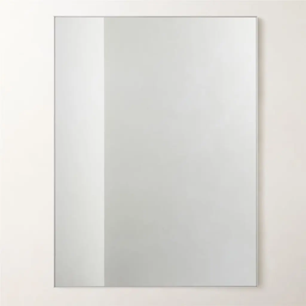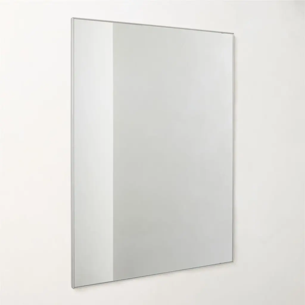 Bordered by a brushed silver frame, modern wall mirror has a sleek finish that can live easily in the bathroom, office or bedroom. CB2 exclusive.