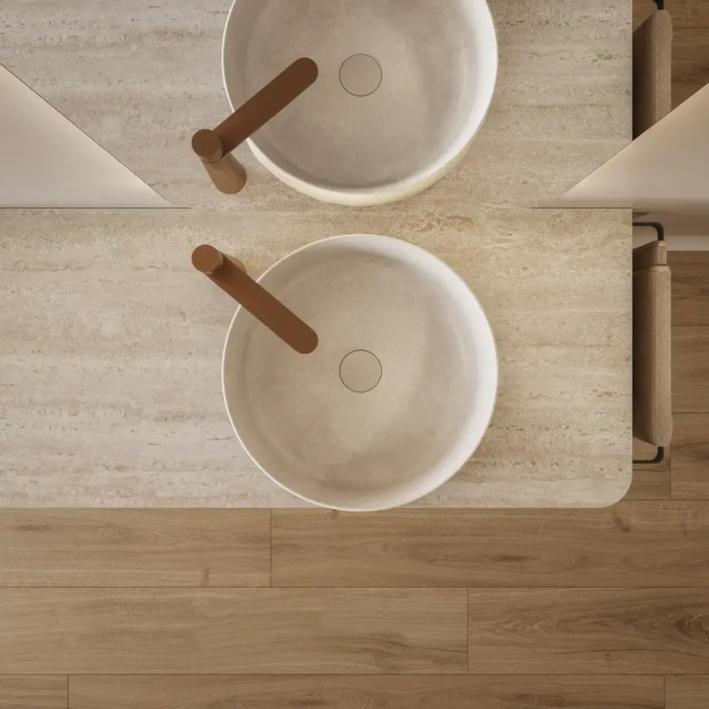 Infinity Round 2 is a bathroom furniture set that includes a mirror, a towel holder, and a fluted HPL washbasin unit with a countertop washbasin and a travertine stoneware top.