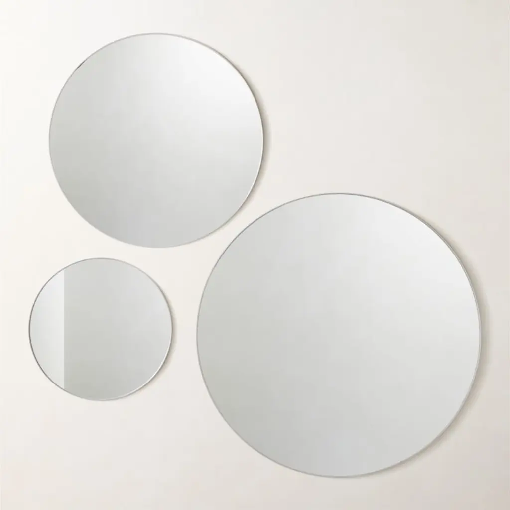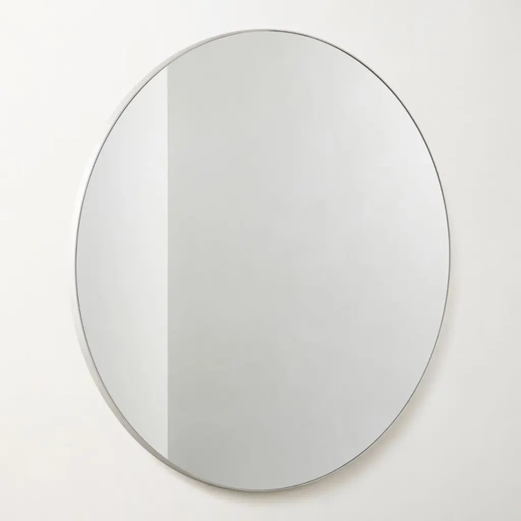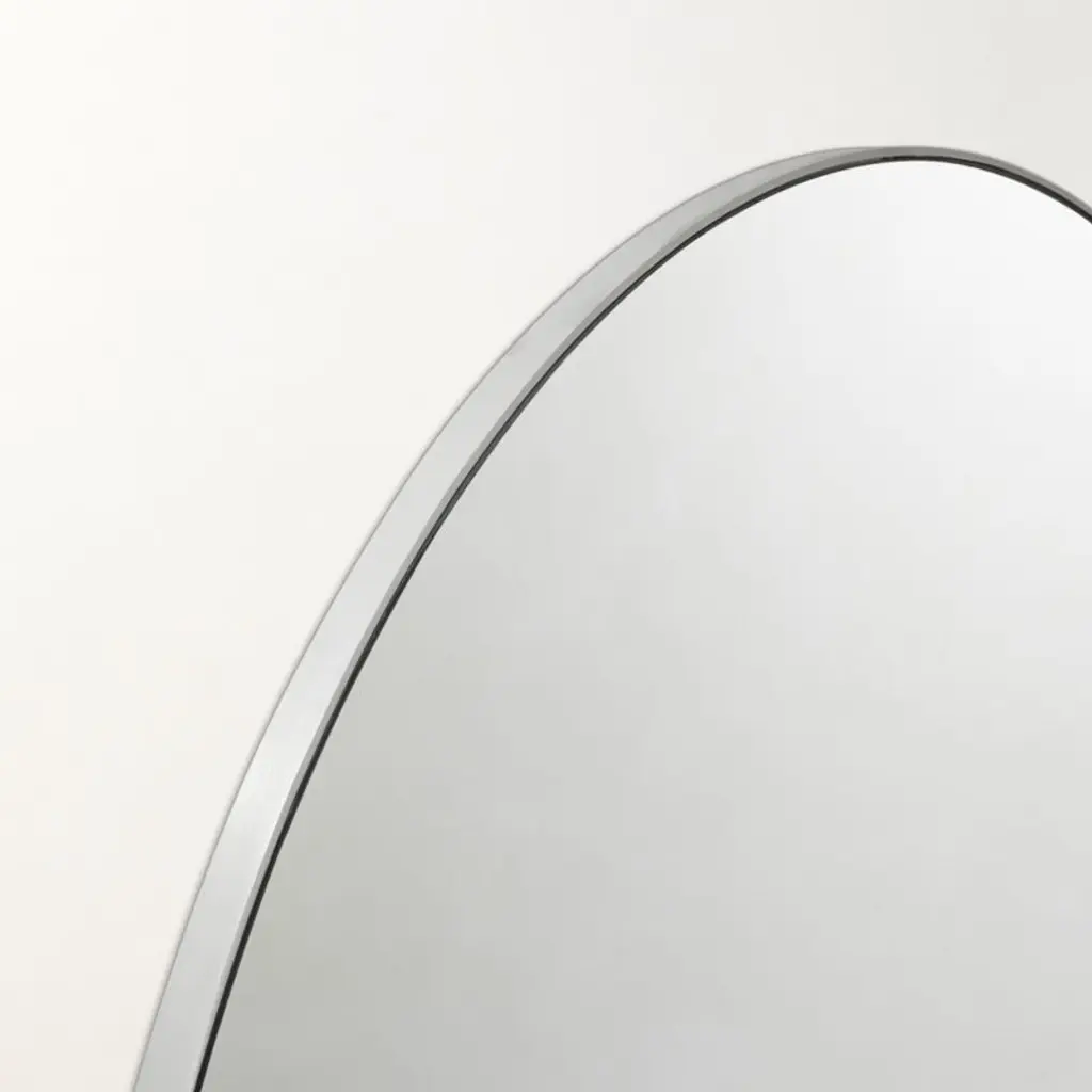 Extra large looking glass framed thin, trim and exact in pure extruded aluminum with brushed silver finish. Handmade frame resists corrosion so it's perfect in the bath. Mounting hardware is included.
