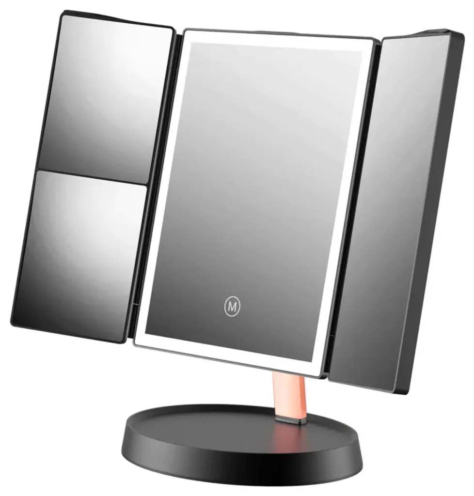 Impressions Vanity Get ready with ease with the Infinity Trifold LED makeup mirror with magnification. During your beauty routine place your favorite gloss, lashes, or earrings at the base of the mirror making you are getting glam process a whole lot easier. This innovative mirror comes with a 1x, 2x, and 3x side panel mirror. This rechargeable makeup mirror is decorated with an LED light that surrounds the frame which provides the perfect light for ideal makeup. Also, it has included 3 panels to adjust for viewing any angle. Mirrored panels are adjustable and LED lighting surrounds the frame of the mirror providing even lighting.Features:2X 3X MAGNIFICATION: This contemporary vanity mirror is built with a 2X 3X magnification side panel. Perfect for lipstick, eyelashes, eyeliner, and mascara. Fully tilted mirror base for your perfect makeup angleAESTHETIC STYLE: Give your room decor a modern touch with this lavish tri fold mirror with lights. A stylish aluminum frame with extra storage will add a new dimension to your beautiful home decor and make your vanity corner glowMULTIPLE FUNCTION: Our Impressions Vanity magnifying mirror with lights is equipped with versatility. These eye friendly LEDs are customizable for your personal comfort. Sensitive touch panel for necessary brightness for your party makeup, or daily skincare routineIDEAL GIFT: Make every day special with this vanity mirror for desks and lights. This makeup vanity can be a posh presentation for your loved ones