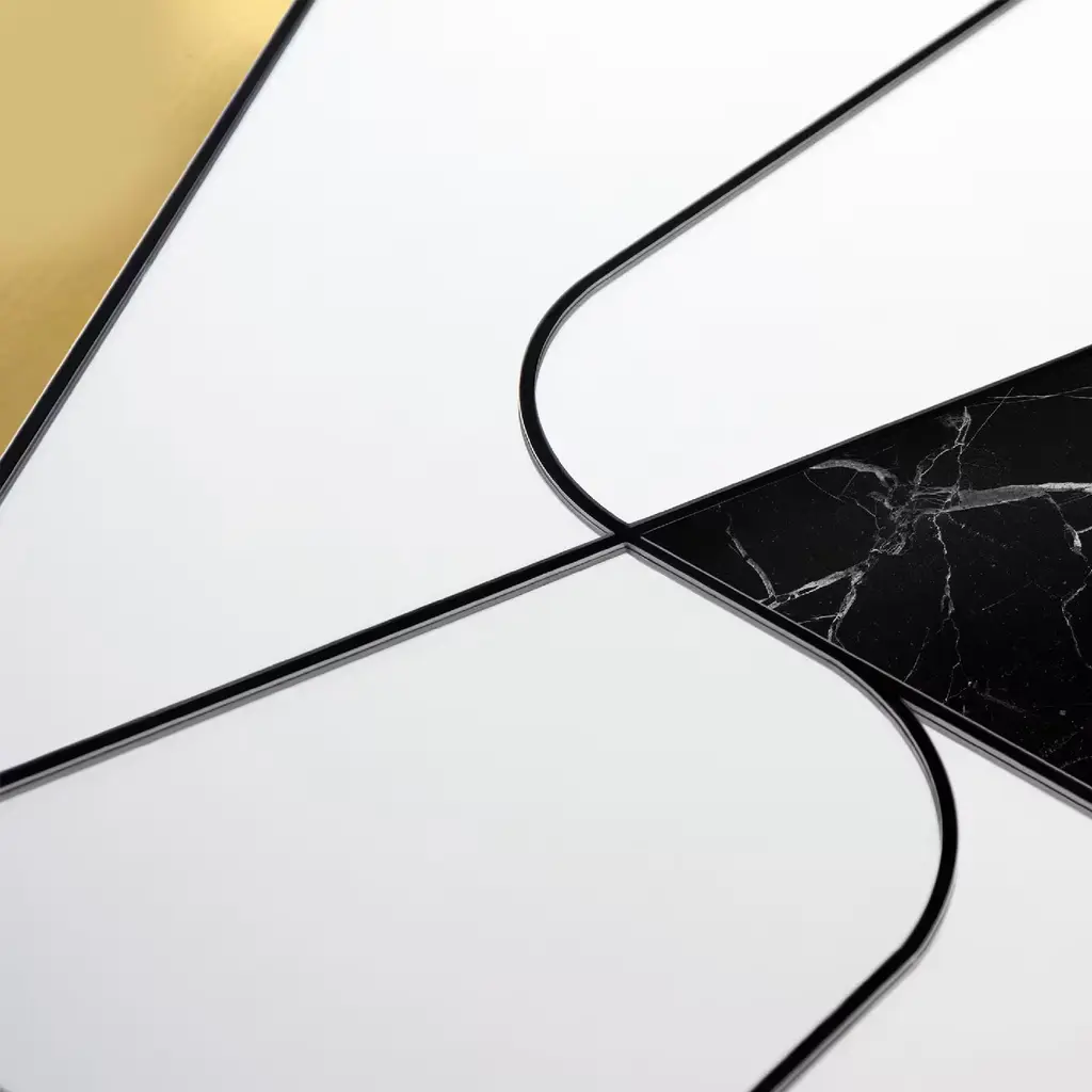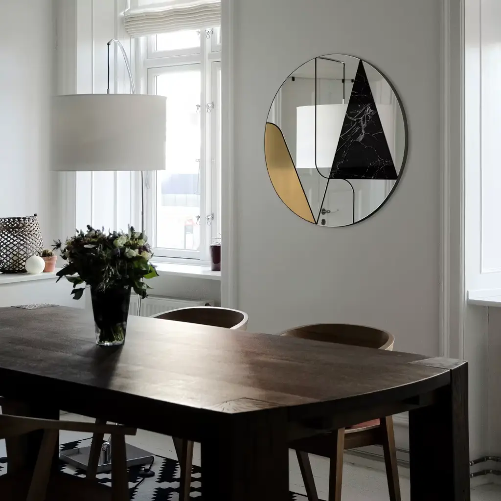 A series of lines cut the space within the round frame of this magnificent mirror, the asymmetric mirrored surfaces adorned with a curved insert in brushed brass and a triangular slab of black Marquina marble. This captivating design is entirely crafted by hand and will create striking reflections on a modern interior, adding a lively decoration with its contrasting colors and finishes. The piece is supported by a wooden base with a steel setting framing the various parts.