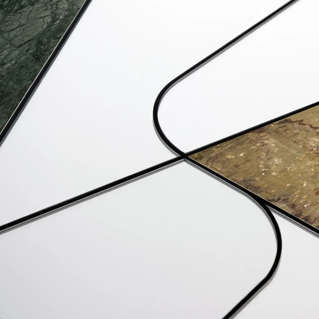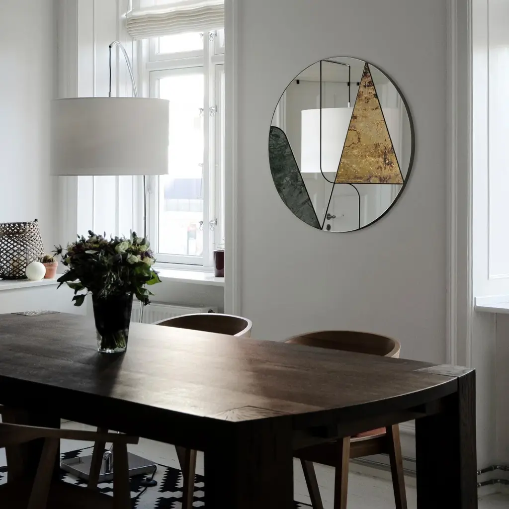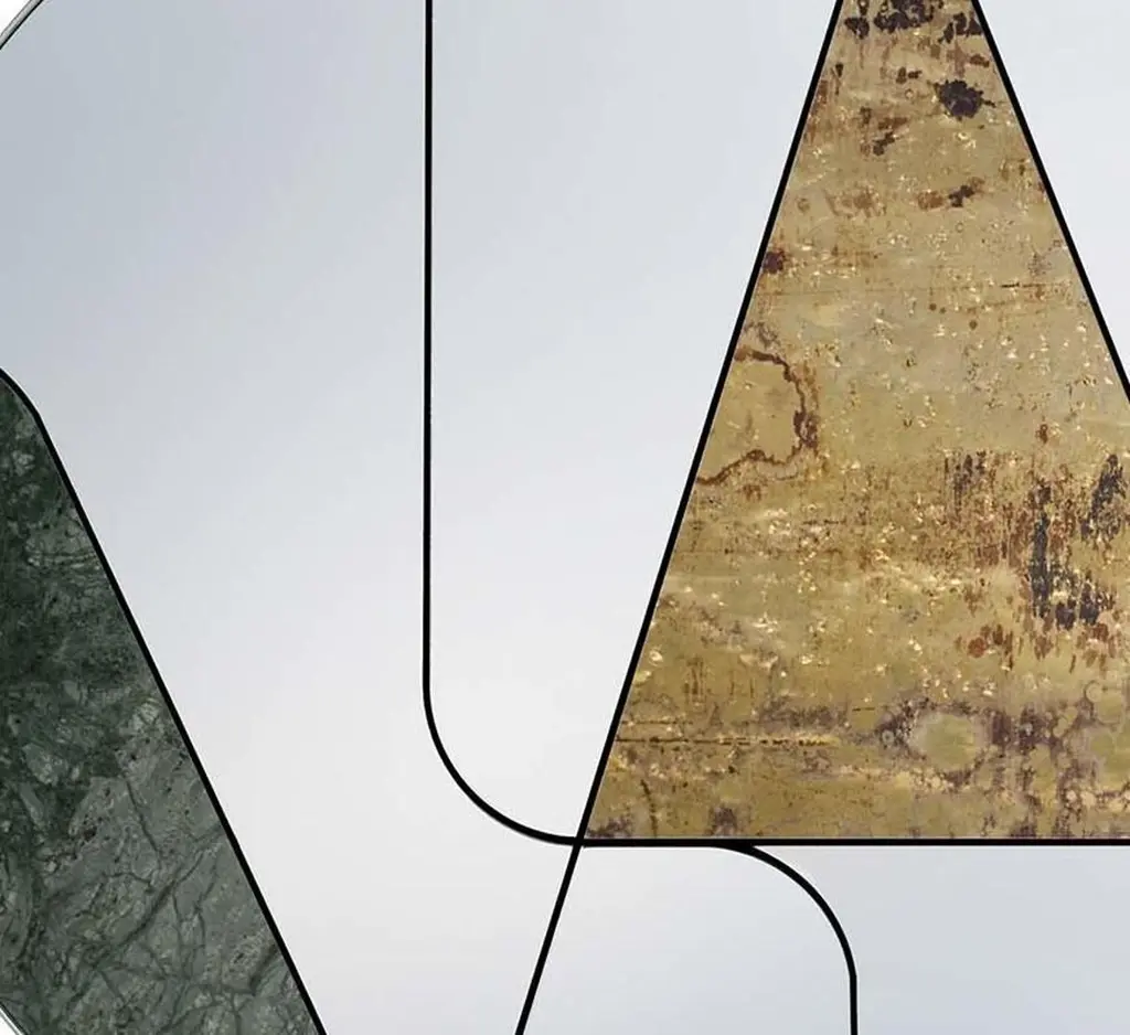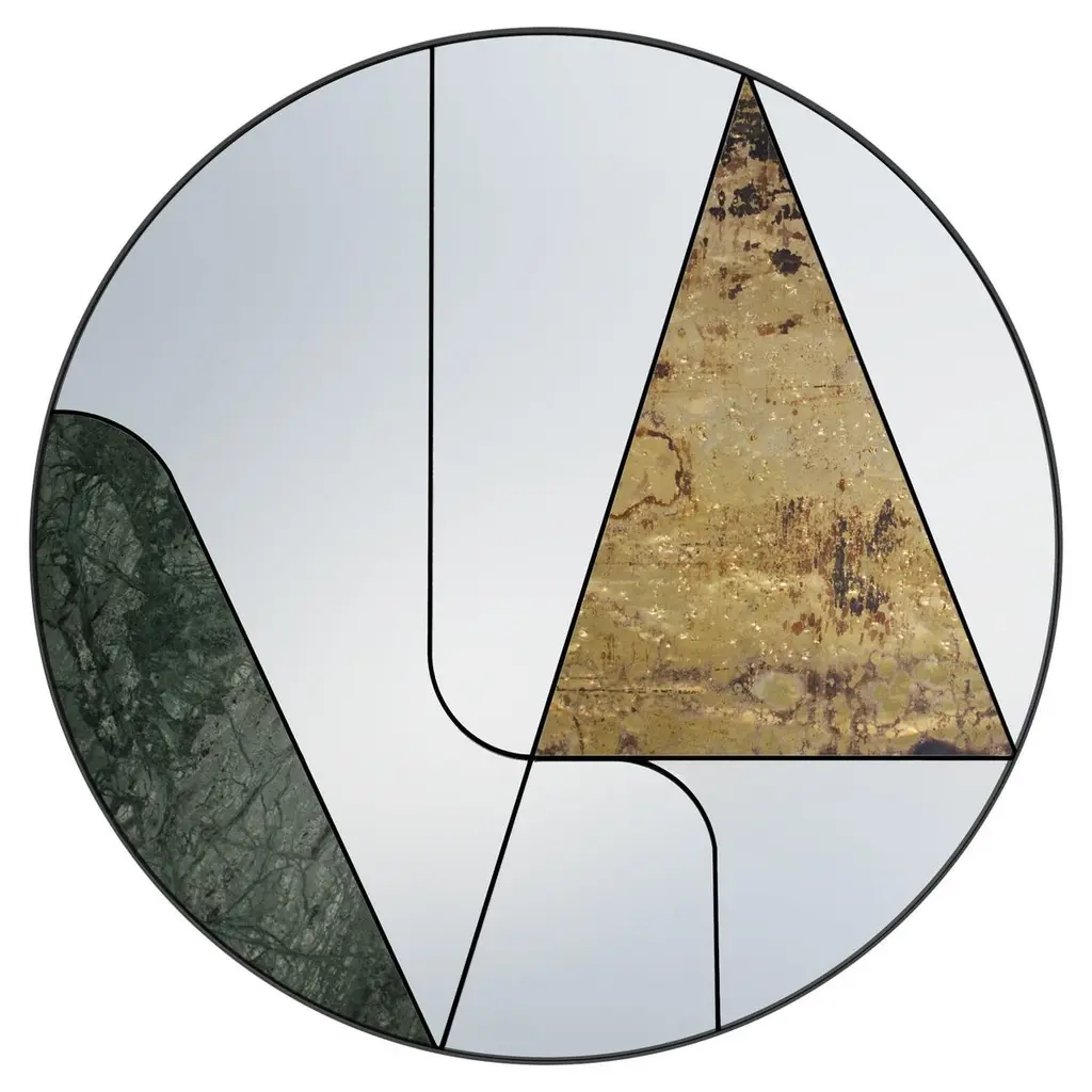 This one-of-a-kind mirror is crafted by hand and will be a superb addition to a modern interior. Its striking combination of rigorous geometry and chromatic contrasts makes it a unique piece to showcase in any room. The round silhouette features a wooden base that supports a series of mirrored glass elements framed in a steel setting. A hand-finished brass triangle and a curved slab of splendid green Guatemala marble complete this striking, asymmetrical design.