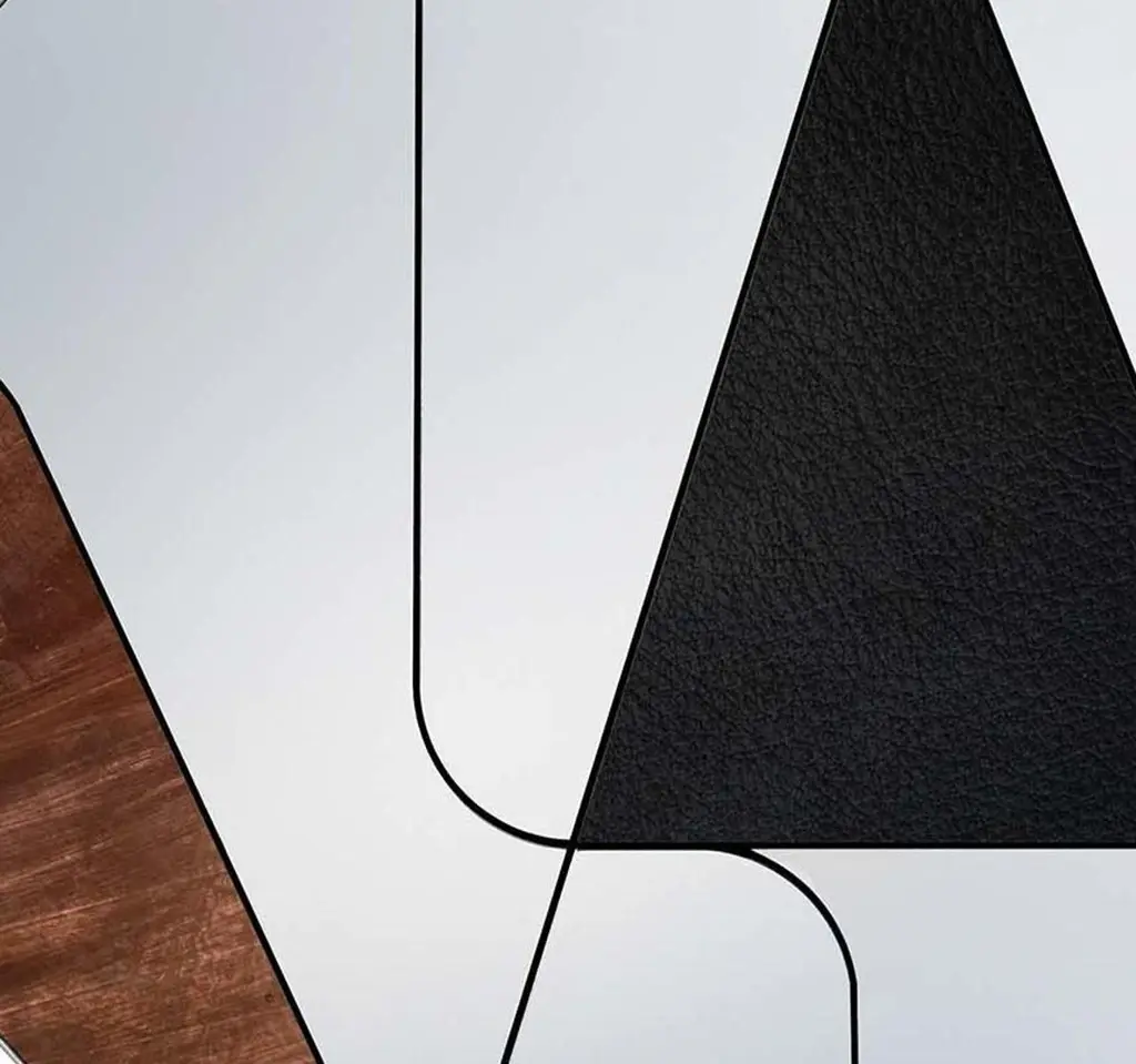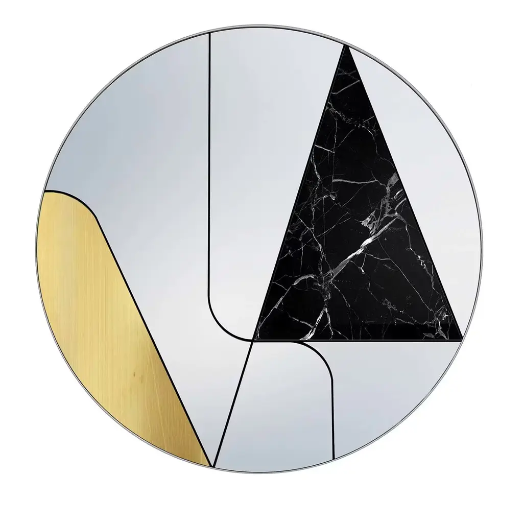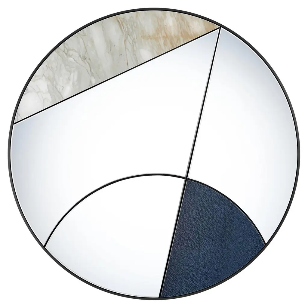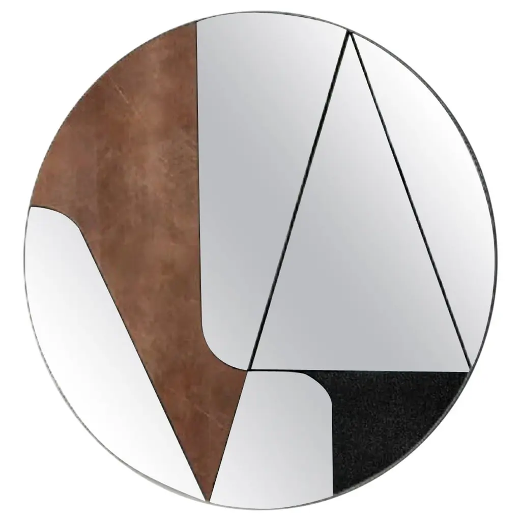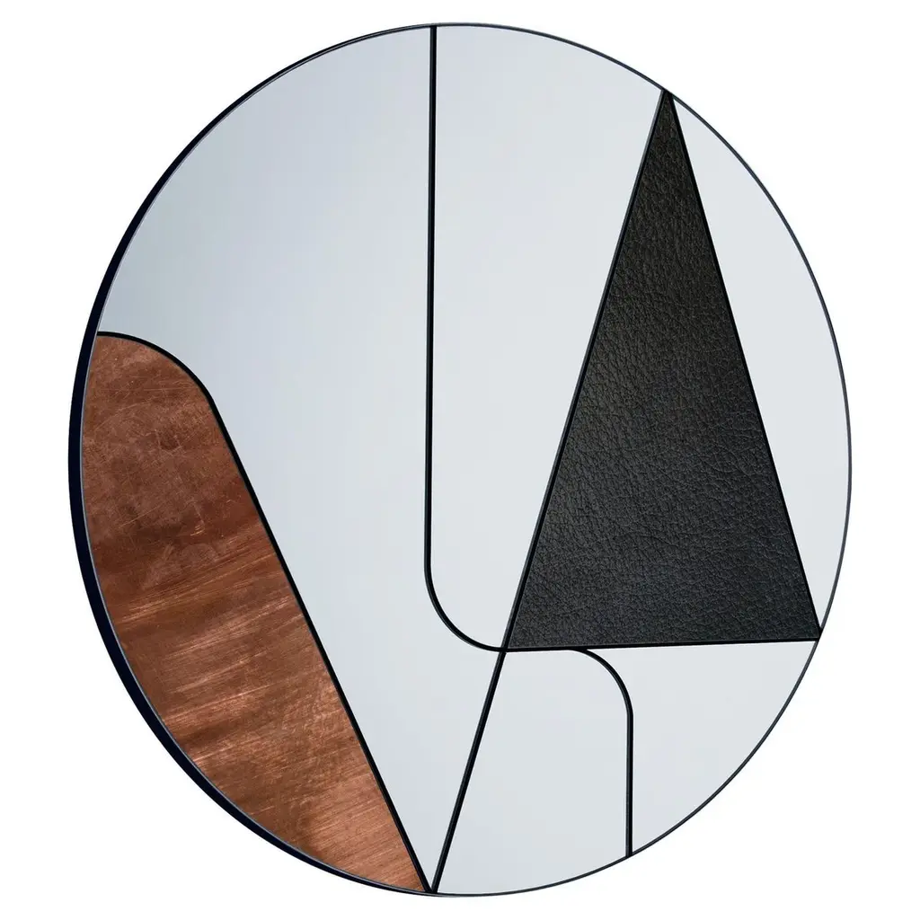 This elegant mirror is a splendid addition to a contemporary interior, where it will enliven an entryway, living room, or powder room wall with its superb contrast of colors, shapes, and materials. Entirely handcrafted, this piece features a round Silhouette resting on a wooden support, where various mirrored glass elements are mounted within a steel frame. An insert in brushed copper and one in black leather add captivating decorations to this magnificent design.