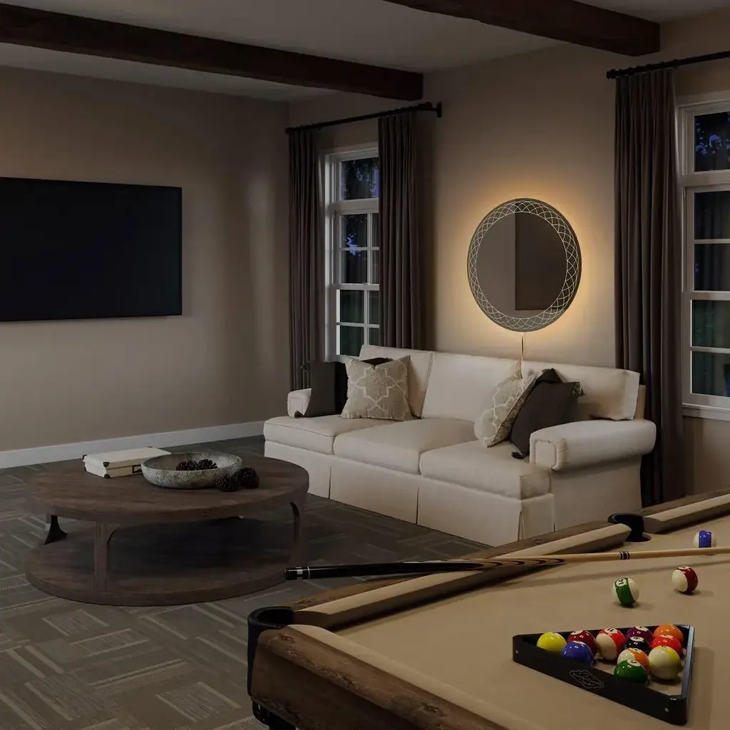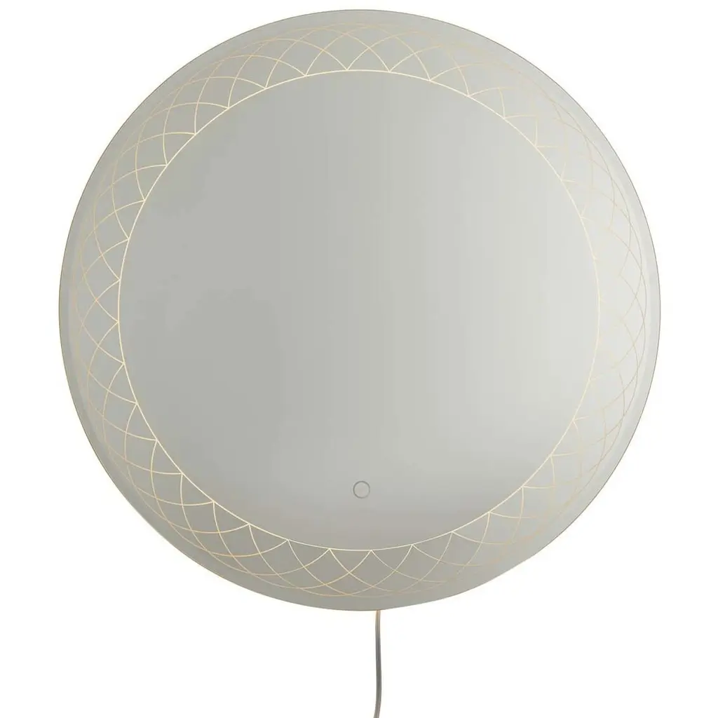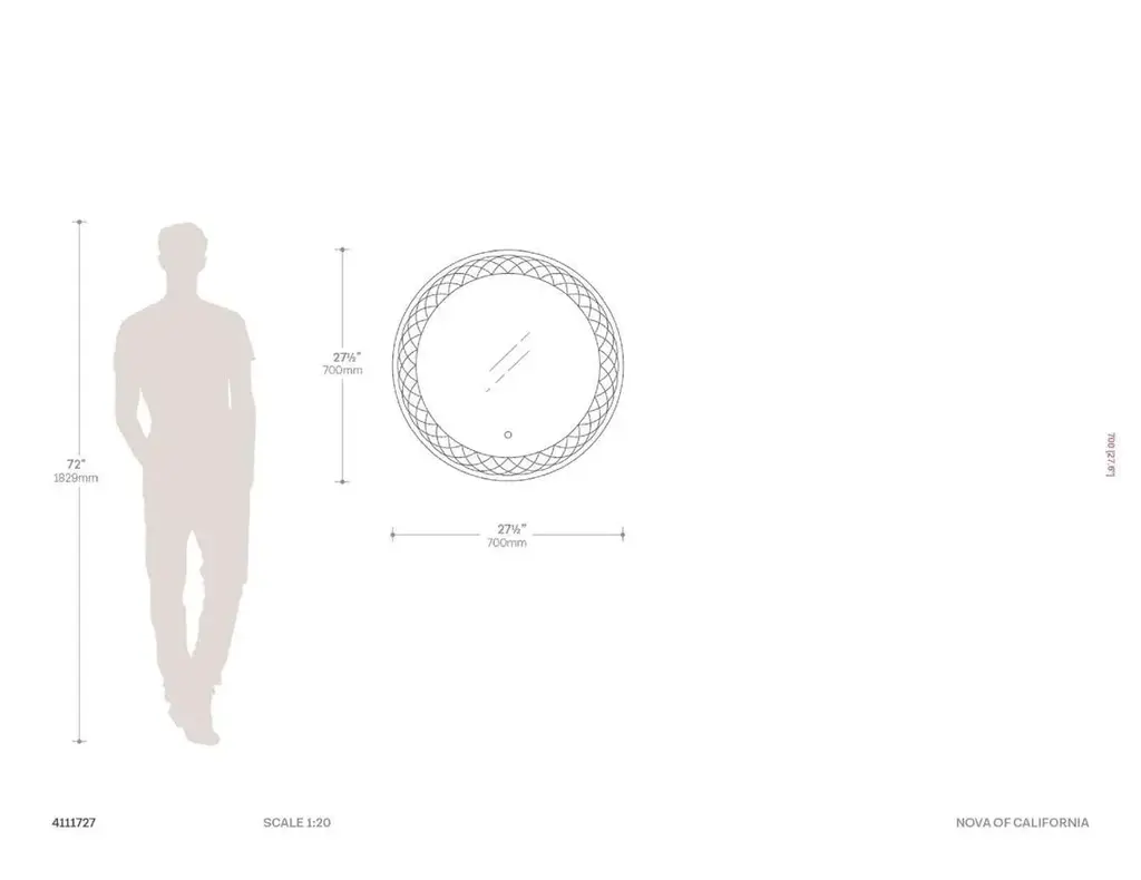 Our Interlace Illuminated Mirror features an elegant lace etched pattern. Gently touch the discreet on/off button at the bottom of the center of the mirror and the etching transforms into a gorgeous glowing pattern of light. The mirror features a touch dimmer, ensuring exactly the right amount of illumination for any room or event. Measuring 36 inches round, the Interlace Illuminated Mirror is sure to bring new life into any space. When used in conjunction with a smart switch, Interlace is compatible with Amazon Echo, Google Assistant, and Apple Home, and can be automatically turned on/off manually, by voice activation, or by scheduled settings. NOVA of California was Founded in 1923 Upon an Unwavering Commitment to the Crafting and Designing of Unfathomably Distinctive Home Décor, Lighting, and Mirrors. A Dedication to Environmental Protection and a Satisfied Customer Base Has Allowed NOVA to Thrive and Flourish for Nearly a Century. * 28 inches Round. * 2,295 lumen LED lights. * Touch dimmer switch, clear cord. * Best for creating a dramatic focal point. * Use in living rooms, bedrooms, dens & game rooms. * Elegant Lace-Etched Design: The intricate lace pattern is expertly etched into the glass, creating a visual delight that becomes a luminous work of art when illuminated. * Touch-Activated Illumination: Simply touch the discrete on/off button at the bottom center of the mirror to reveal the glowing lace pattern. The mirror also includes a touch dimmer, allowing you to adjust the brightness to the perfect level for any occasion. * Versatile 36-Inch Round Design: Measuring 36 inches in diameter, the Interlace Illuminated Mirror is the perfect size to make a statement in any room, from living rooms to bedrooms, dens, and game rooms. * Smart Switch Compatibility: When paired with a smart switch, the Interlace Mirror is compatible with Amazon Echo, Google Assistant, and Apple Home, offering seamless control via voice activation, manual operation, or scheduled settings. * Energy-Efficient LED Lighting: The mirror is equipped with 2,295 lumens of LED lights, providing brilliant illumination that enhances the ambiance of your space. * Clear Cord & Touch Dimmer: The clear cord blends seamlessly with your decor, and the touch dimmer ensures the right amount of light for any setting. * Designed by Jon Gilmore (2020): This mirror is a testament to modern design, crafted with precision and artistry. * Materials: Made from high-quality glass, ensuring clarity and durability. * NOVA of California is the oldest lighting company in North America and has been making original contemporary designs for 100 years. * Our artistic background, mid-century modern legacy, and passion for design make our handmade lighting designs timeless, functional and elegant. Enhance your space with the Interlace Illuminated Mirror – a perfect blend of artistry, elegance, and cutting-edge technology.