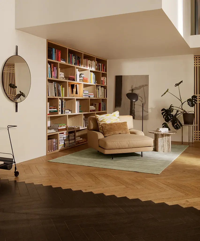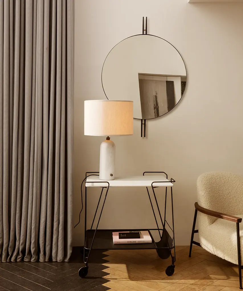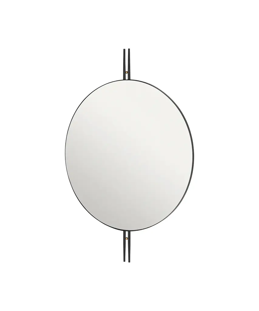 Drawing on geometric Art Deco references with a contemporary design language, GamFratesi designed the timeless IOI Wall Mirror. The ‘sticks and sphere’ motif is reflected in the shape of the letters that form their name, pronounced ‘i-o-i.’ The brass sphere works as both a functional ‘spacer’ to strengthen the dual pipe-like mirror struts, and as an intimately considered signature detail or ‘pause’ that emphasizes both its own materiality and the careful attention paid to the spaces between the elements of each piece. Produced by Danish design publisher, Gubi.