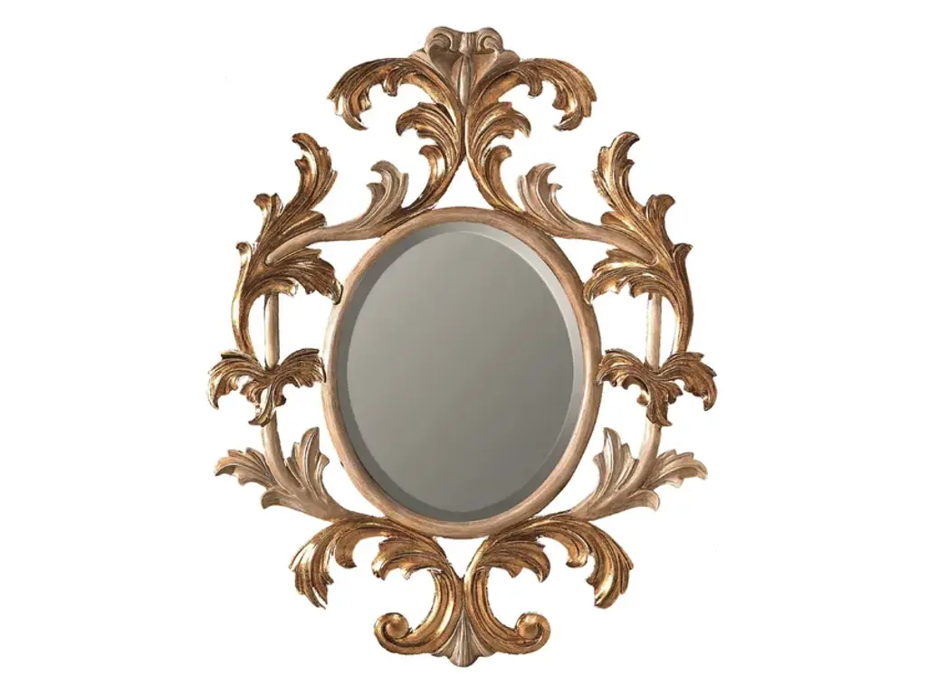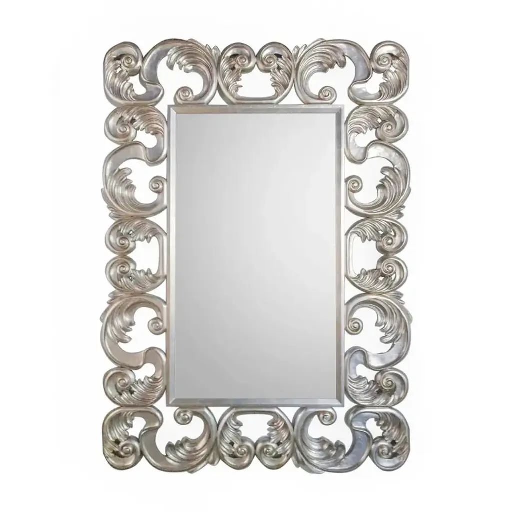 IRIS - Wooden frame hand carved - antique silver finish.Handcarved mirrors. Numerous shapes (round, square, rectangular, oval,…) and designs available (retro, contemporary, modern,…). Exist in several sizes and many different finishing and colours.