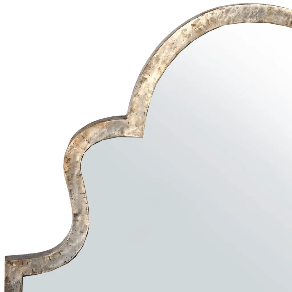 Beautiful Moorish shaped iron mirror with distressed gunmetal steel patina finished frame. Effortlessly cool mixture of traditional and industrial stylings. Each unique in exact patina. This mirror weighs approx. 30 lbs.