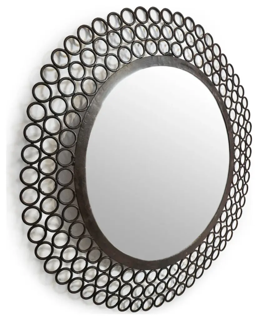 Round iron ring mirror frame with beautiful hand waxed patina. Solid and sturdy handmade quality with unique modern shape. Great for any design space. Ready to hang. Each may have slight variations in exact finish/patina and textures. This item is non-returnable - all sales are final.