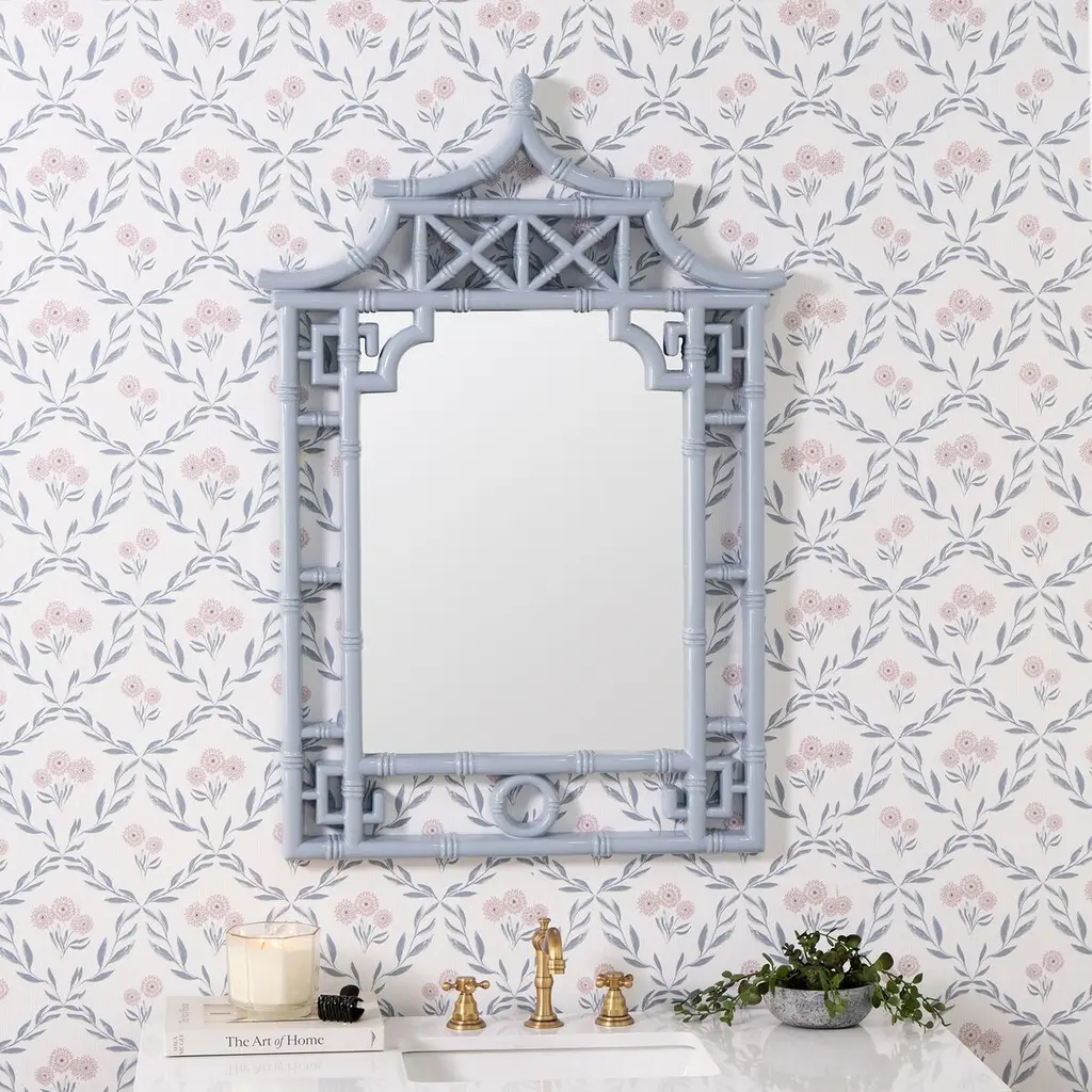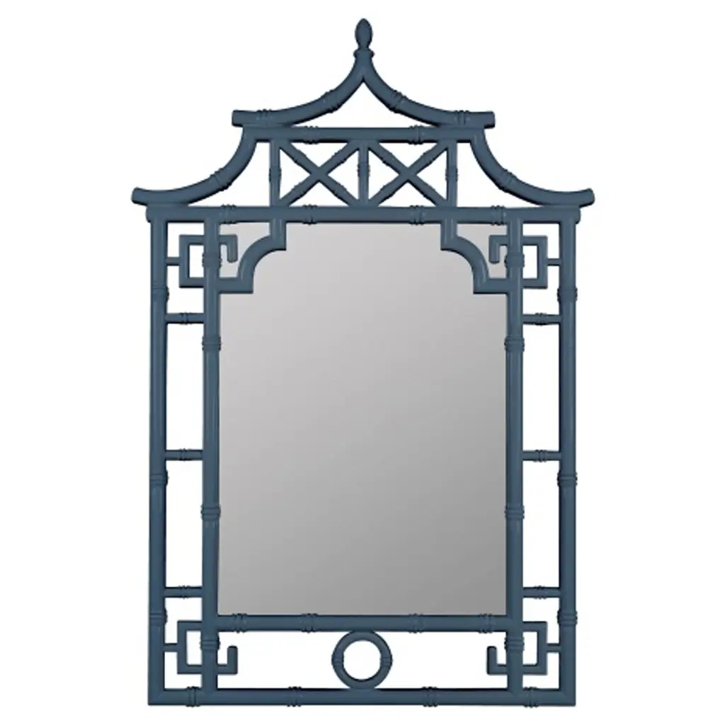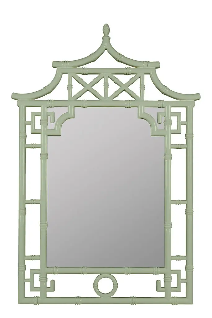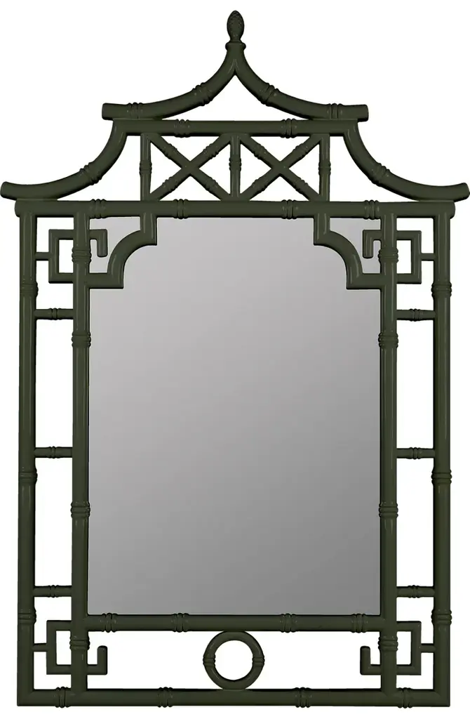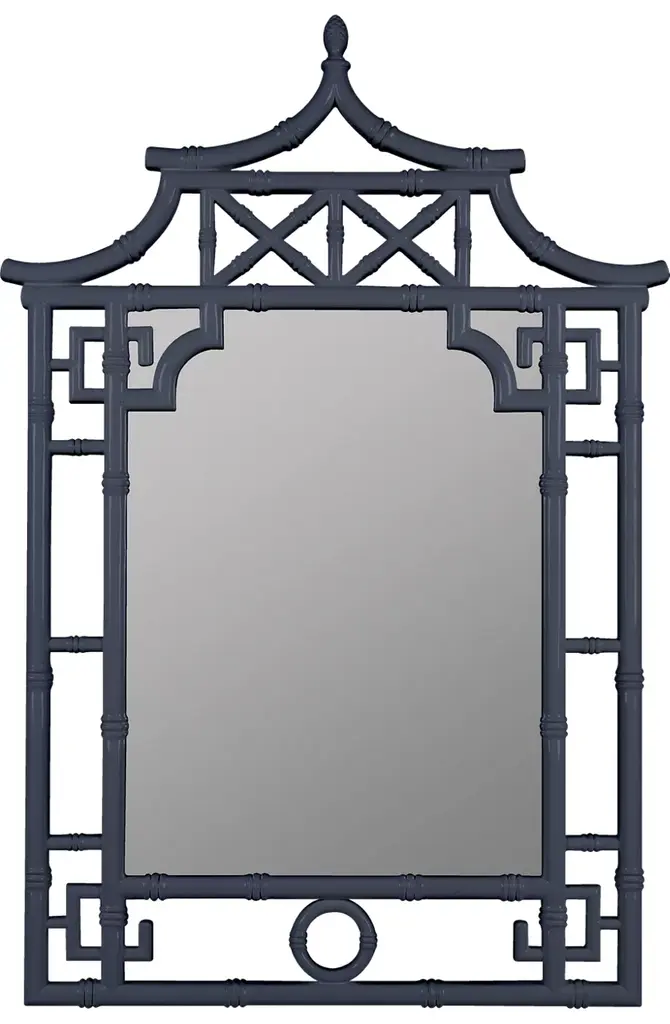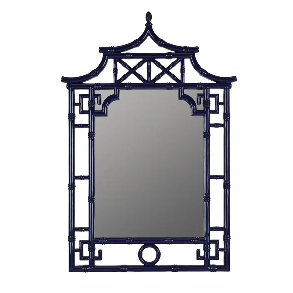 A modern take on traditional chinoiserie motifs, this impressive wall mirror is set in a pagoda frame with bamboo-style details.