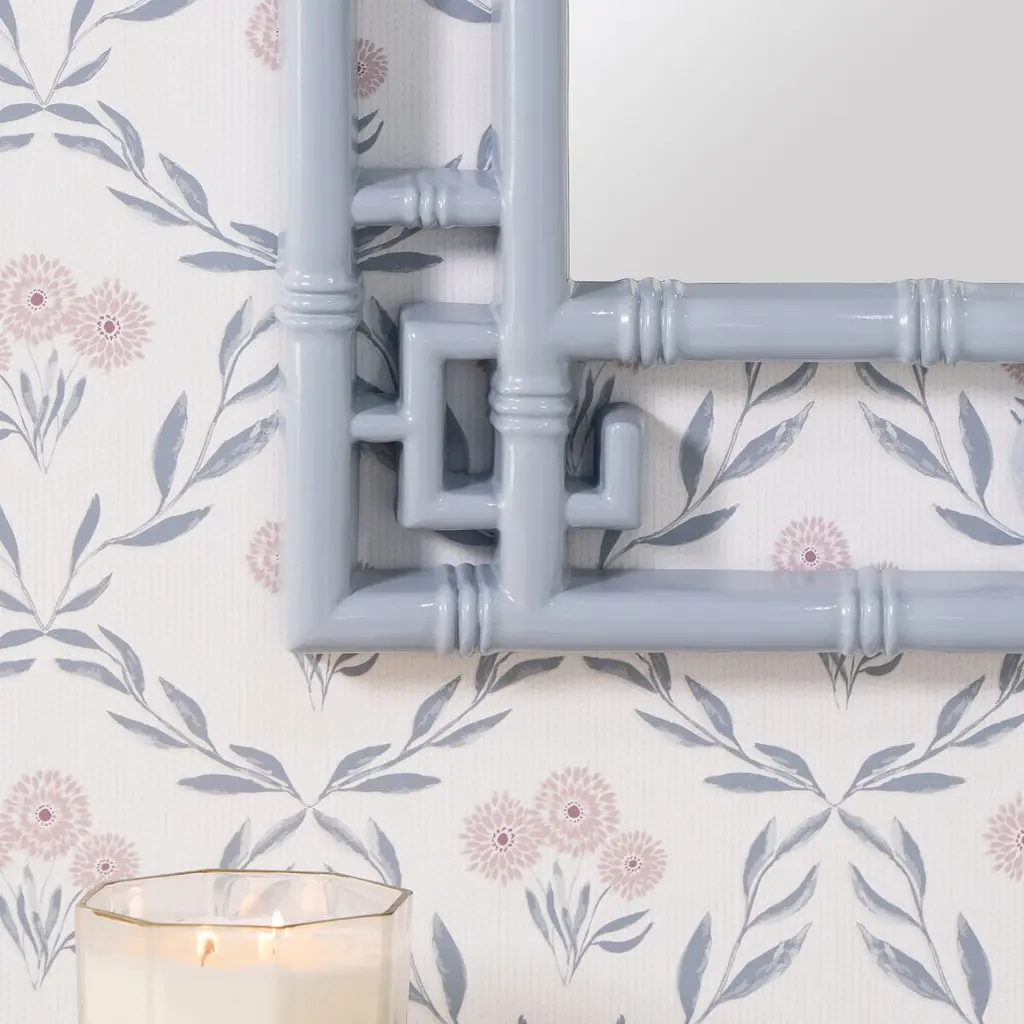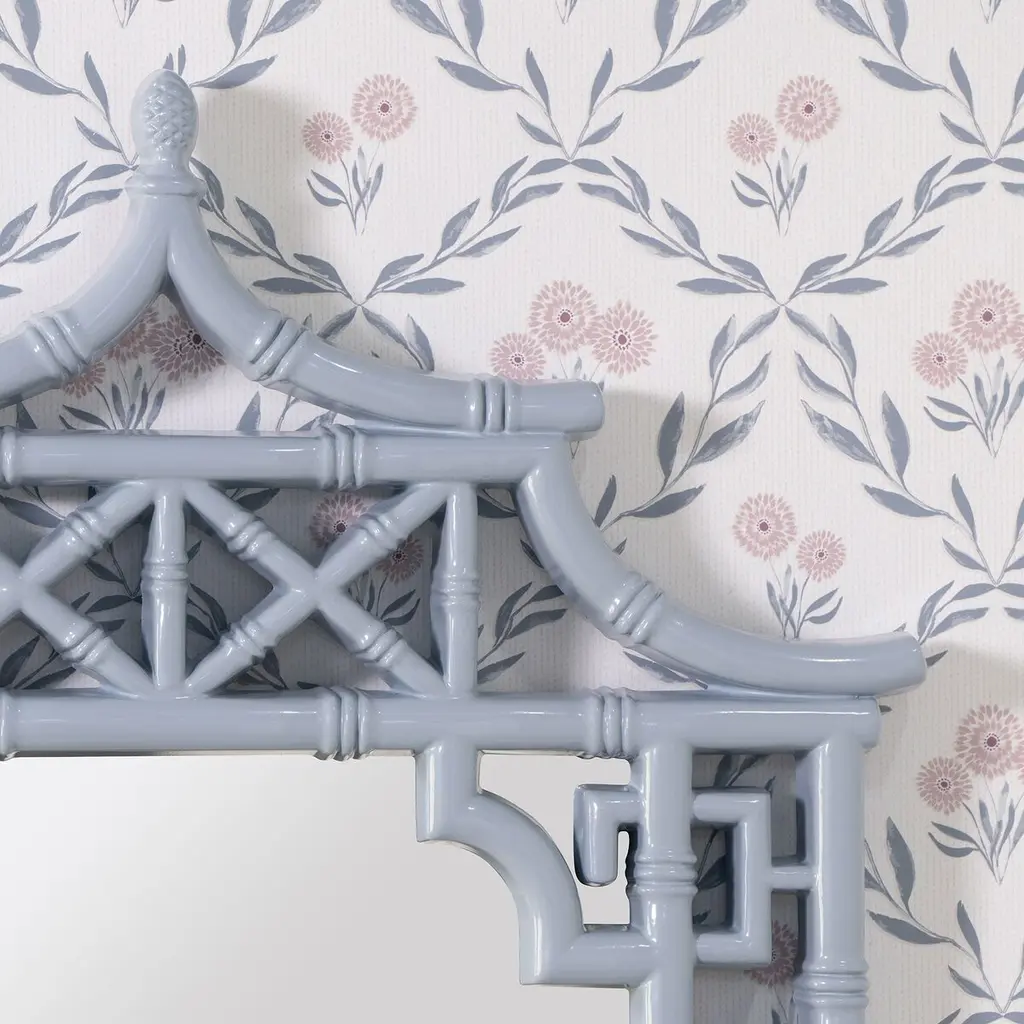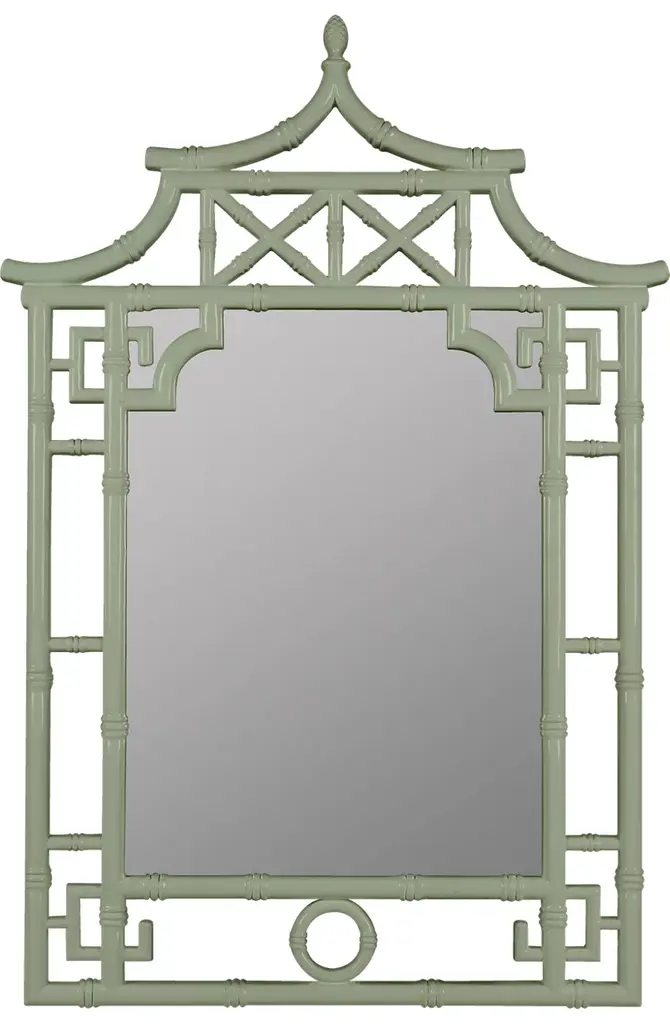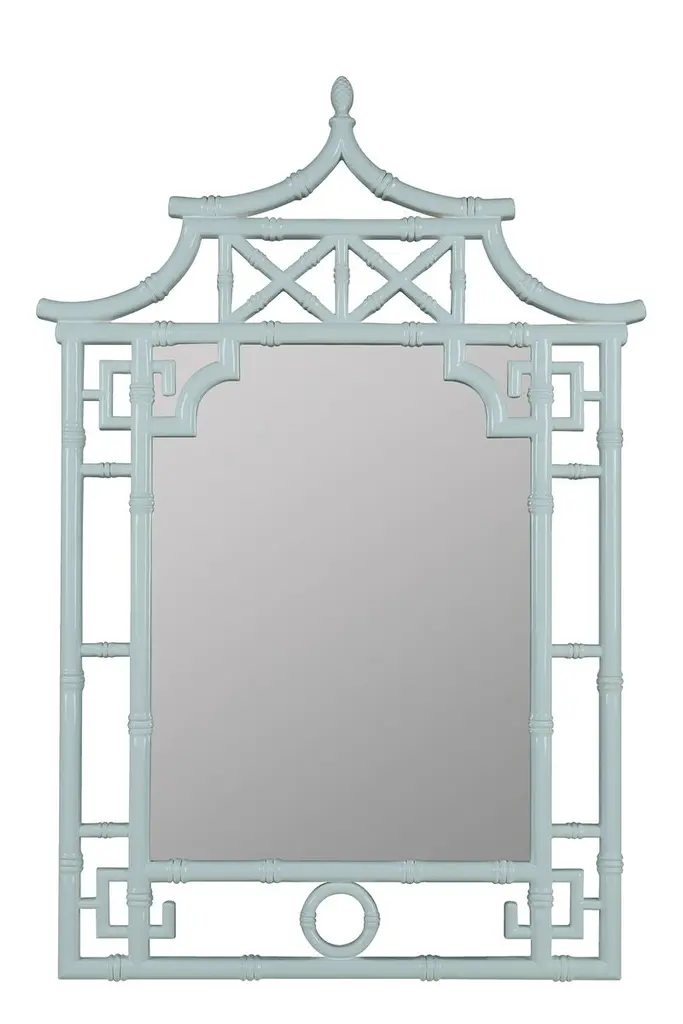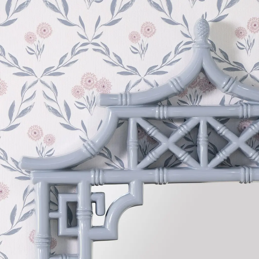 A modern take on traditional chinoiserie motifs, this impressive wall mirror is set in a pagoda frame with bamboo-style details.
