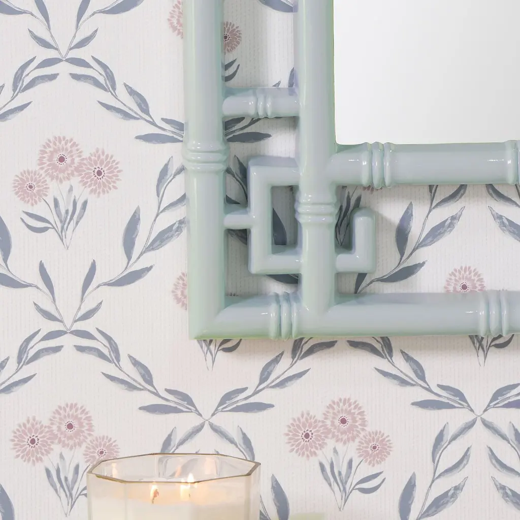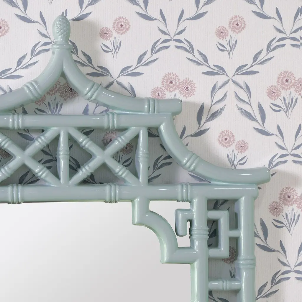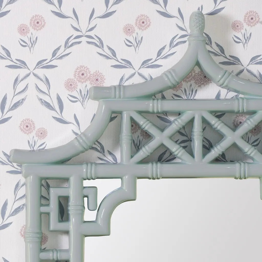 A modern take on traditional chinoiserie motifs, this impressive wall mirror is set in a pagoda frame with bamboo-style details.