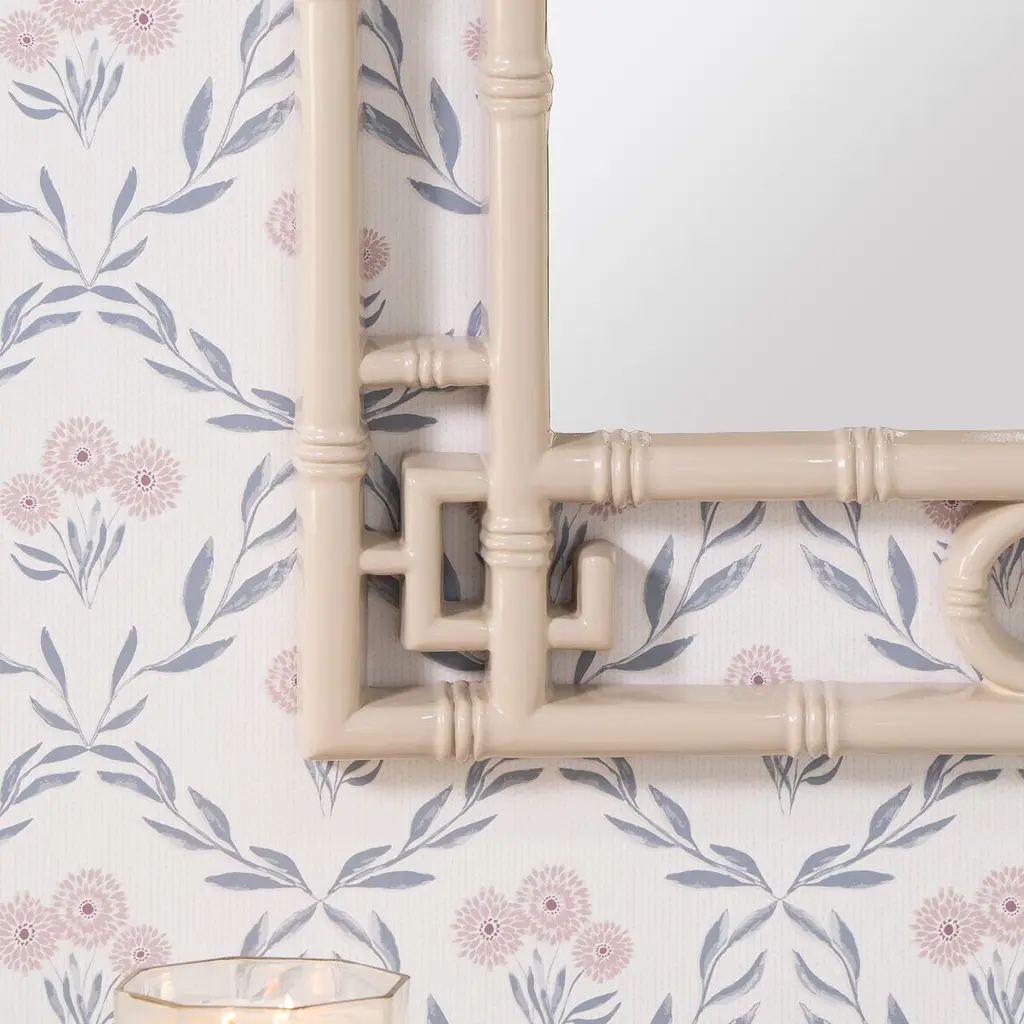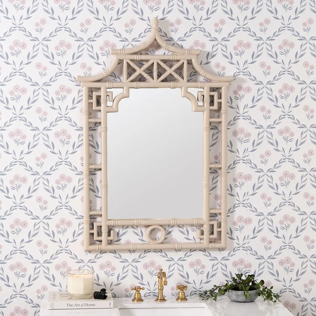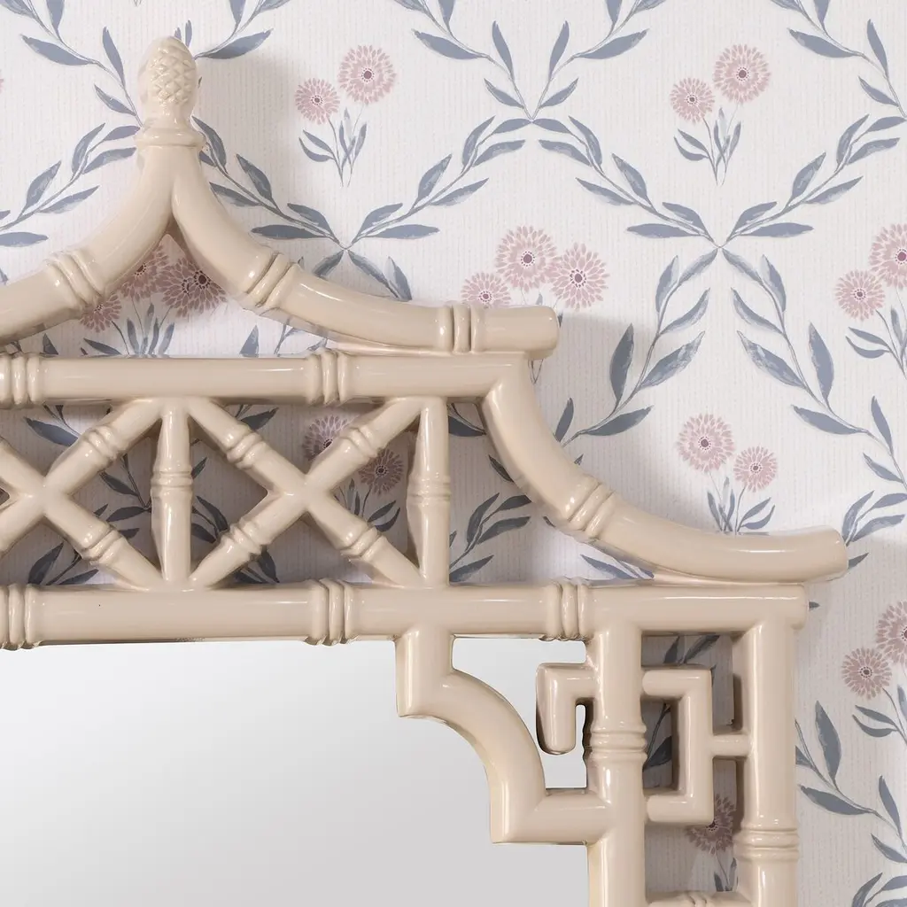 A modern take on traditional chinoiserie motifs, this impressive wall mirror is set in a pagoda frame with bamboo-style details.
