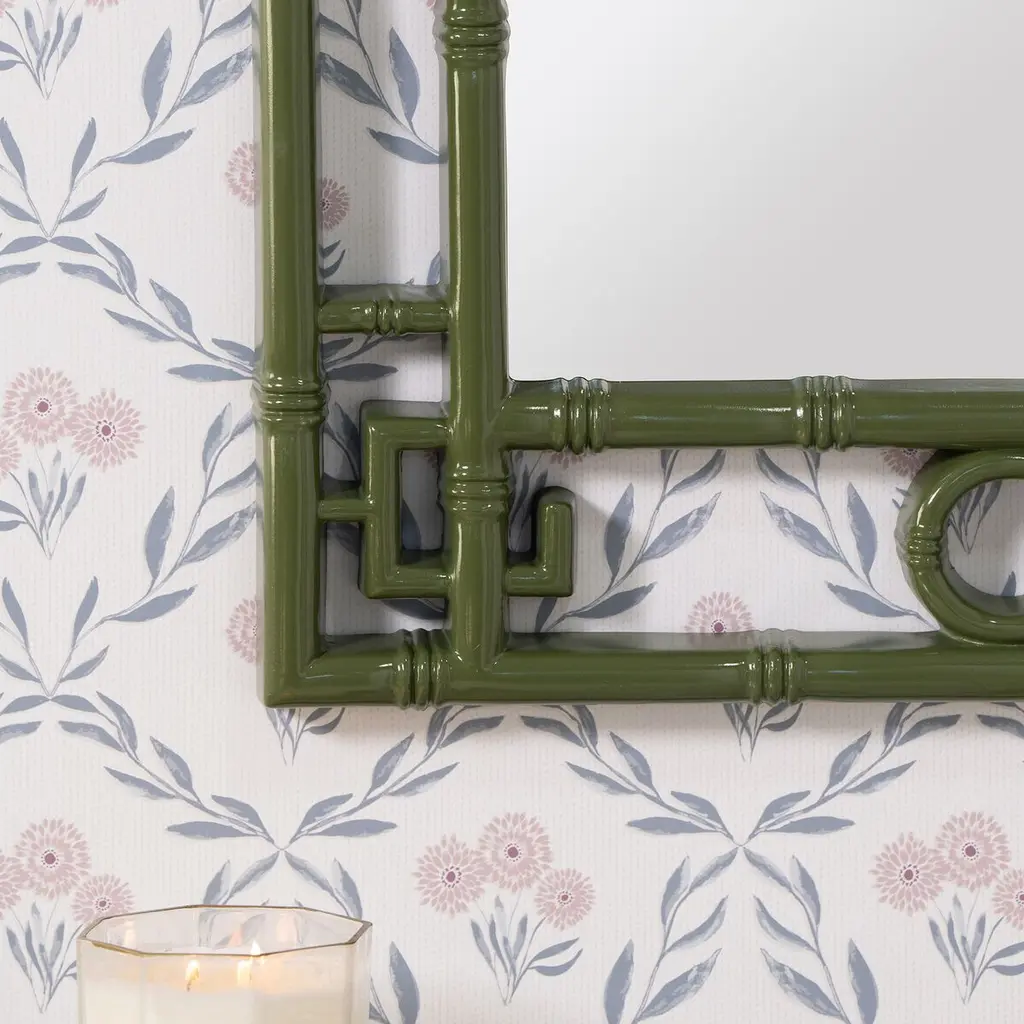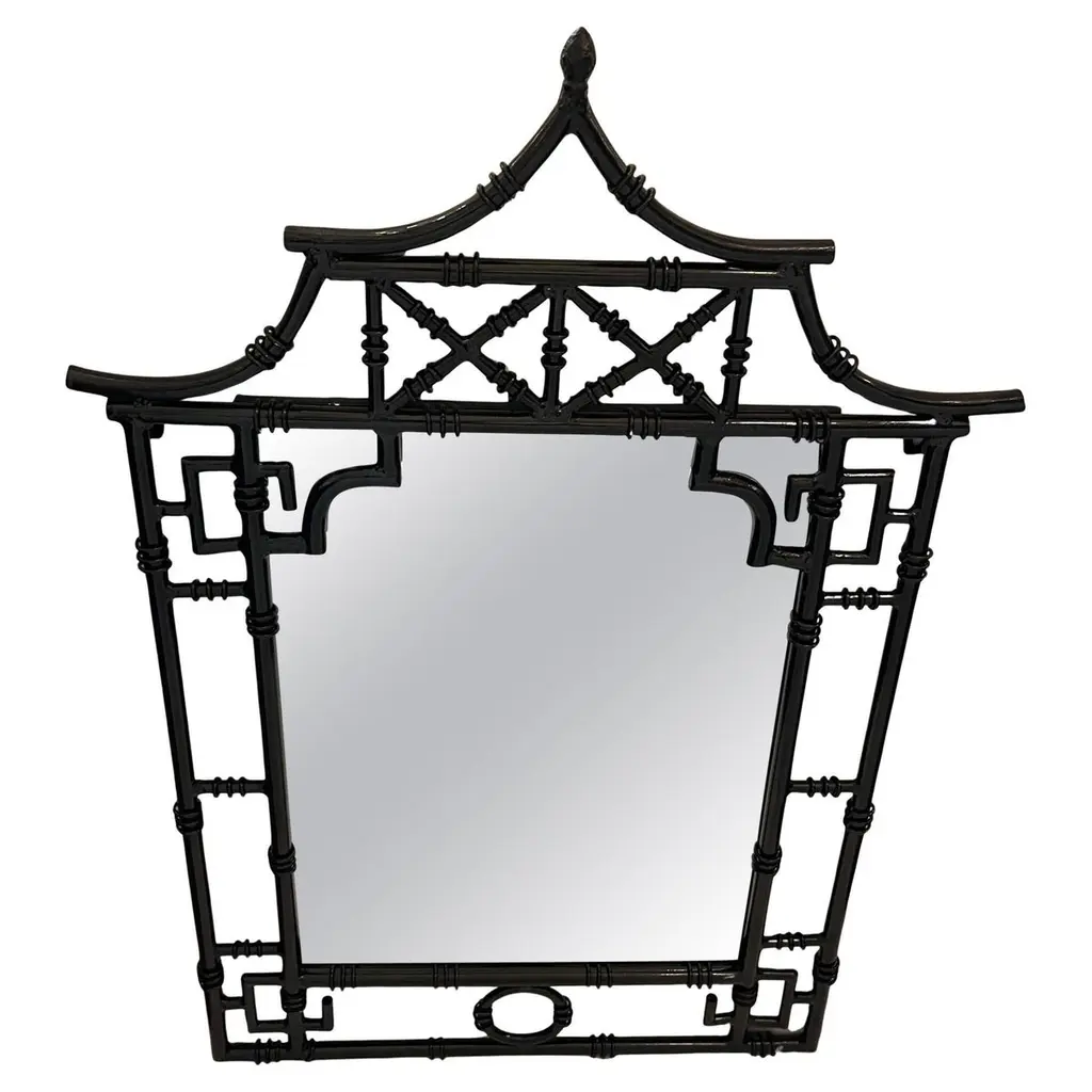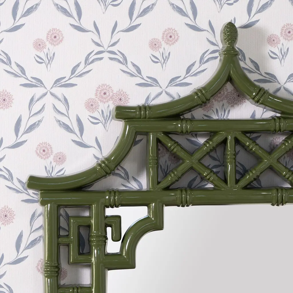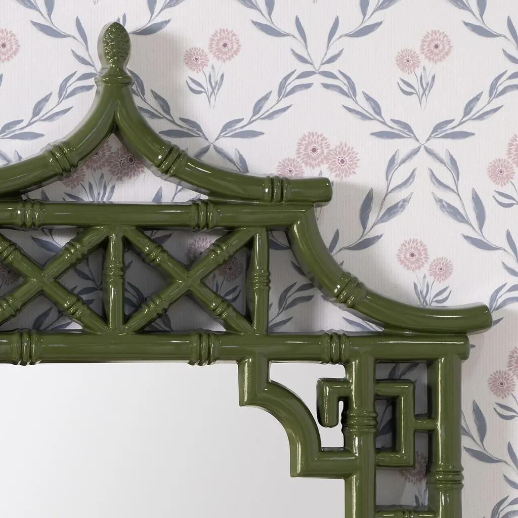 A modern take on traditional chinoiserie motifs, this impressive wall mirror is set in a pagoda frame with bamboo-style details.