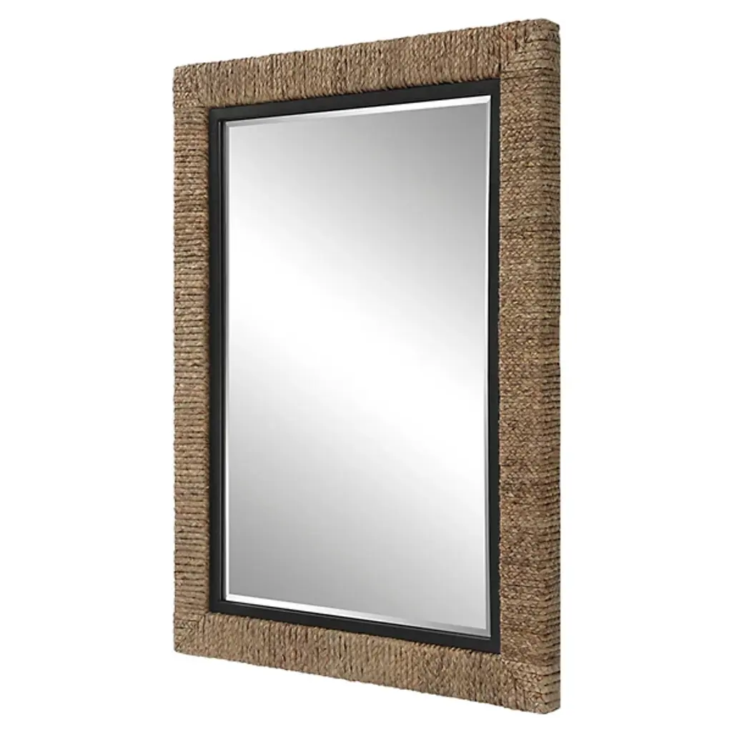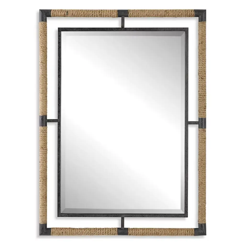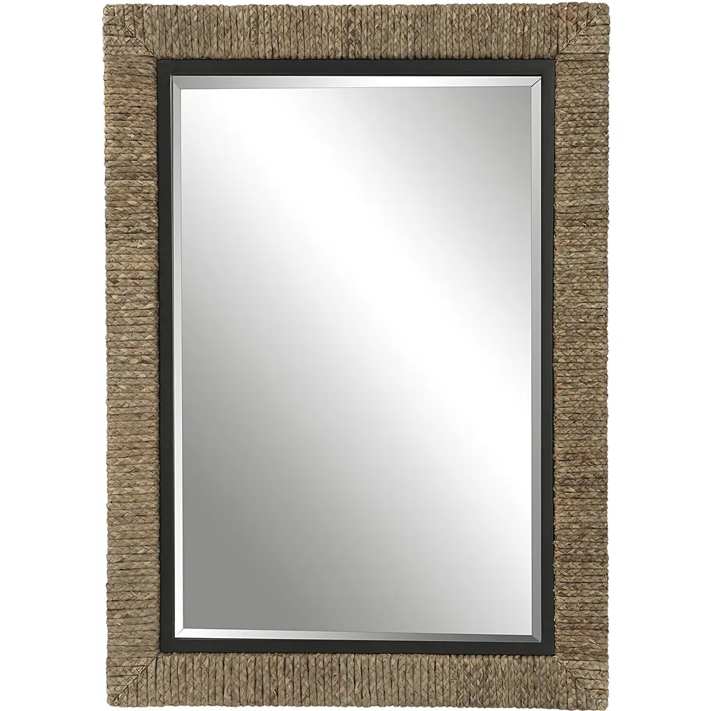 The Island Mirror from Uttermost showcases innovative material combinations through its natural braided straw wrapping and iron framework. The intricate weaving pattern of the straw creates rich textural interest, while iron elements provide structural support and visual contrast. The mirror’s versatile design allows for both horizontal and vertical mounting options, adapting to various spatial configurations. The careful integration of organic and industrial materials results in a mirror that bridges natural and architectural elements.