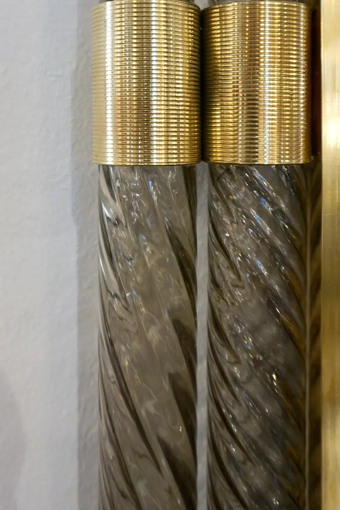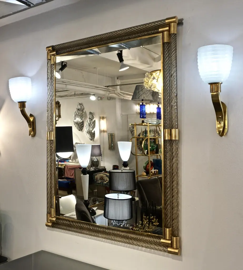 Italian Art Deco Design Twisted Gray Smoked Murano Glass & Gold Brass Mirror