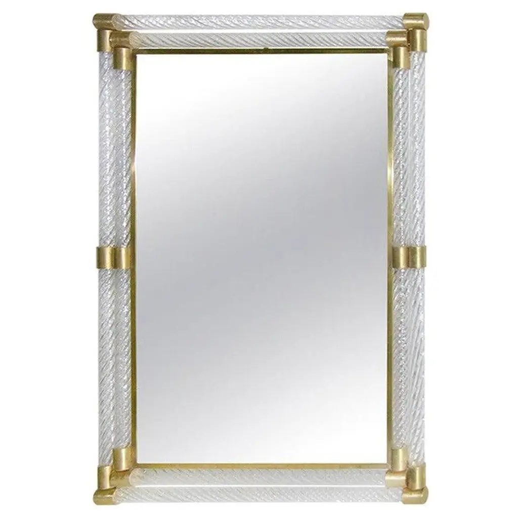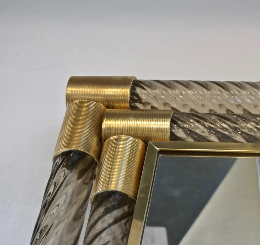 Bespoke customizable minimalist organic large mirror, simple yet sophisticated, entirely handcrafted in Italy, the interesting frame is composed of two Torchon twisted Murano glass pipes with a special grey smoked tint, in the style of Barovier, that plays with light creating reflections. They are encased in handcrafted reeded brass corners, the longer sides highlighted with central brass accents and they are edged with a brass border that elegantly surrounds the central mirror plate. Width of frame with brass edge: 4"Can be hung horizontally or vertically and personalized in sizes, also with additional pipes and glass colors: crystal, gold amber.