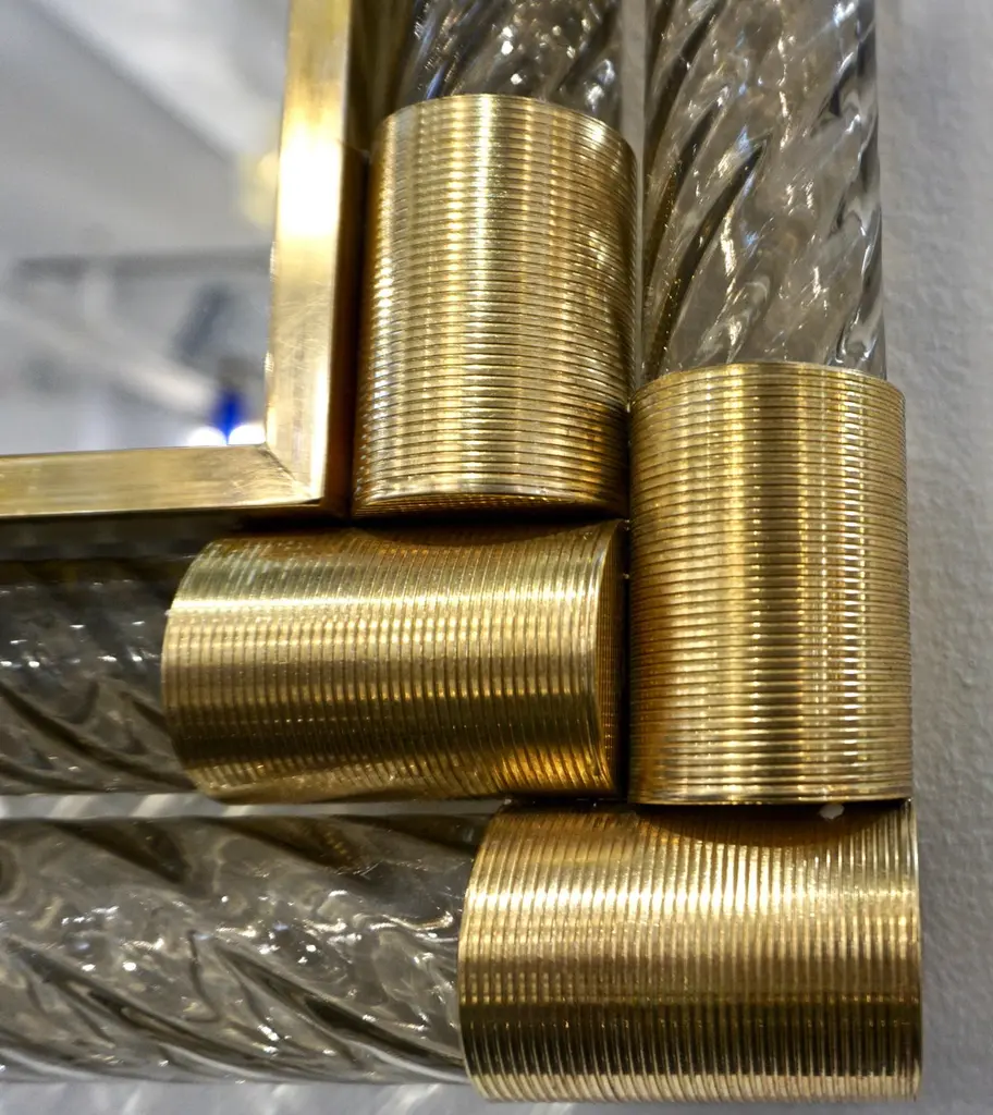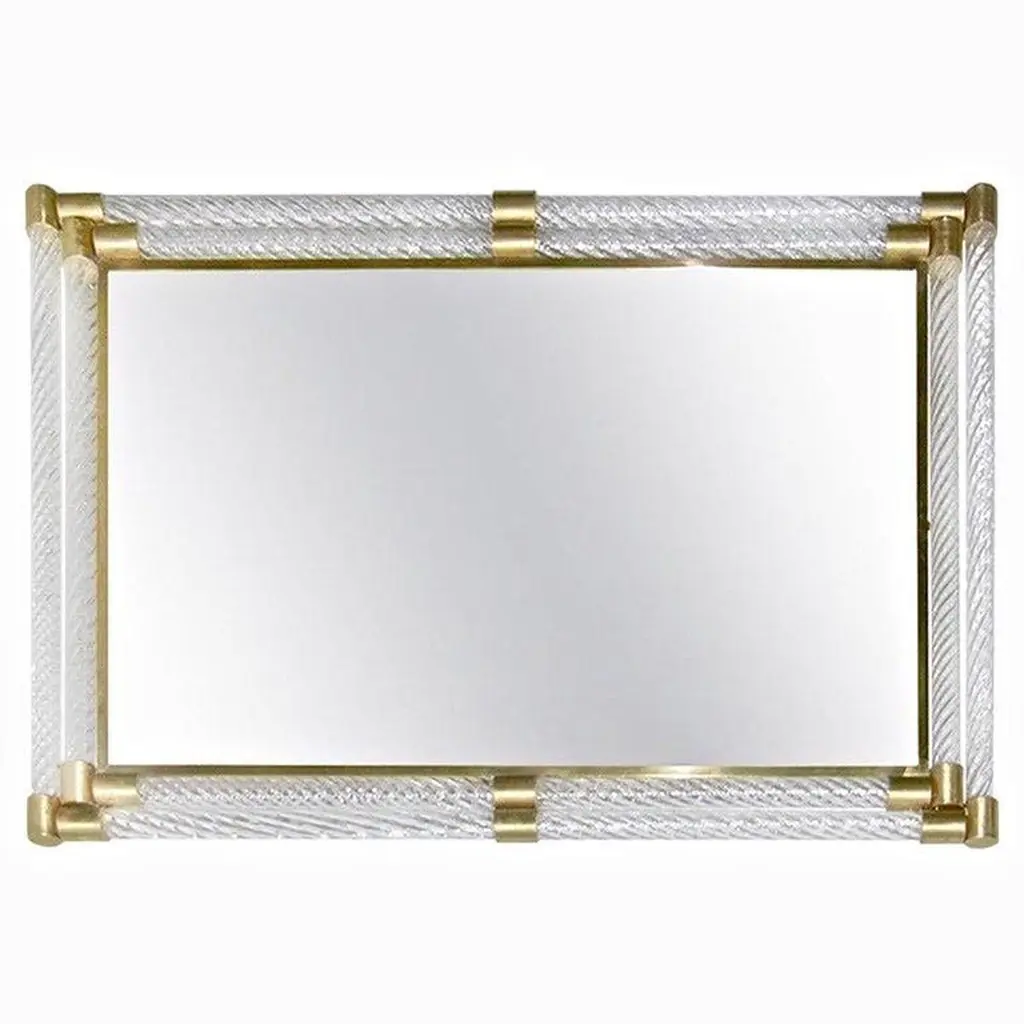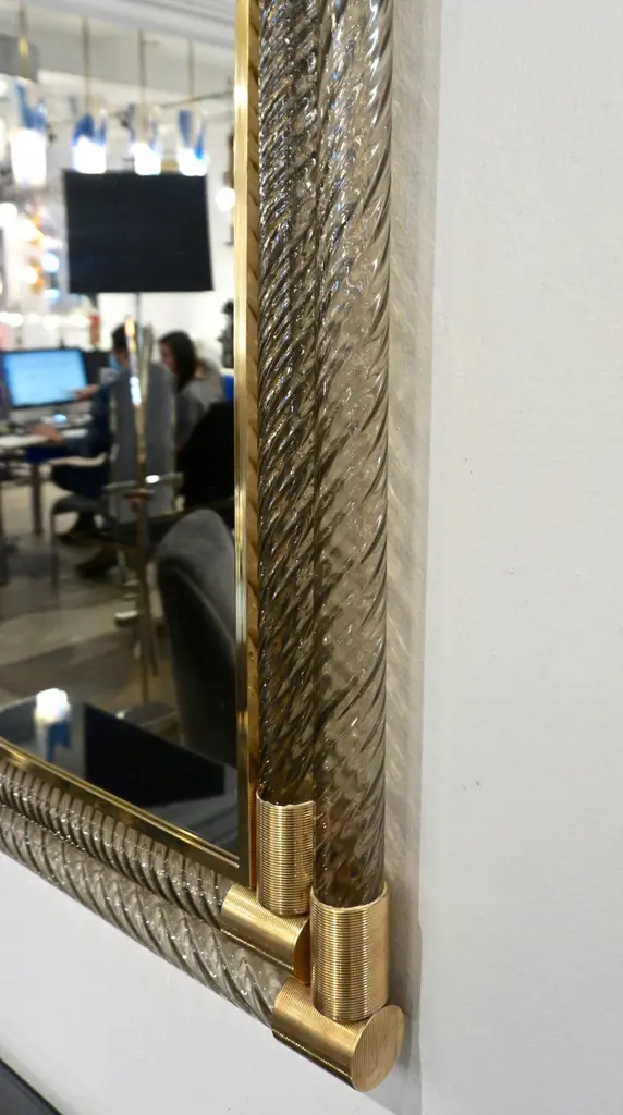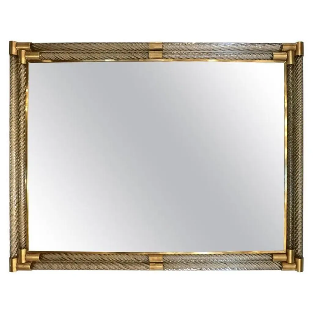 Bespoke customizable minimalist organic large mirror, simple yet sophisticated, entirely handcrafted in Italy, the interesting frame is composed of two Torchon twisted Murano glass pipes with a special grey smoked tint, in the style of Barovier, that plays with light creating reflections. They are encased in handcrafted reeded brass corners, the longer sides highlighted with central brass accents and they are edged with a brass border that elegantly surrounds the central mirror plate. Width of frame with brass edge: 4"Can be hung horizontally or vertically and personalized in sizes, also with additional pipes and glass colors: crystal, gold amber.