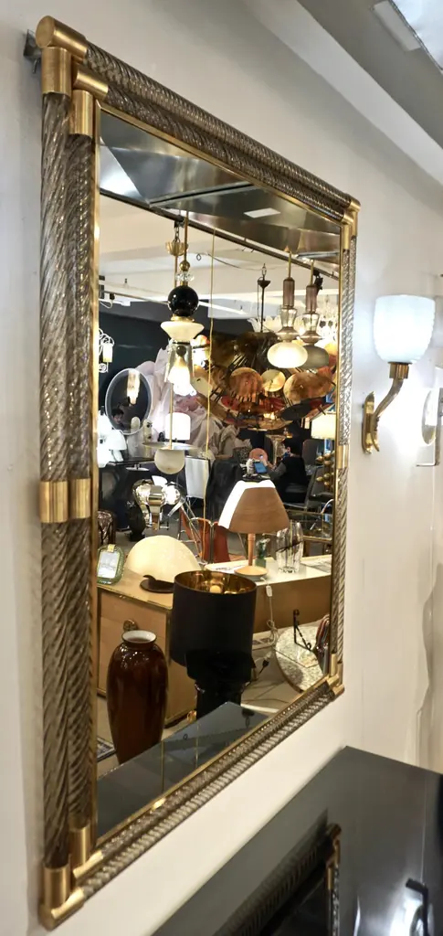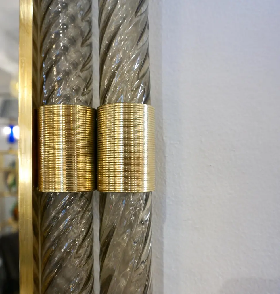 Italian Art Deco Design Twisted Gray Smoked Murano Glass & Gold Brass Mirror