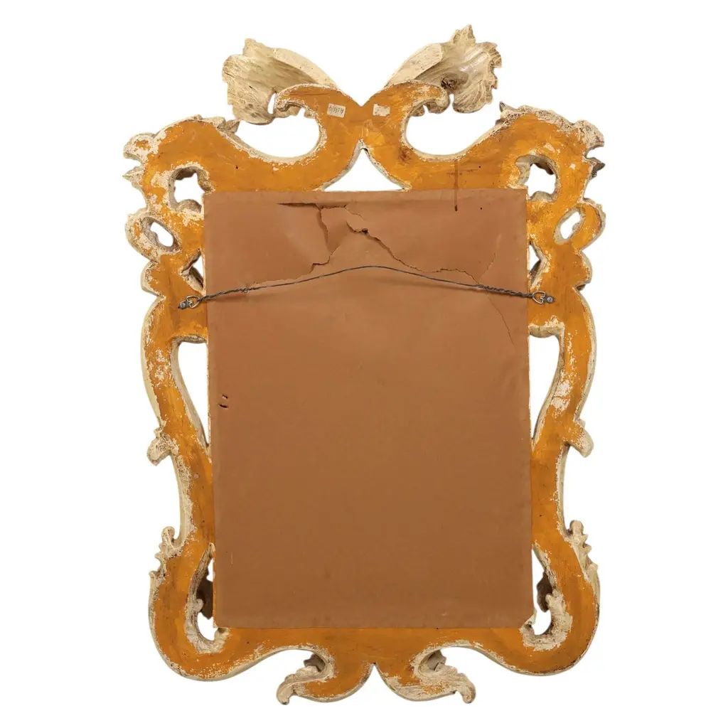 19th Century Italian Baroque Hollywood Regency Style Carved Wood Mirror. Mirror frame features an ornate three-dimensional scroll design that exudes opulence, while the deep relief carving creates depth and texture. It is finished in a warm, subtly distressed patina that adds character. Mirror dates to the 1940s glamour era. The scrolling foliate motif draws inspiration from Italian Baroque and Rococo traditions, reinterpreted through the glamorous lens of the Hollywood Regency style. Marked on verso "Made in Italy".This statement mirror is perfectly sized to add dramatic flair to an entryway, living area, or bedroom.