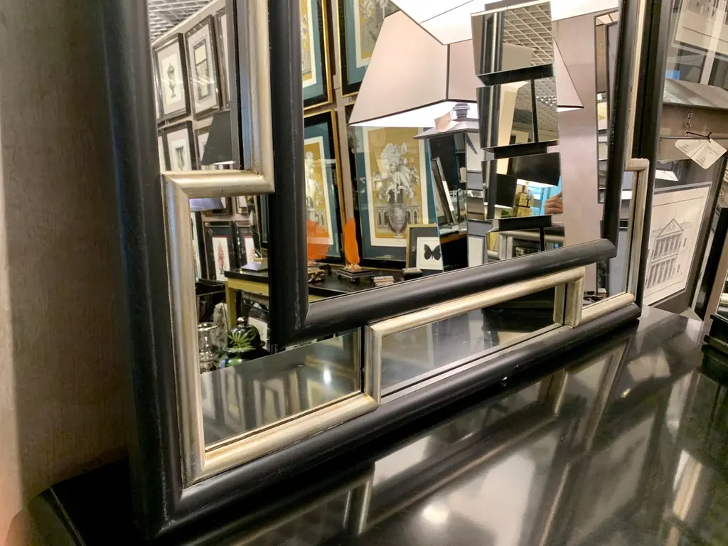 Handcrafted mirror with black and silver leaf detailing frame entirely produced in Florence , Italy by Artecornici design.This collection was produced in 2019 and presented during the last Edition of the Milan Furniture Fair.Artecornici design produces hand colored art prints, artisan frames, lightings, decorative accessories and furniture. All our products are designed and produced in Florence by Italian master craftsmen.