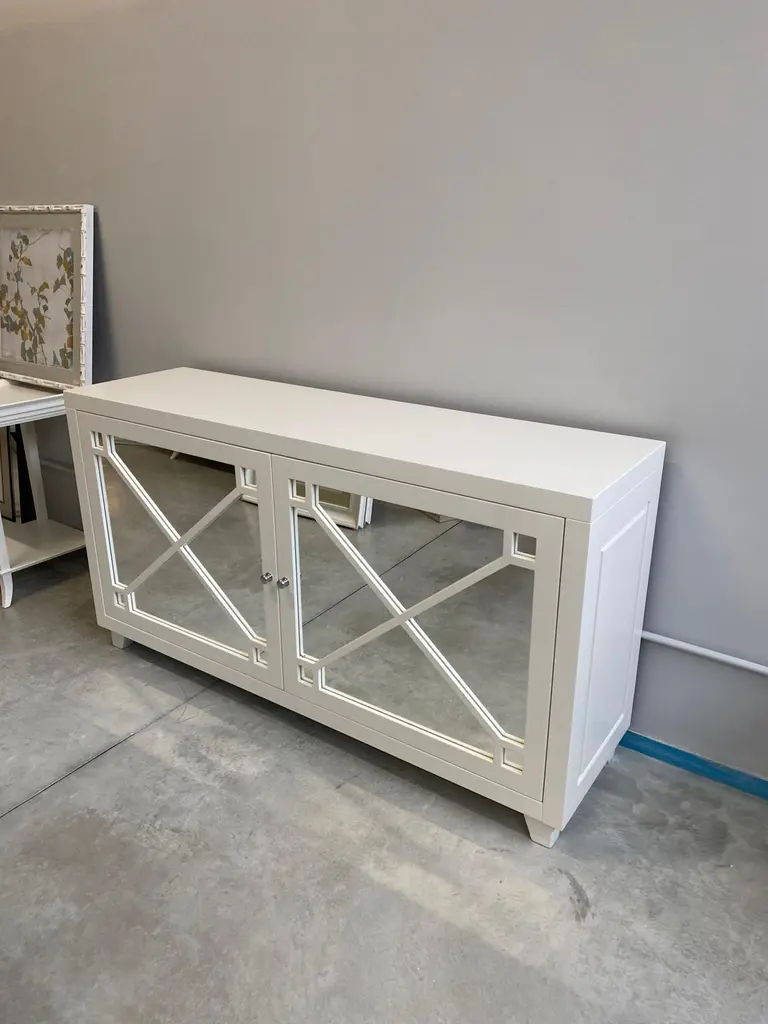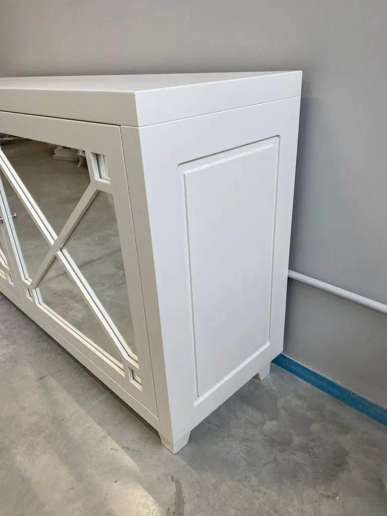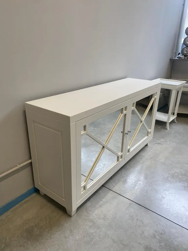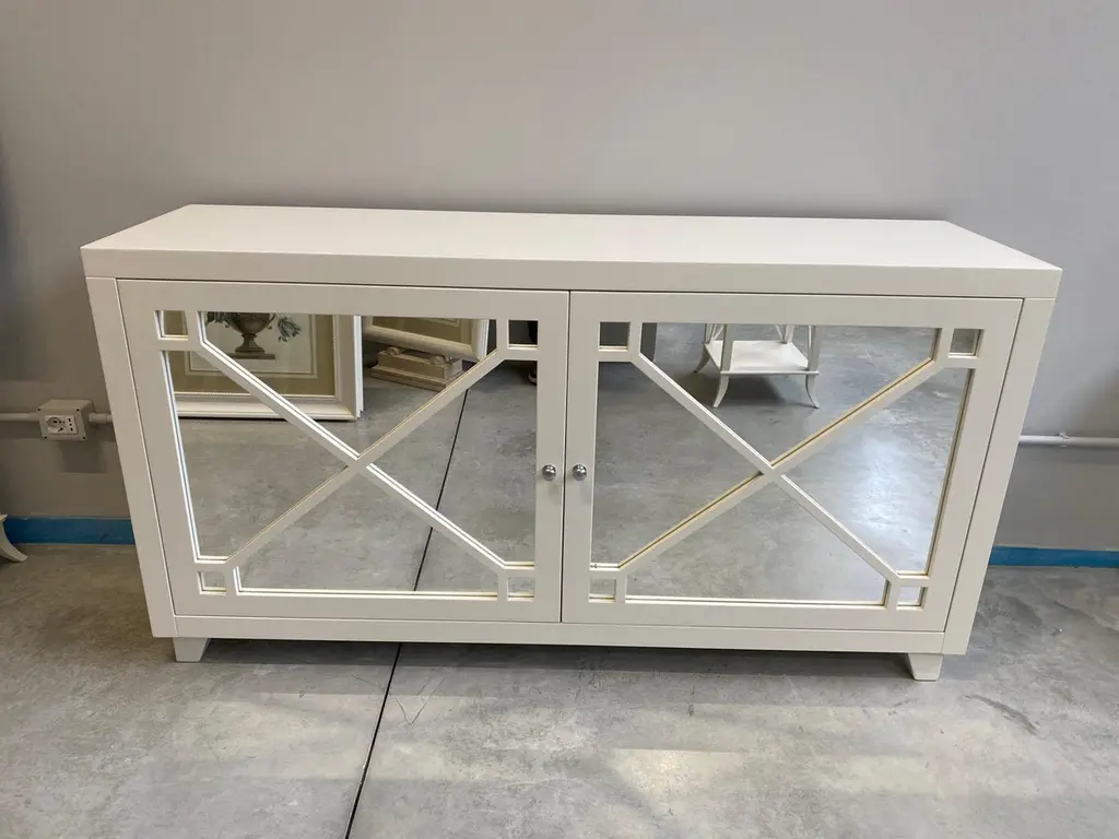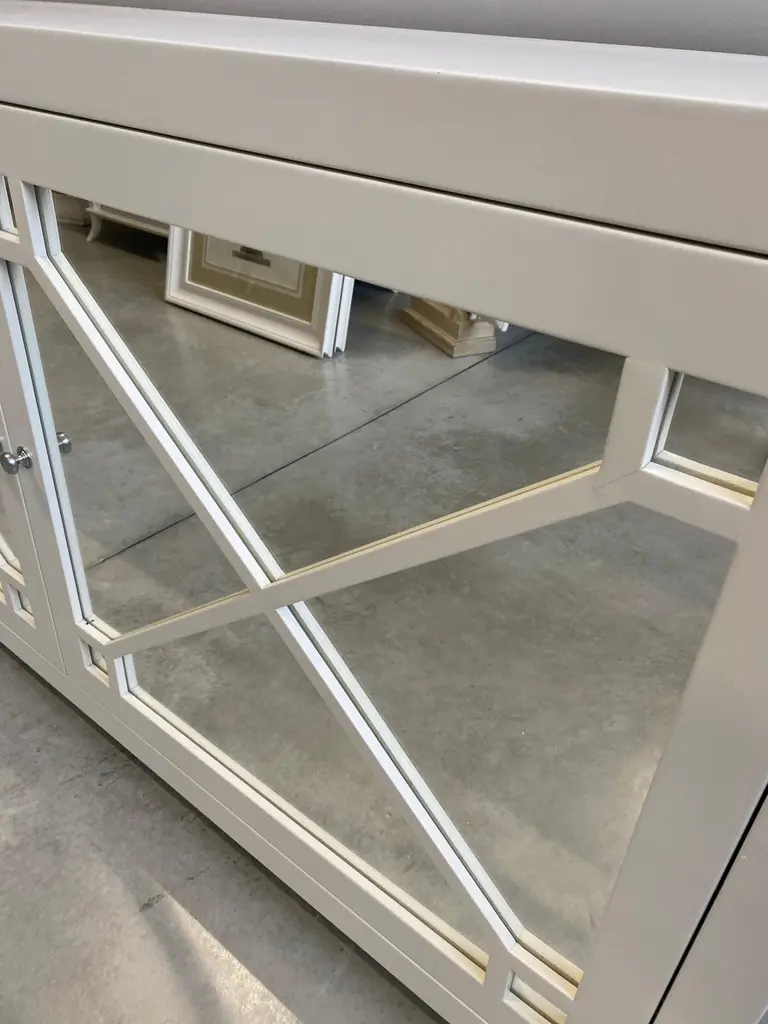 Beautiful two-door sideboard designed and handcrafted by us with structure and interior in solid wood, finishes in mirror. The entire wooden structure is completely lacquered in warm whiteIt is an object of high quality and refinement, ideal for giving elegance to your environments.An object of high quality and refinement aimed at an elite audience.It is possible to have variations in color as visible in the photos above.Measures: 160 x 45 x 85 cmProduction time around 10 weeks.We are at your disposal for any question, curiosity and clarification.With over 40 years of experience, Artecornici Design creates high quality frames and handcrafted products to decorate yours using precious woods and working with various types of finishes, offering a vast choice of models. All our products are designed and produced in Florence by Italian master craftsmen.