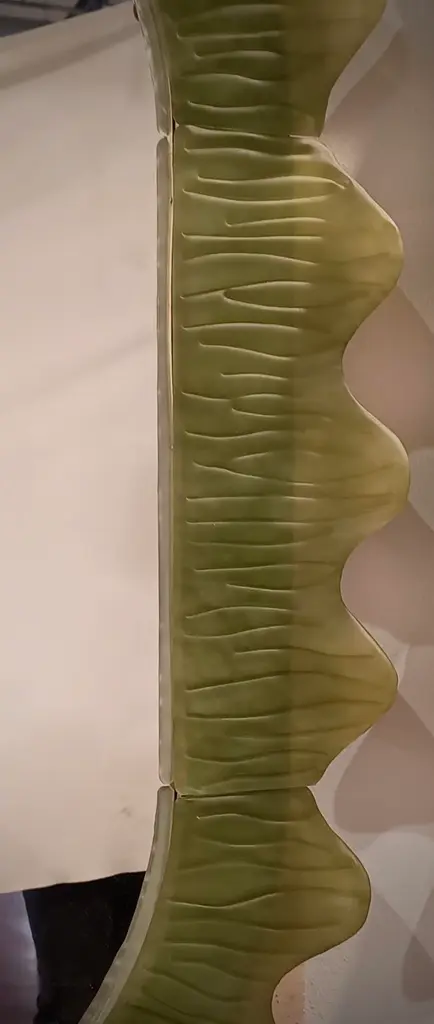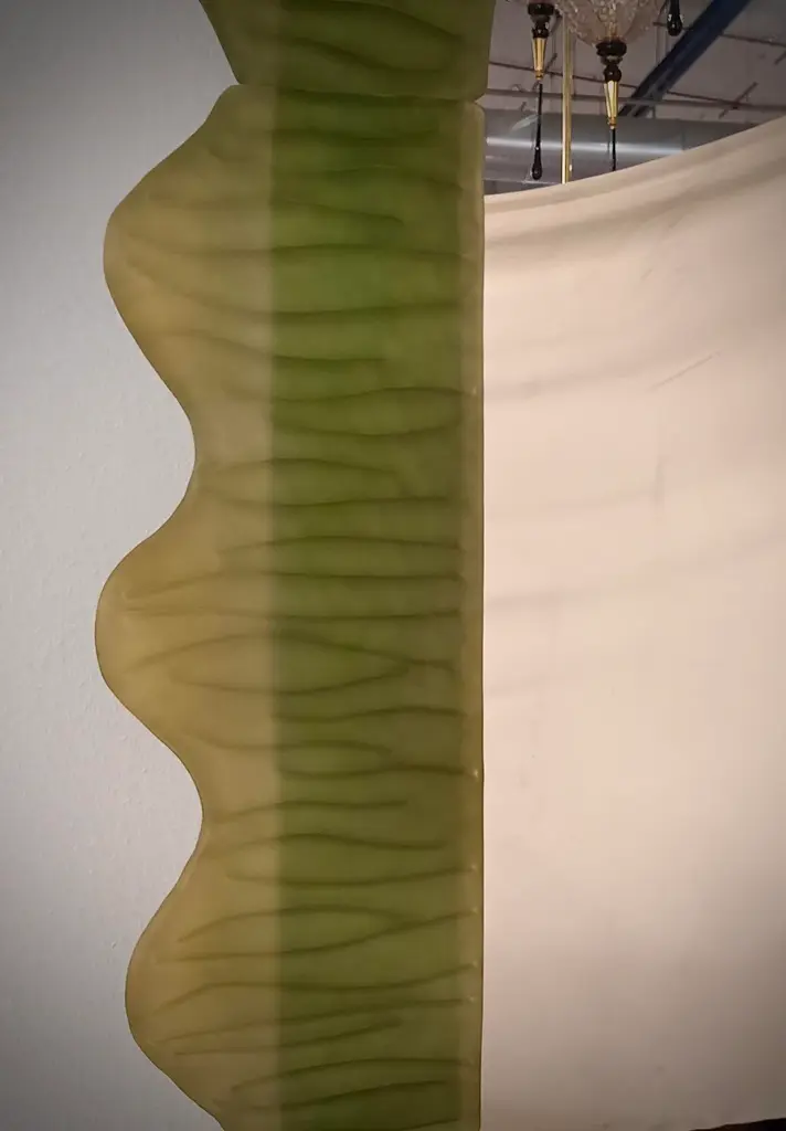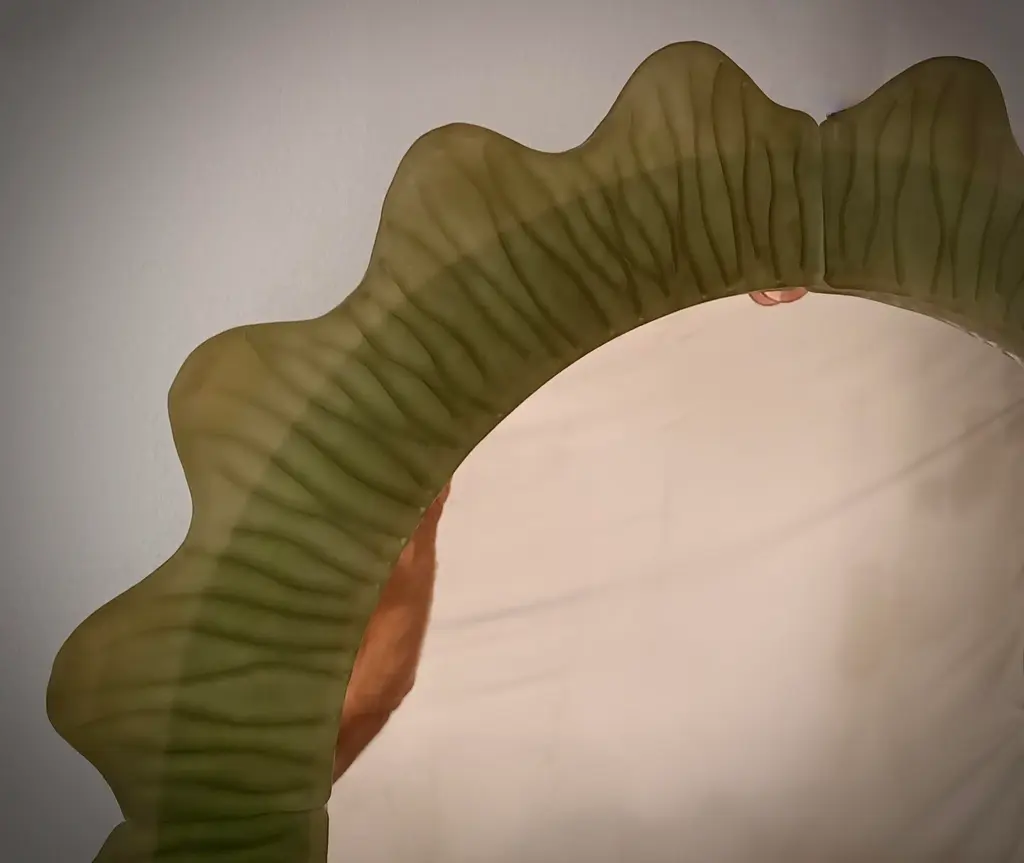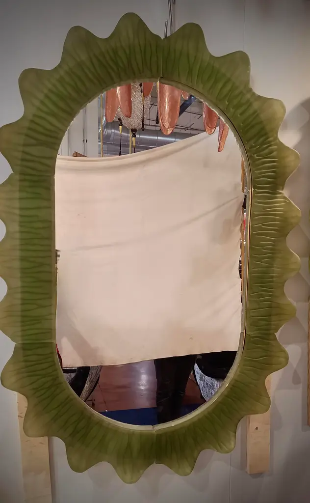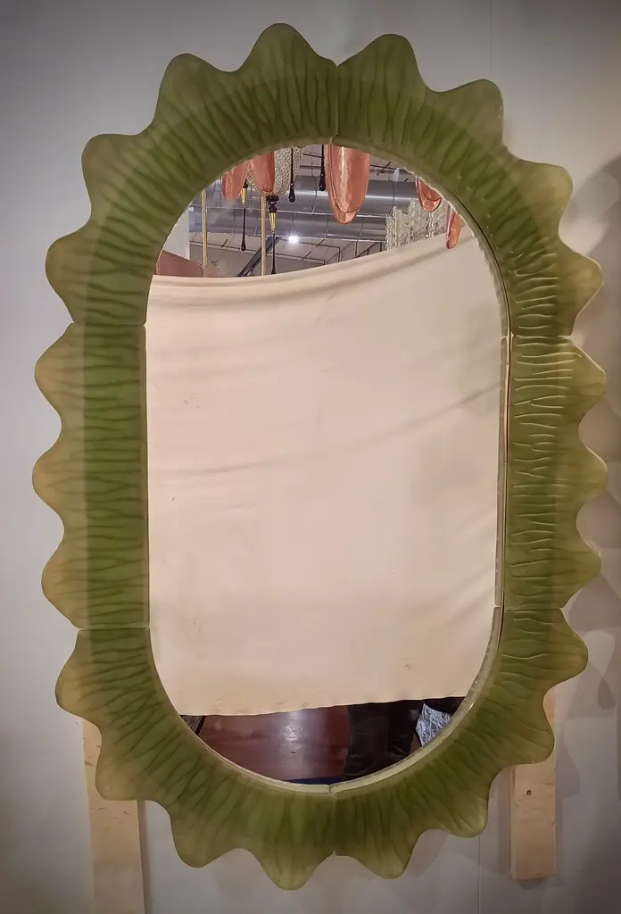Splendid green Murano glass mirror. A mirror that alone will furnish your home environment. Rich but tasteful, the mirror has a truly particular design, with a very beautiful shape of these glass sections. The mirror has a wooden rear structure, on which sections of green Murano glass have been mounted to form a rectangle with beveled sides, as shown in the photograph. The sections are of two different types, the straight ones and the curved ones that form the corners. The workmanship of the individual glass sections is very beautiful. The mirror is rectangular in shape and can be mounted both horizontally and vertically. Murano glass is olive green in color. Refinement and style as in the Murano style, unique pieces that always remain precious.