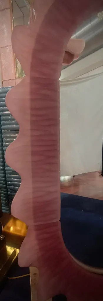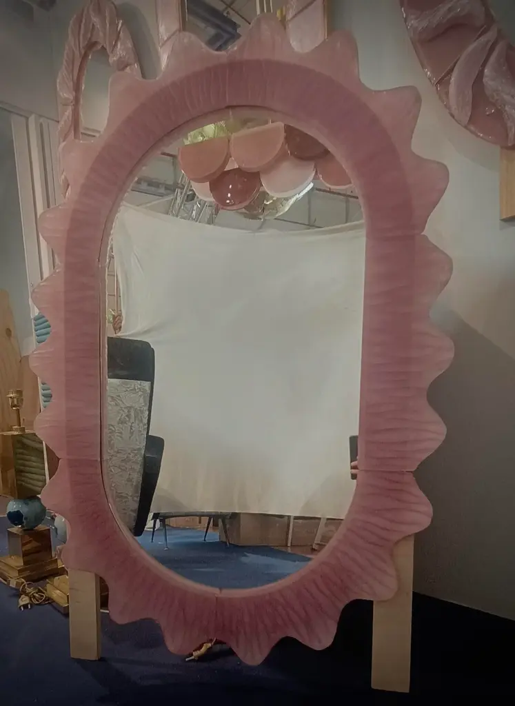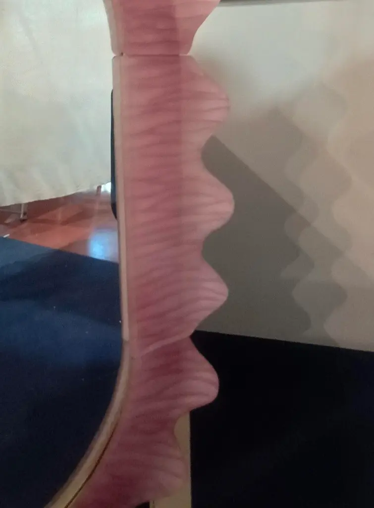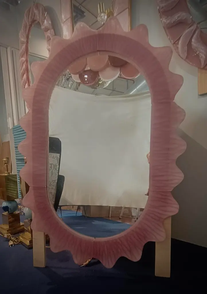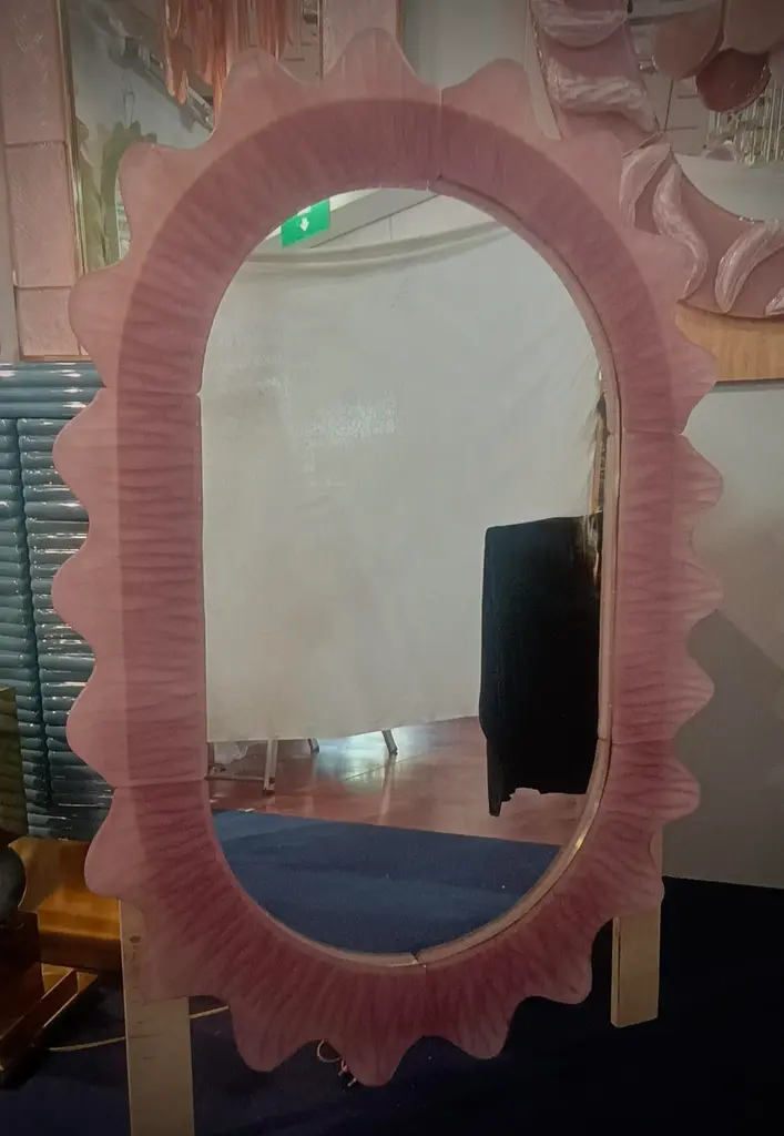 Splendid pink Murano glass mirror. A mirror that alone will furnish your home environment. Rich but tasteful, the mirror has a truly particular design, with a very beautiful shape of these glass sections. The mirror has a wooden rear structure, on which sections of pink Murano glass have been mounted to form a rectangle with beveled sides, as shown in the photograph. The sections are of two different types, the straight ones and the curved ones that form the corners. The workmanship of the individual glass sections is very beautiful. The mirror is rectangular in shape and can be mounted both horizontally and vertically. Murano glass is pink in color. Refinement and style as in the Murano style, unique pieces that always remain precious. Wear consistent with age and use.