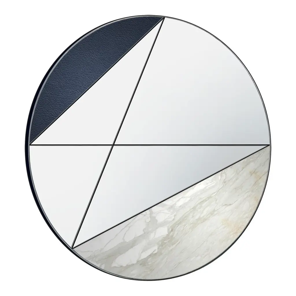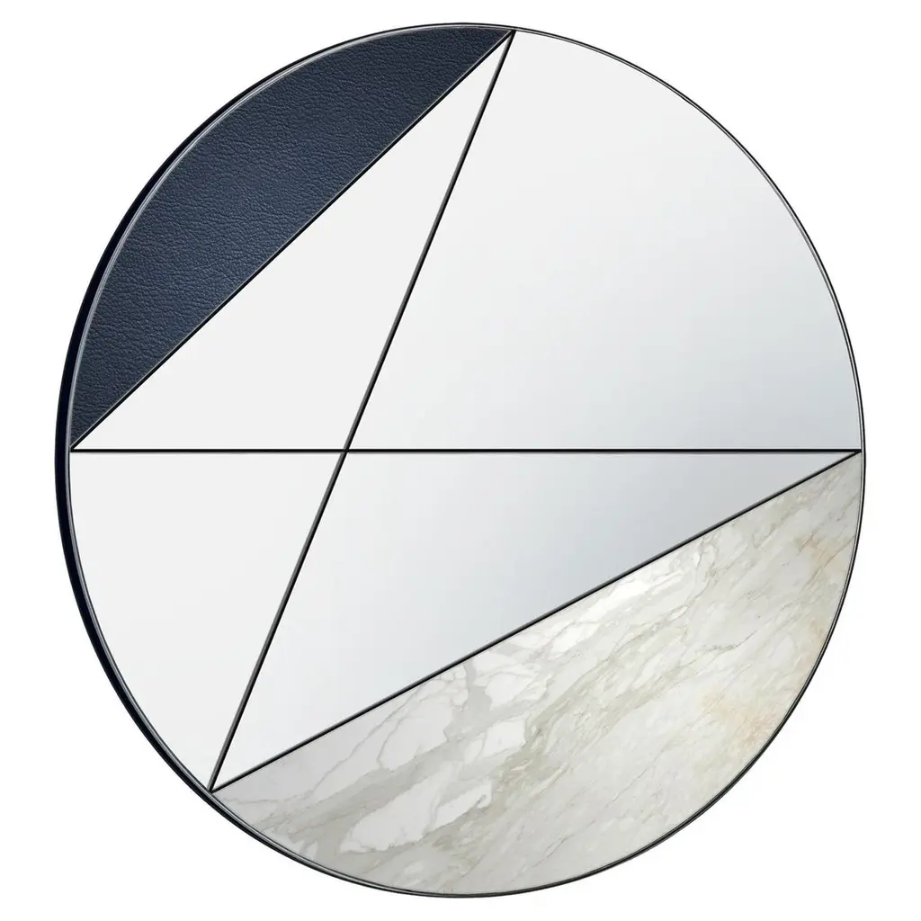 Itinera Clepsydra I 120 Wall Mirror by Atlas ProjectDimensions: D 3/5 x Ø 120 cm. Materials: Black powder painted iron, Calacatta Gold marble, blue leather, mirror, and wood.Available in different finishes and sizes. Please contact us.CLEPSYDRAAs a journey through the time, where lives can cross or never meet, the lines run along the surface of the Clepsydra mirrors, approaching the most diverse materials while preserving their uniqueness.Entirely crafted by hand, these amazing mirrors were born by the harmonious synthesis of Italian taste creativity and deep technical knowledge of the materials. Geometry and colors combine to create a stunning collection of must-have pieces.Our ProjectThe synergy between a thirty-year Italian craft experience and an original design, based on the need to research and develop topics up with the new aesthetic trends, gives birth to Atlasproject, an exclusive furniture collection conceived by the designer Massimiliano Giordano.Born and developed first in Copenhagen, then in Vienna and finally in Rome, the project is – as a matter of fact - a journey of contamination and encounter between the many cultures of the European Design.The production is focused on a dynamic dialogue between geometries and materials, which leads to collections of deep impact and elegance. Every piece merges essential geometric shapes with the most surprising materials, textures, and colors, as the result of a careful selection of natural materials and hand-processed metals.The Atlasproject collections are entirely made in Italy, where the tradition of artisanality is still a deep value, to ensure high-quality and long-life products.Of Neapolitan origins, Massimiliano Giordano grew up inthe family’s artistic atelier.The artisan knowledge and the design skills lead him to Atlasproject, a creative container inspired by the journey, leit motiv of his personal and professional life. In fact, the designer leaves from Naples towards Copenhagen, where he will stay for five years, and then for Vienna for five years more in the heart of the Mitteleuropean design, and finally in Rome, where he currently lives and works.The amazing connections between the encountered design souls actually represent the most significant stylistic figure of his works.