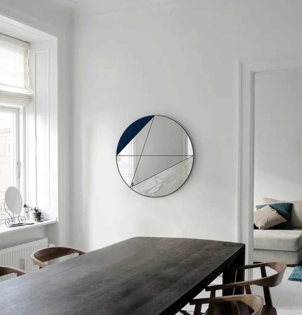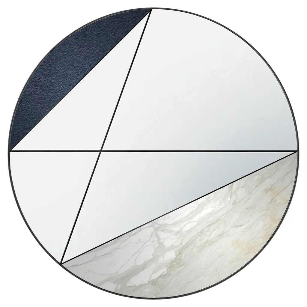 Itinera Clepsydra I 90 Wall Mirror by Atlas ProjectDimensions: D 3/5 x Ø 90 cm. Materials: Black powder painted iron, Calacatta Gold marble, blue leather, mirror, and wood.Available in different finishes and sizes. Please contact us.CLEPSYDRAAs a journey through the time, where lives can cross or never meet, the lines run along the surface of the Clepsydra mirrors, approaching the most diverse materials while preserving their uniqueness.Entirely crafted by hand, these amazing mirrors were born by the harmonious synthesis of Italian taste creativity and deep technical knowledge of the materials. Geometry and colors combine to create a stunning collection of must-have pieces.Our ProjectThe synergy between a thirty-year Italian craft experience and an original design, based on the need to research and develop topics up with the new aesthetic trends, gives birth to Atlasproject, an exclusive furniture collection conceived by the designer Massimiliano Giordano.Born and developed first in Copenhagen, then in Vienna and finally in Rome, the project is – as a matter of fact - a journey of contamination and encounter between the many cultures of the European Design.The production is focused on a dynamic dialogue between geometries and materials, which leads to collections of deep impact and elegance. Every piece merges essential geometric shapes with the most surprising materials, textures, and colors, as the result of a careful selection of natural materials and hand-processed metals.The Atlasproject collections are entirely made in Italy, where the tradition of artisanality is still a deep value, to ensure high-quality and long-life products.Of Neapolitan origins, Massimiliano Giordano grew up inthe family’s artistic atelier.The artisan knowledge and the design skills lead him to Atlasproject, a creative container inspired by the journey, leit motiv of his personal and professional life. In fact, the designer leaves from Naples towards Copenhagen, where he will stay for five years, and then for Vienna for five years more in the heart of the Mitteleuropean design, and finally in Rome, where he currently lives and works.The amazing connections between the encountered design souls actually represent the most significant stylistic figure of his works.