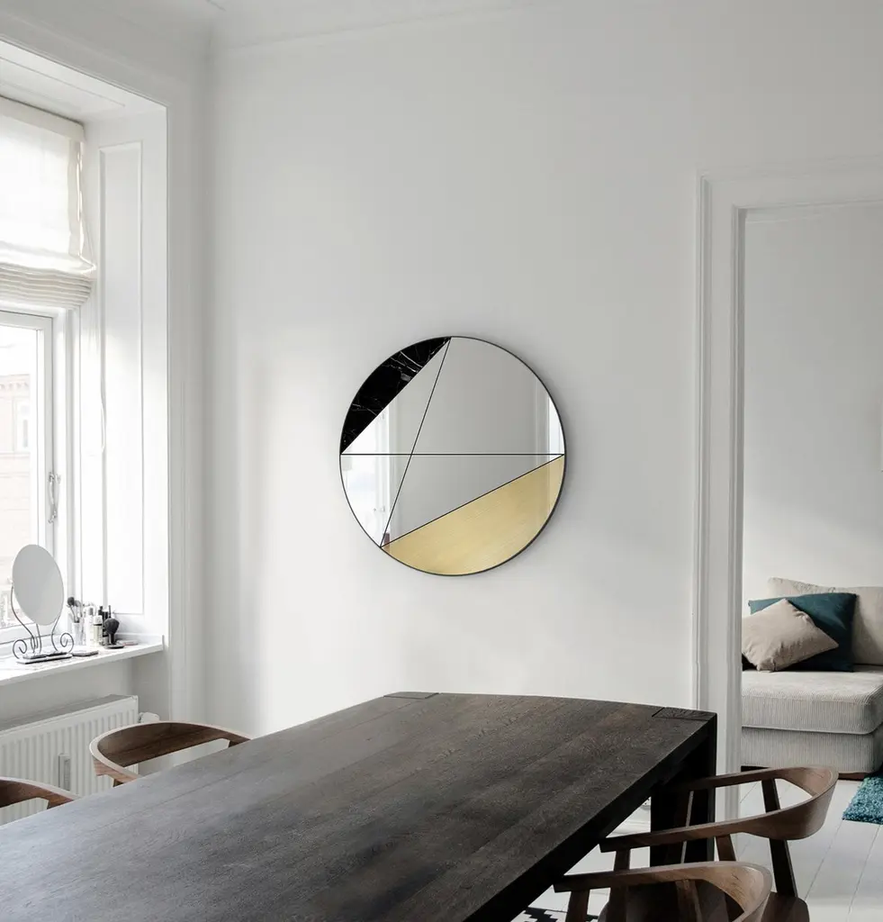 Itinera Clepsydra III 120 Wall Mirror by Atlas ProjectDimensions: D 3/5 x Ø 120 cm. Materials: Black powder painted iron, Black Marquinia marble, brushed brass, mirror, and wood.Available in different finishes and sizes. Please contact us.CLEPSYDRAAs a journey through the time, where lives can cross or never meet, the lines run along the surface of the Clepsydra mirrors, approaching the most diverse materials while preserving their uniqueness.Entirely crafted by hand, these amazing mirrors were born by the harmonious synthesis of Italian taste creativity and deep technical knowledge of the materials. Geometry and colors combine to create a stunning collection of must-have pieces.Our ProjectThe synergy between a thirty-year Italian craft experience and an original design, based on the need to research and develop topics up with the new aesthetic trends, gives birth to Atlasproject, an exclusive furniture collection conceived by the designer Massimiliano Giordano.Born and developed first in Copenhagen, then in Vienna and finally in Rome, the project is – as a matter of fact - a journey of contamination and encounter between the many cultures of the European Design.The production is focused on a dynamic dialogue between geometries and materials, which leads to collections of deep impact and elegance. Every piece merges essential geometric shapes with the most surprising materials, textures, and colors, as the result of a careful selection of natural materials and hand-processed metals.The Atlasproject collections are entirely made in Italy, where the tradition of artisanality is still a deep value, to ensure high-quality and long-life products.Of Neapolitan origins, Massimiliano Giordano grew up inthe family’s artistic atelier.The artisan knowledge and the design skills lead him to Atlasproject, a creative container inspired by the journey, leit motiv of his personal and professional life. In fact, the designer leaves from Naples towards Copenhagen, where he will stay for five years, and then for Vienna for five years more in the heart of the Mitteleuropean design, and finally in Rome, where he currently lives and works.The amazing connections between the encountered design souls actually represent the most significant stylistic figure of his works.