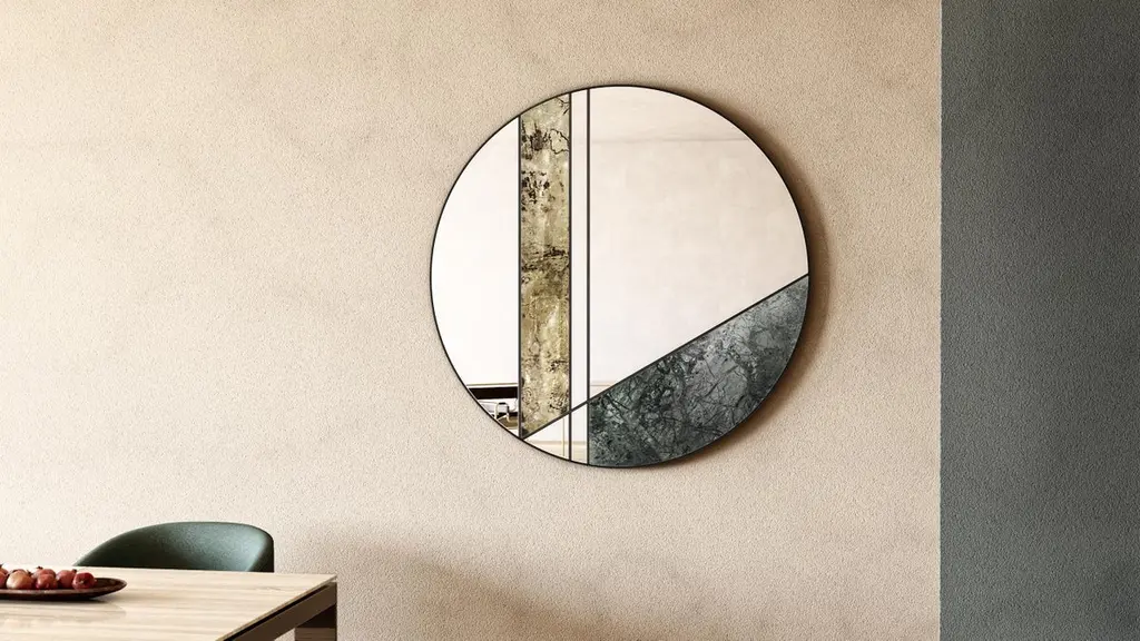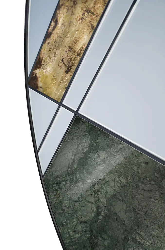 Itinera Lamina I 80 Wall Mirror by Atlas ProjectDimensions: D 3/5 x Ø 80 cm. Materials: Black powder painted iron, Green Guatemala marble, antique brass, mirror, and wood.Available in different finishes and sizes. Please contact us.LAMINAA refined play of slopes and inclined planes that intersect and cut each other characterizes this mirror with a dynamic and futuristic design. The care in the realization and the research of the finest materials represent the distinctive feature of this mirror, which will enrich any environment with its precious uniqueness.Our ProjectThe synergy between a thirty-year Italian craft experience and an original design, based on the need to research and develop topics up with the new aesthetic trends, gives birth to Atlasproject, an exclusive furniture collection conceived by the designer Massimiliano Giordano.Born and developed first in Copenhagen, then in Vienna and finally in Rome, the project is – as a matter of fact - a journey of contamination and encounter between the many cultures of the European Design.The production is focused on a dynamic dialogue between geometries and materials, which leads to collections of deep impact and elegance. Every piece merges essential geometric shapes with the most surprising materials, textures, and colors, as the result of a careful selection of natural materials and hand-processed metals.The Atlasproject collections are entirely made in Italy, where the tradition of artisanality is still a deep value, to ensure high-quality and long-life products.Of Neapolitan origins, Massimiliano Giordano grew up inthe family’s artistic atelier.The artisan knowledge and the design skills lead him to Atlasproject, a creative container inspired by the journey, leit motiv of his personal and professional life. In fact, the designer leaves from Naples towards Copenhagen, where he will stay for five years, and then for Vienna for five years more in the heart of the Mitteleuropean design, and finally in Rome, where he currently lives and works.The amazing connections between the encountered design souls actually represent the most significant stylistic figure of his works.