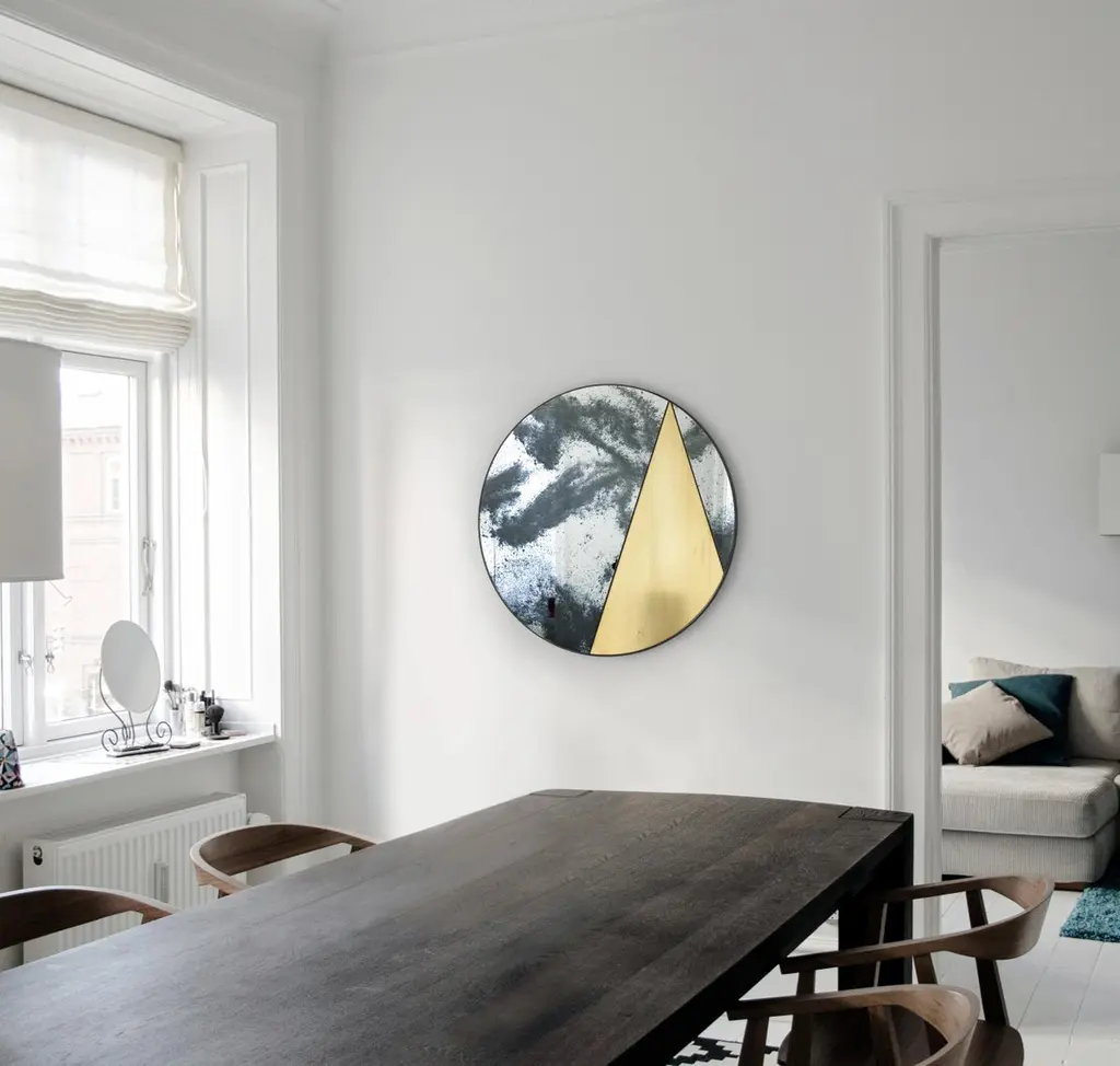 Itinera Res Lunare II 80 Wall Mirror by Atlas ProjectDimensions: D 3/5 x Ø 80 cm. Materials: Black powder painted iron, brushed brass, mirror, and wood.Available in different finishes and sizes. Please contact us.ITINERAThe material fills the space. Elegantly combined materials give you a perfect balance of richness and simplicity.The Itinera Collection lends itself to customization, through the combination of materials and colors. For that purpose, we have selected a wide range of fine materials, each with its unique characteristics, to draw on to create your Itinera product according to your taste and needs.Our ProjectThe synergy between a thirty-year Italian craft experience and an original design, based on the need to research and develop topics up with the new aesthetic trends, gives birth to Atlasproject, an exclusive furniture collection conceived by the designer Massimiliano Giordano.Born and developed first in Copenhagen, then in Vienna and finally in Rome, the project is – as a matter of fact - a journey of contamination and encounter between the many cultures of the European Design.The production is focused on a dynamic dialogue between geometries and materials, which leads to collections of deep impact and elegance. Every piece merges essential geometric shapes with the most surprising materials, textures, and colors, as the result of a careful selection of natural materials and hand-processed metals.The Atlasproject collections are entirely made in Italy, where the tradition of artisanality is still a deep value, to ensure high-quality and long-life products.Of Neapolitan origins, Massimiliano Giordano grew up inthe family’s artistic atelier.The artisan knowledge and the design skills lead him to Atlasproject, a creative container inspired by the journey, leit motiv of his personal and professional life. In fact, the designer leaves from Naples towards Copenhagen, where he will stay for five years, and then for Vienna for five years more in the heart of the Mitteleuropean design, and finally in Rome, where he currently lives and works.The amazing connections between the encountered design souls actually represent the most significant stylistic figure of his works.