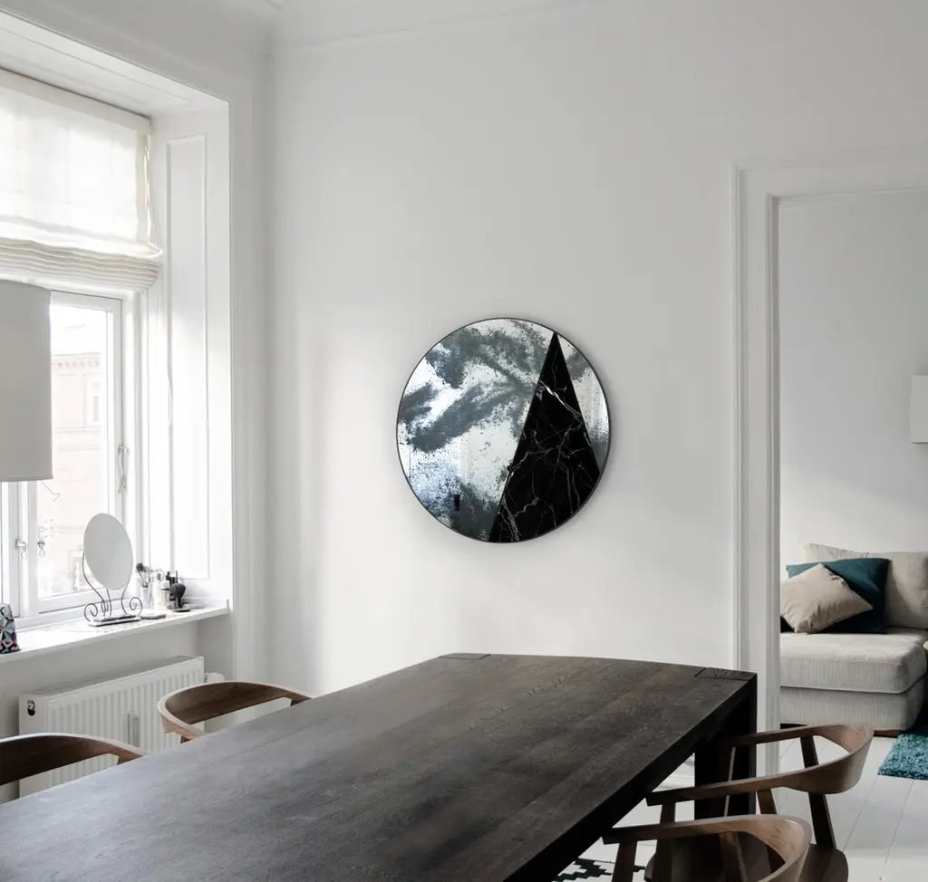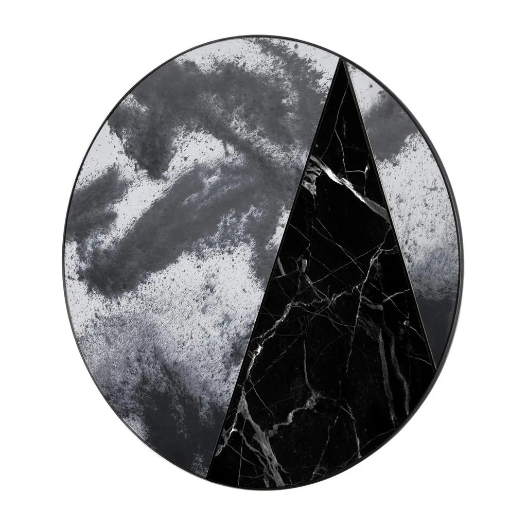 Itinera Res Lunare VCombining the stunning antique mirrors mirrored glasses with the warmth of hand finished natural materials, the Res mirrors will be an elegant presence in every environment. The harmonious neatness of the design, which is expressed with temperament and originality, surrounded by an explosion of impressive colors and patterns, results in unique pieces that will not go unnoticed. Itinera Res Lunare V D80 cmMirror by Antique MirrorMaterial inserted: Black marquinia marbleFrame: Iron steel black powder paintedThis item is entirely handmade in our factory using natural materials.Therefore each item is to be considered a uniques pieces: each small varation in color or trimming constitutes an extra value of the craftmade item.