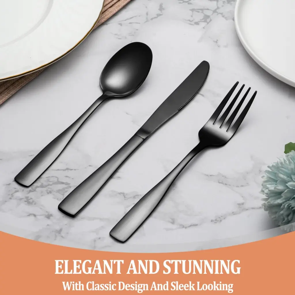 Discover this 20 - piece black silverware set perfect for 4 people. Crafted from food - grade stainless steel, it's durable, corrosion - resistant, and rust - proof. The set includes 4 dinner forks, 4 salad forks, 4 dinner spoons, 4 dessert spoons, and 4 dinner knives. Its unique black look, achieved through vacuum plating, sets it apart from ordinary silverware, creating a luxurious and elegant dining atmosphere. The ergonomic handles with appropriate weight and balance ensure comfortable use, and the smooth edges prevent scratches. It's suitable for a wide range of occasions, from home dinners to outdoor picnics. While it's dishwasher - safe, hand - washing and wiping dry before storage are recommended to maintain its quality. This set is a great addition to your kitchen, bringing convenience and style to your dining experience.