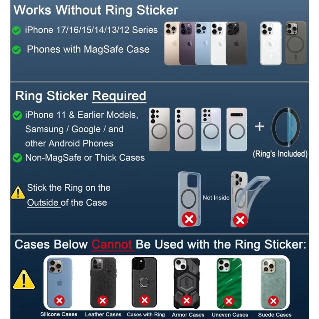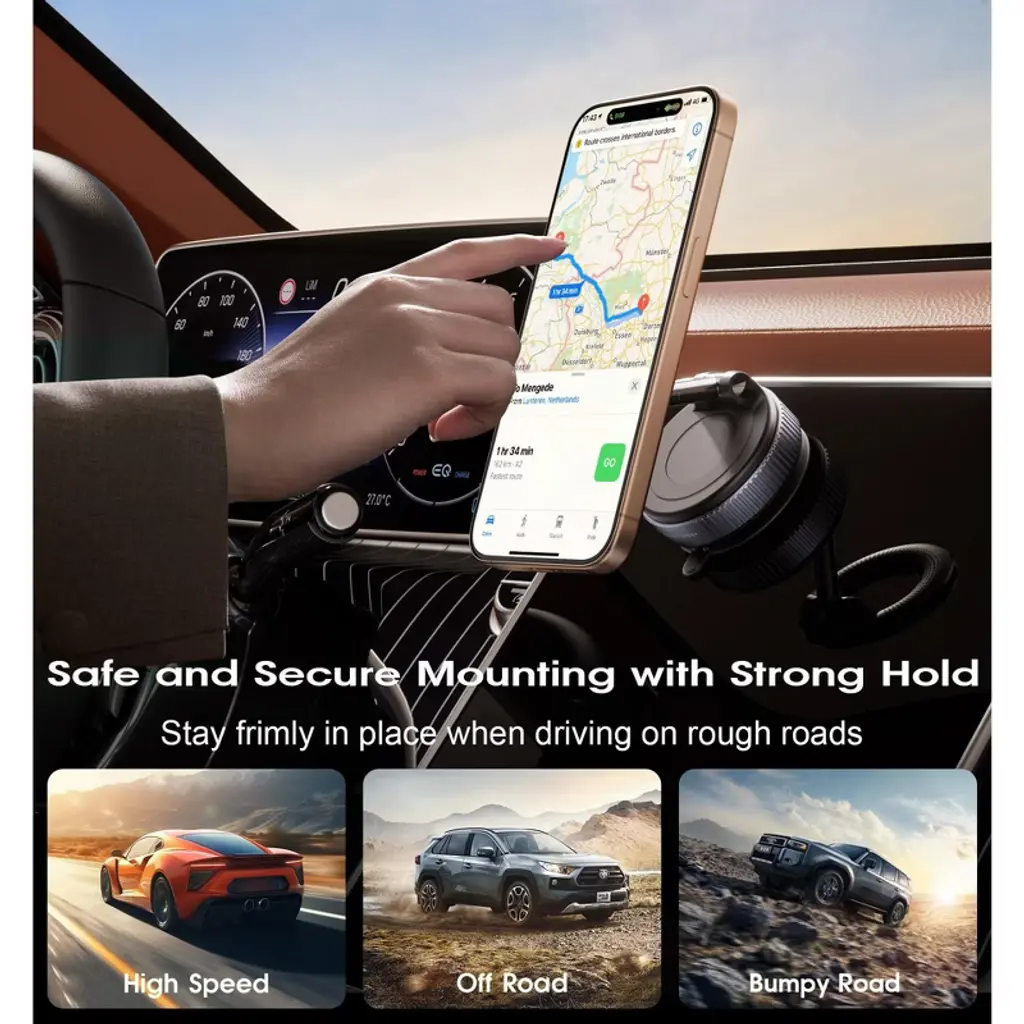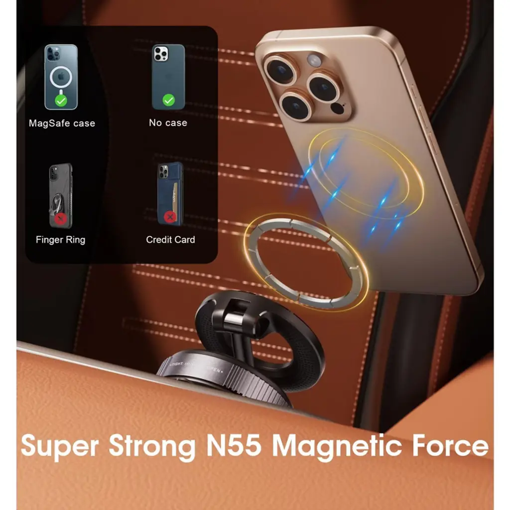Upgrade your driving experience with this 2026 upgraded vacuum magnetic car phone holder. It features a strengthened vacuum suction cup with a manual twist - lock mechanism, providing powerful and reliable suction that gets firmer while driving. Use the included adhesive pad on smooth textured surfaces and the magnetic ring for non - magnetic phones. This holder is highly versatile, suitable for various surfaces like windshields, polished metal, and smooth painted walls. It's widely compatible with MagSafe, working with a vast array of iPhone and Samsung models, as well as other smartphone brands and their magnetic cases. The 360° rotation with three - axis stable support allows for easy angle adjustment. The strong magnetic hold is signal - friendly, ensuring uninterrupted GPS and charging. With a double - coil N52 strong rubidium magnet and a 18N magnetic force, it keeps your phone firmly in place even during sudden braking. Whether you're on a short trip or a long journey, this car phone holder is a reliable choice, bringing convenience and safety to your driving.