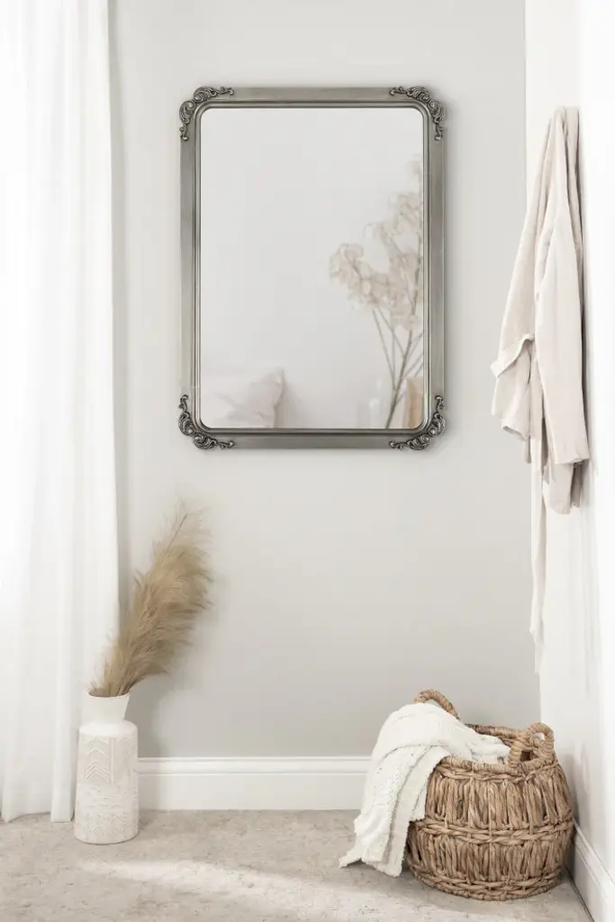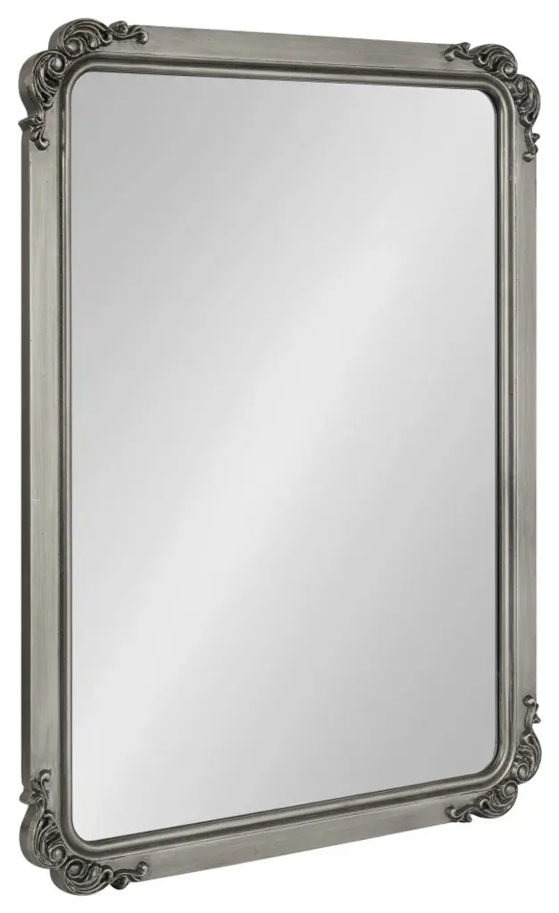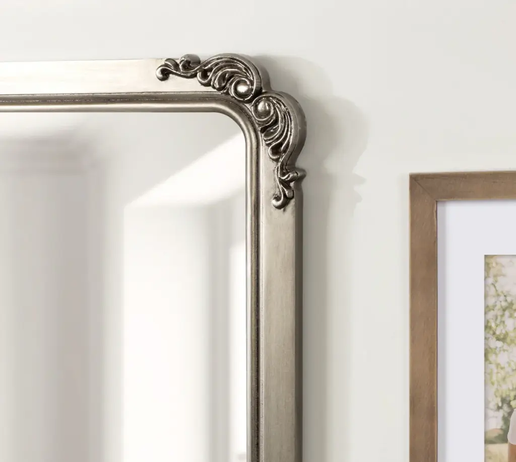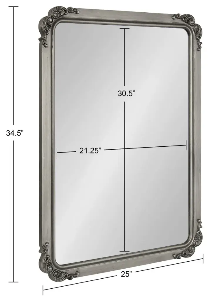 Create a space that embraces timeless glamour by including the Ivette mirror within your wall decor. Inspired by traditional baroque accents, the Ivette mirror has a classic rectangular shape with beautiful garland detailing draped across each corner. The Ivette''s frame is made from a lightweight blend of wooden material, with a beautiful chrome silver finish to enhance its overall look. This edition of the glamorous Ivette is 25 inches wide by 1.25 inches deep by 34.5 inches tall, making it perfect for your living room, entryway, or bedroom decor. This accent piece also hangs vertically and horizontally to work with the space within your home, fitting on different walls throughout your home. D-ring hangers are attached to the back of the frame in both orientations to ensure a straightforward installation process. The reflective surface is also 21.25 inches by 30.5 inches, enhancing the brightness and dimension of your space by reflecting light sources. Use this lovely mirror to create a captivating focal point or even bathroom decor or a vanity mirror in your master bath.• Traditional Glam: The timeless and glamorous Ivette mirror sets the tone of your elegant room scene, with a lovely rectangular mirror and ornate, baroque-style garland detailing on each corner• Glamorous Finish: This edition of the Ivette wall mirror is the perfect way to add a vibrant theme to your living room, bedroom, or bathroom, with a stunning silver finish on its stylish frame• Large Size: The overall dimensions of this mirror is 25 inches wide by 1.25 inches deep by 34.5 inches tall, creating a staggering piece of home decor that works in various spaces• Versatile: To create versatility and flexible styling throughout your home, our Ivette mirror hangs vertically and horizontally to fit on multiple walls throughout your home• Easy to Hang: Each of the Ivette mirrors in this collection comes with metal D-ring hangers attached to the back, creating a versatile and easy-to-hang accent that''s ready in minutes