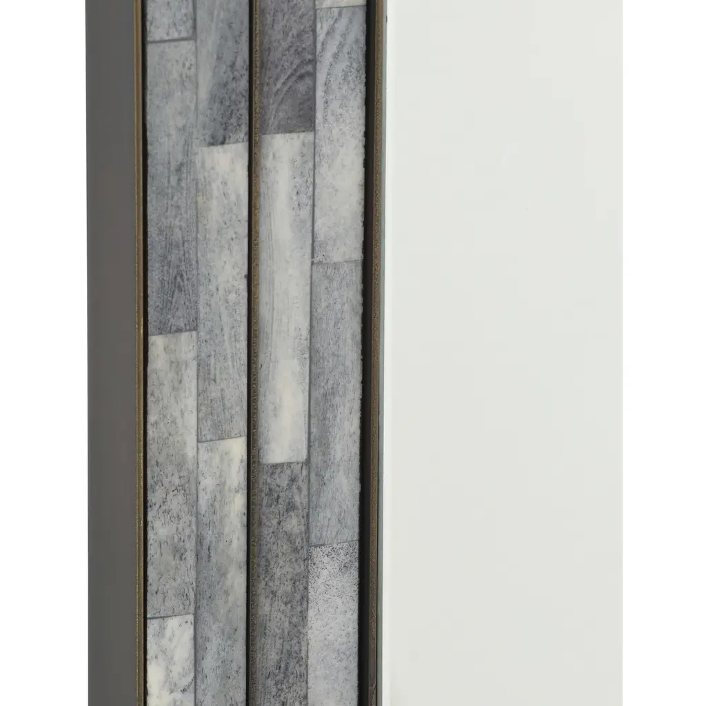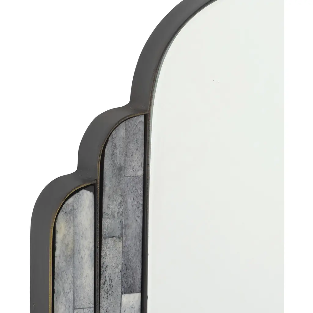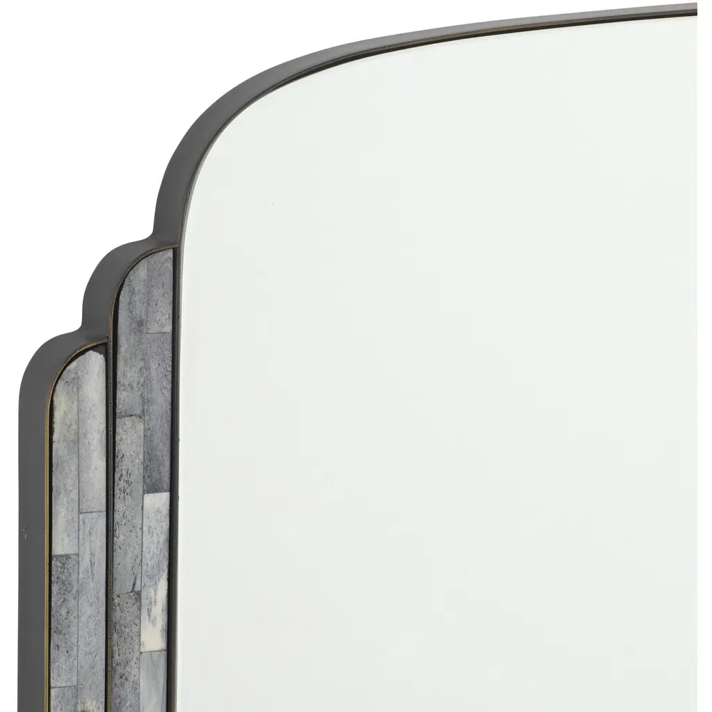 A modern twist on classic Art Deco styling. Tiles of inlaid gray bone give a naturalist accent to a streamlined frame of bronze iron. The layered shape is offset with a plain glass mirror. Designed to be displayed horizontally or vertically by a back cleat. Hanging hardware included. Finish will vary.