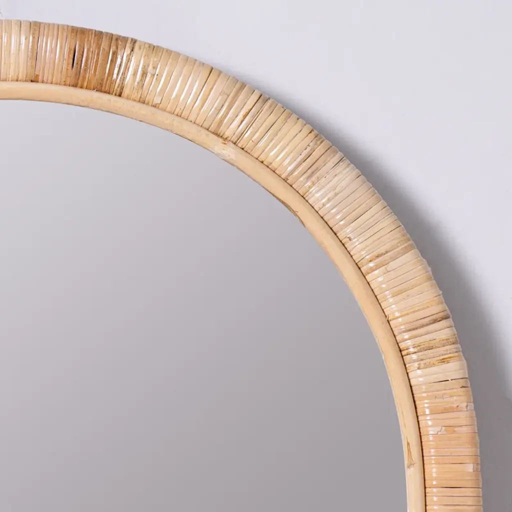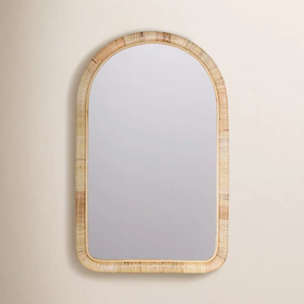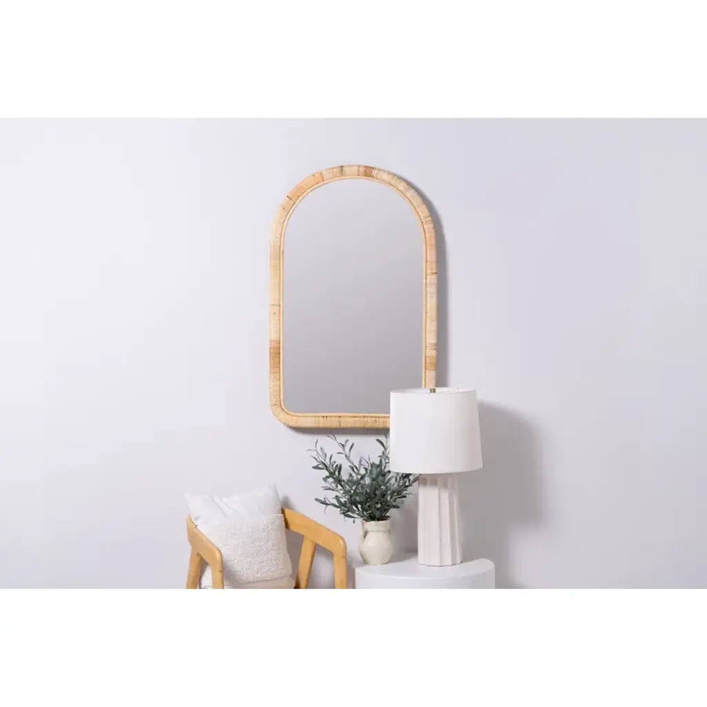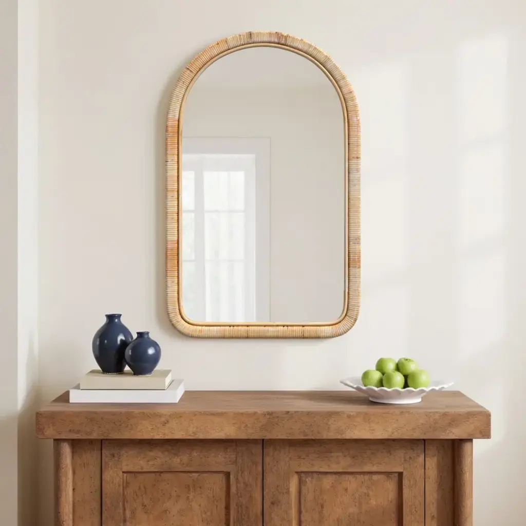 Put the finishing touch on your coastal decor with this breezy and natural wall mirror. The arched frame is wrapped with rattan, and it showcases a light brown finish for an organic look and feel. Enjoy the warmth and texture of this welcoming and relaxing design anywhere in the home, including bathrooms, without the worry of moisture. The mirror has a 1" bevel and is surrounded by a complementary thin frame liner. Use it to open up any room and let the light bounce around. May be hung either vertically or horizontally.
