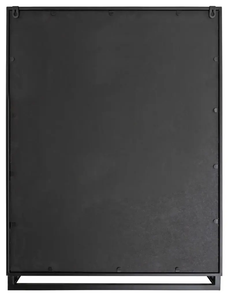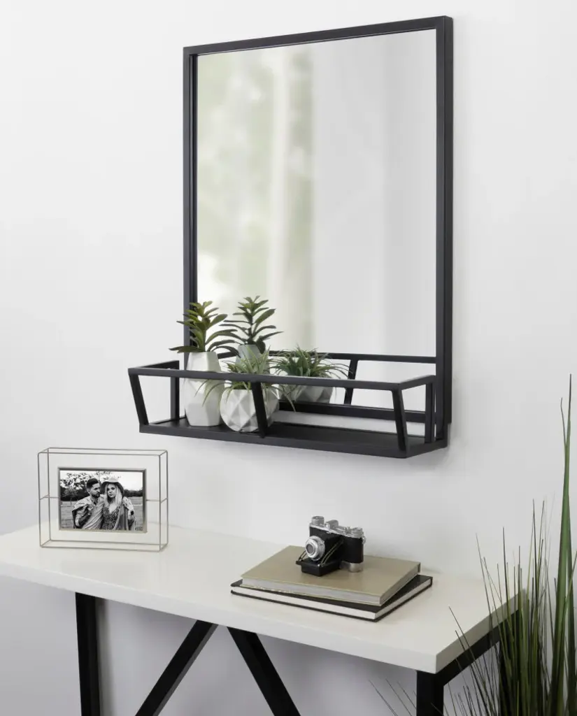 The modern, sharp design and clean lines of this beautiful wall mirror is an excellent way to craft a functional, contemporary decor space in your home. The Jackson wall mirror has a metal, minimalist frame with an inset mirrored surface and a wooden wall shelf. The overall display dimensions of this modern mirror are 29 inches tall by 22 inches wide. The attached, functional shelf is is 5 inches deep and 22 inches wide, providing you with plenty of space to store and display small items like lotion, soap, toothbrushes, small succulents, and more. Use this mirror as a lovely bathroom vanity mirror, or as a functional accent in any modern living room, bedroom, bathroom, entryway, or dining room. Installing a mirror as decor in your home opens up your space by spreading light and creating more dimension within your smaller spaces. Hanging the beautiful Jackson wall mirror takes only a matter of seconds with convenient metal eyelet hangers securely attached to the back of the frame.• MODERN DESIGN: The Jackson wall mirror presents your home with a resilient, lovely accent that features a rectangular shape and a contemporary solid black finish• QUALITY MATERIALS: Decorate your home with a resilient accent piece that has an all-metal frame with a mirrored surface and a wooden shelf • LARGE SIZE: The overall display dimensions of this mirror is 29 inches tall by 22 inches wide by 7.5 inches deep for a bold, dimensional accent that draws the eye• FUNCTIONAL SHELF: Our Jackson wall mirror features a lovely wooden shelf that is 5 inches deep for small lotions, succulents, toothbrushes, and more• EASY TO HANG: Install your Jackson mirror in a matter of minutes with convenient metal eyelet hangers