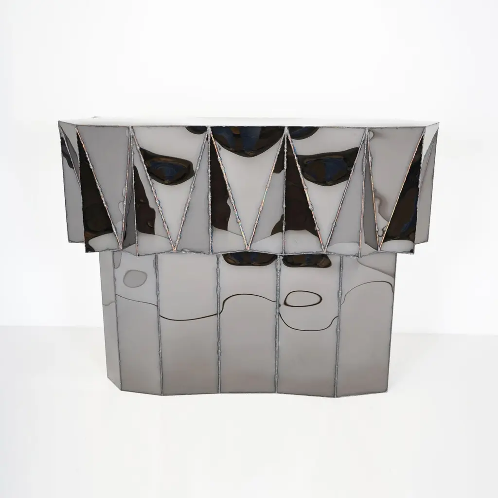 Jagged Edge Console in Welded Mirror-Polished Stainless Steel by Julian MayorLimited Edition of 8 + 4AP.Dimensions: D 30 x W 118 x H 89 cm. Materials: Mirror-polished stainless steel.Julian Mayor is a British artist and designer renowned for his sculptural works crafted from welded sheet metal. Using high-tech design processes, the artist creates each piece digitally on a computer before building it by hand in his workshop. Born in 1976, Mayor graduated with a BA in Industrial Design from the University of Northumbria in 1998, followed by an MA from the Royal College of Art in Design Products under Ron Arad. After graduating in 2000, he moved to Northern California and worked for a design consultant agency as a product and interior designer. By 2004, Mayor returned to London to work for UK-based agencies, including Pentagram, and collaborated with British designer Tom Dixon. The artist’s work has been exhibited at the Victoria & Albert Museum, London, the Museum of Arts and Design, New York, MUDAC Lausanne, Switzerland, and the Yorkshire Sculpture Park, UK. He has installed a permanent series of sculptural benches in a park behind the Tate Britain in Pimlico, London. Mayor lives and works in Doncaster, South Yorkshire, UK.