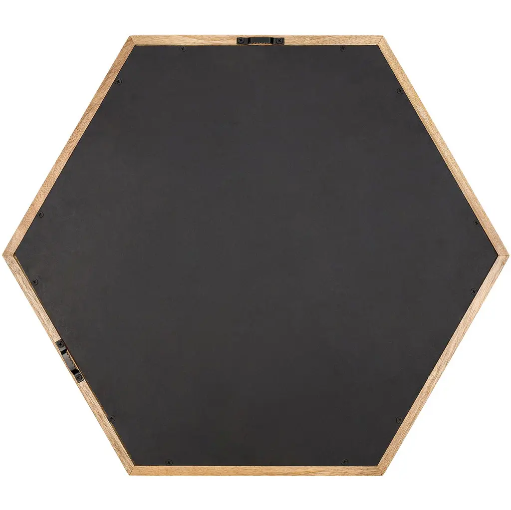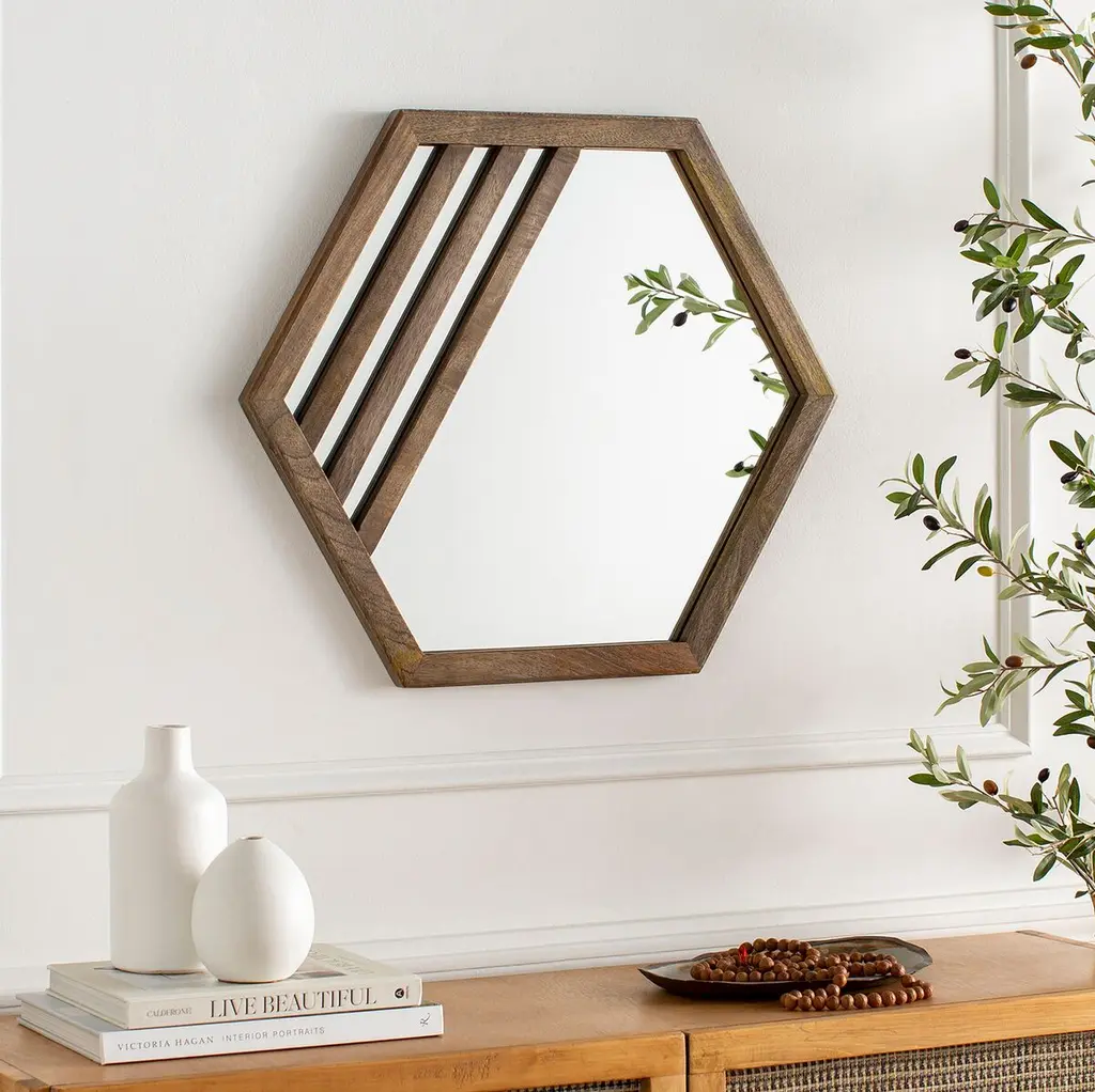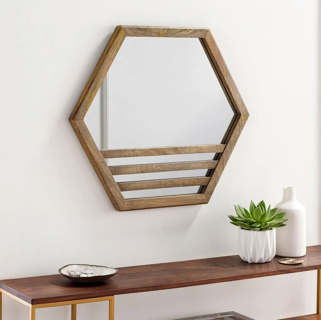 Three wood slats emphasize both the sleek hexagonal shape and the warm finish of this wall mirror's frame.