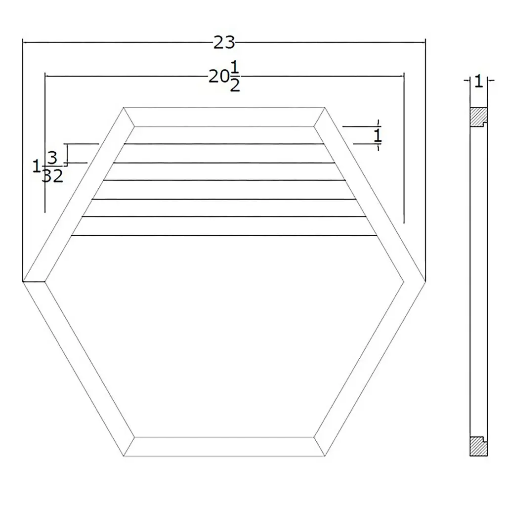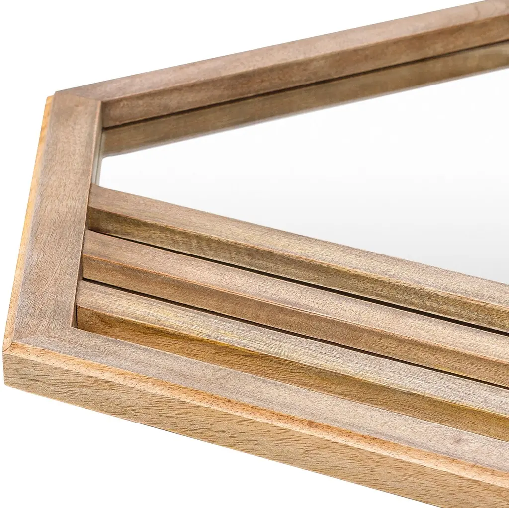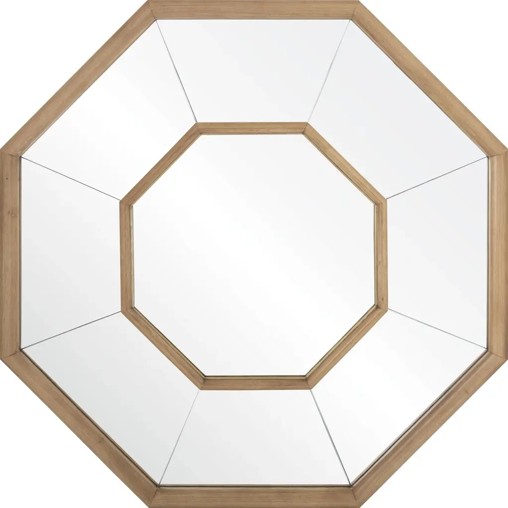 Three wood slats emphasize both the sleek hexagonal shape and the warm finish of this wall mirror's frame.