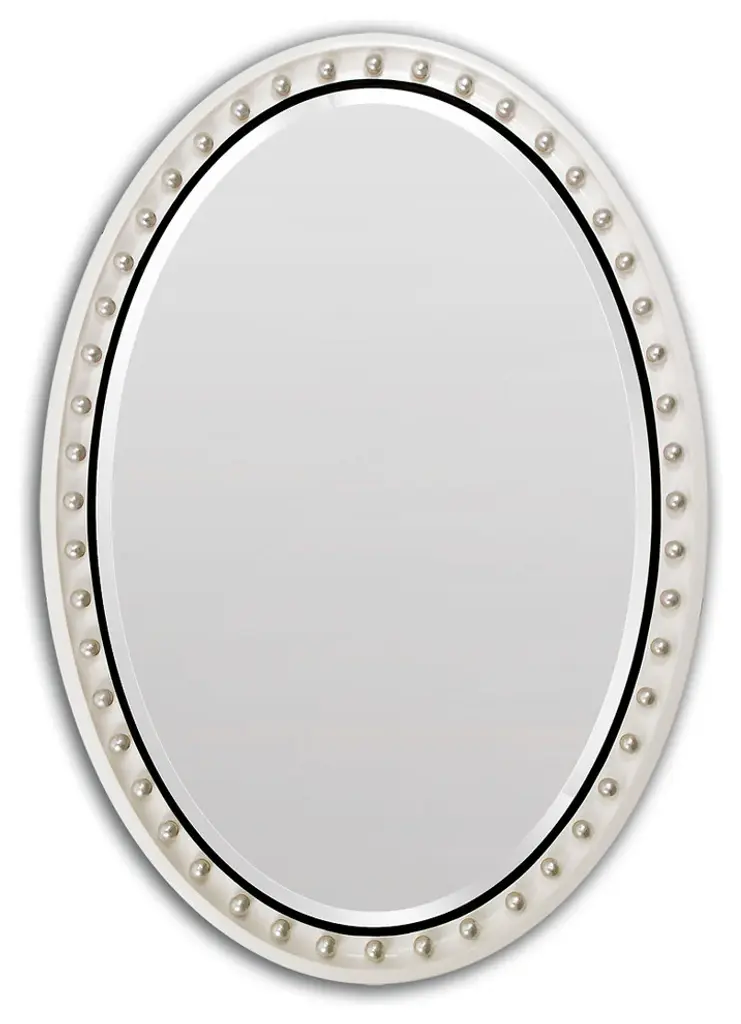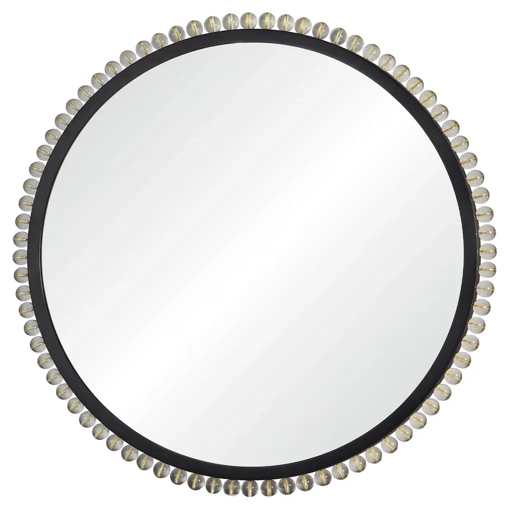 This uniquely-crafted mirror by Jamie Drake for Mirror Home will add high style to any space. Hand welded stainless steel frame finished in black or polished nickel and surrounded by acrylic spheres attached by brass hardware. Non-beveled center mirror. Cleat hardware provided.